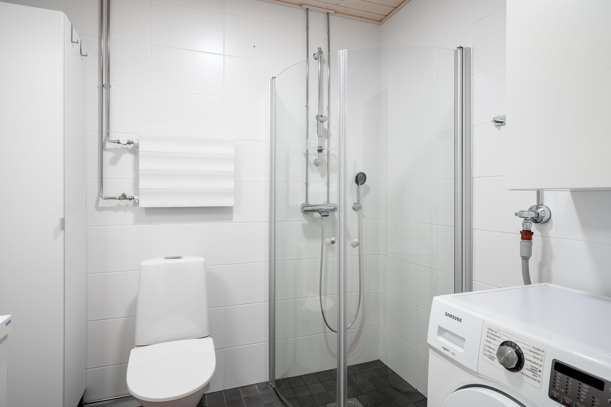 Makuuhuone on erotettu kahdella liukuovella, jotka antavat avaruutta ja säilyttävät lattiatilan käytännöllisenä. Yksi seinä on täynnä kaapistoa. Kylpyhuoneesta löytyy kaikki tarvittava, suihku ja pyykinpesuhuoltotila, sekä hyvin säilytystilaa.