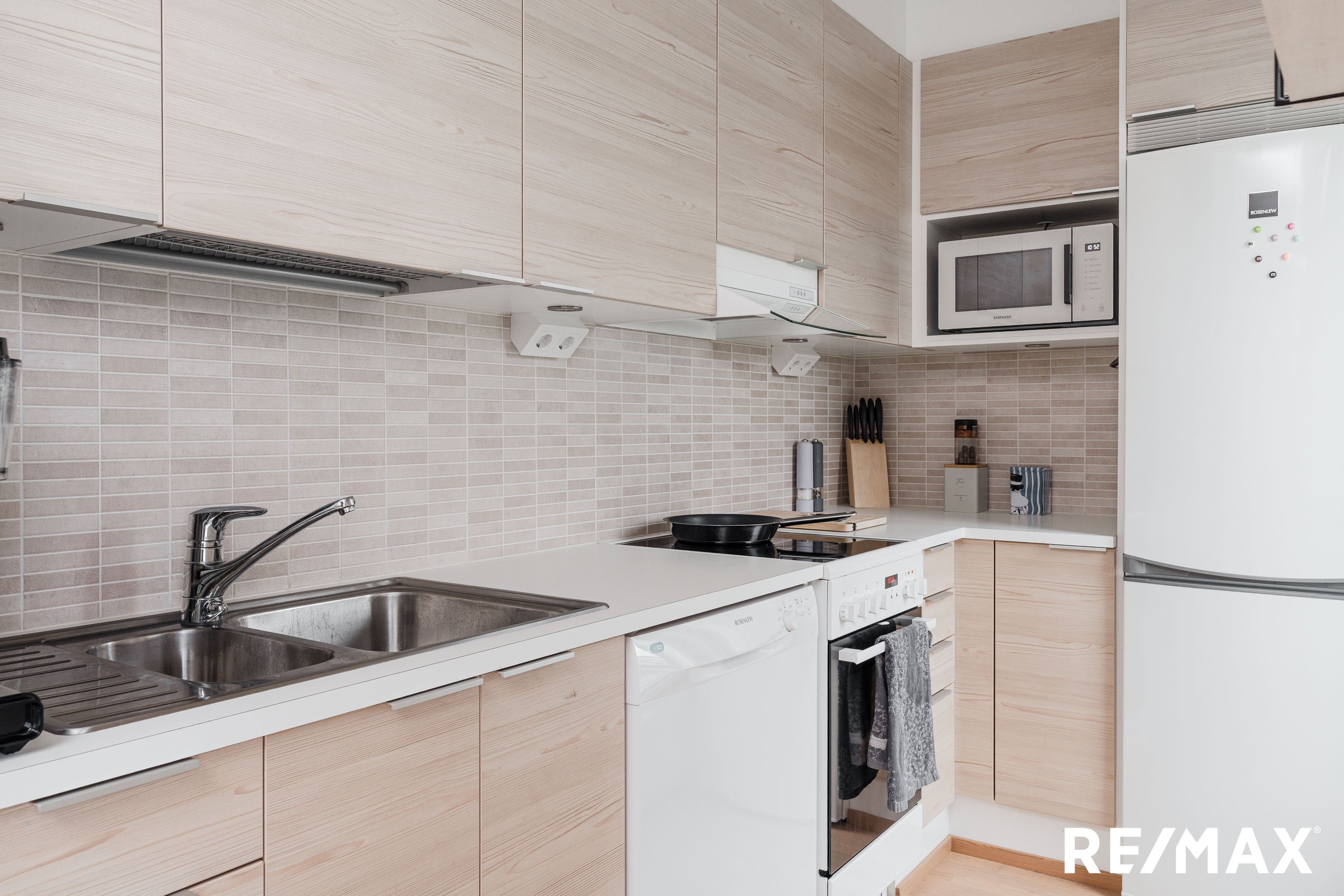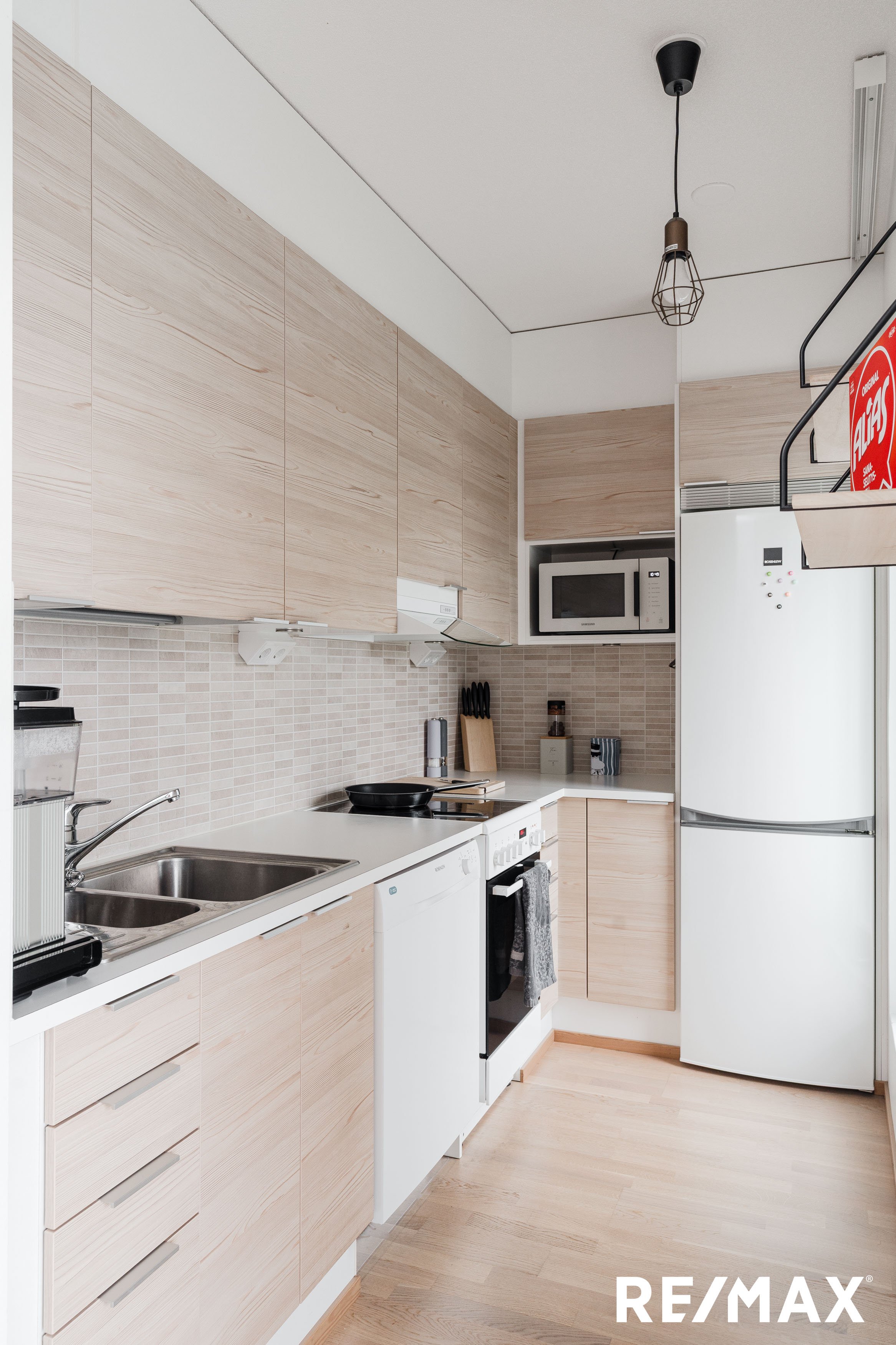 Olohuoneen yhteydessä on moderni keittiö, jossa on kaikki tarvittavat varusteet.