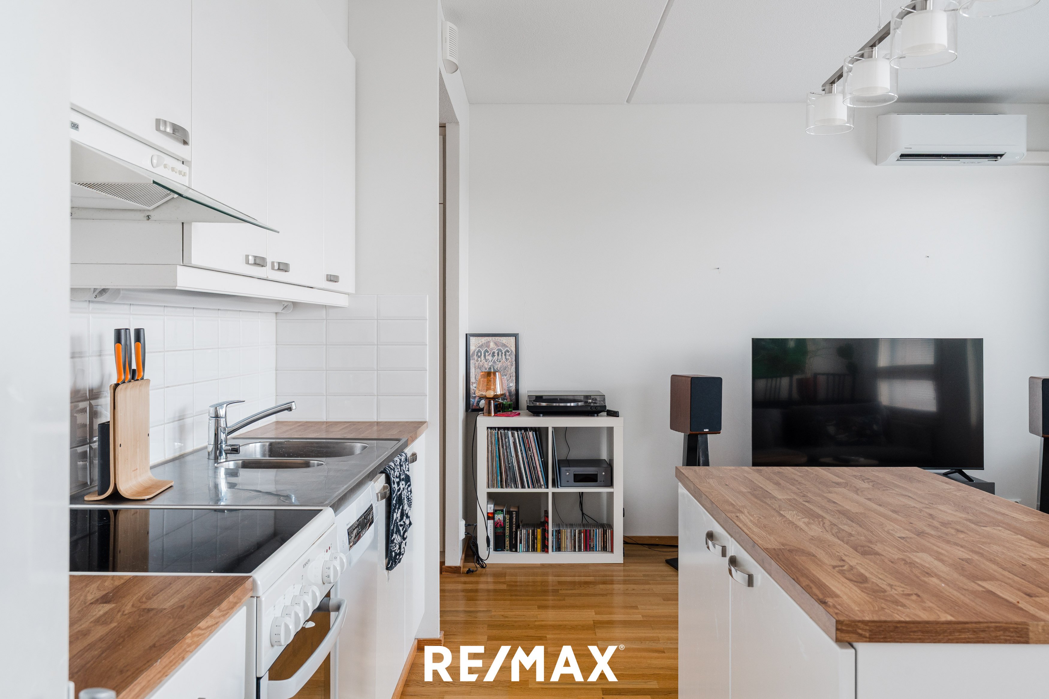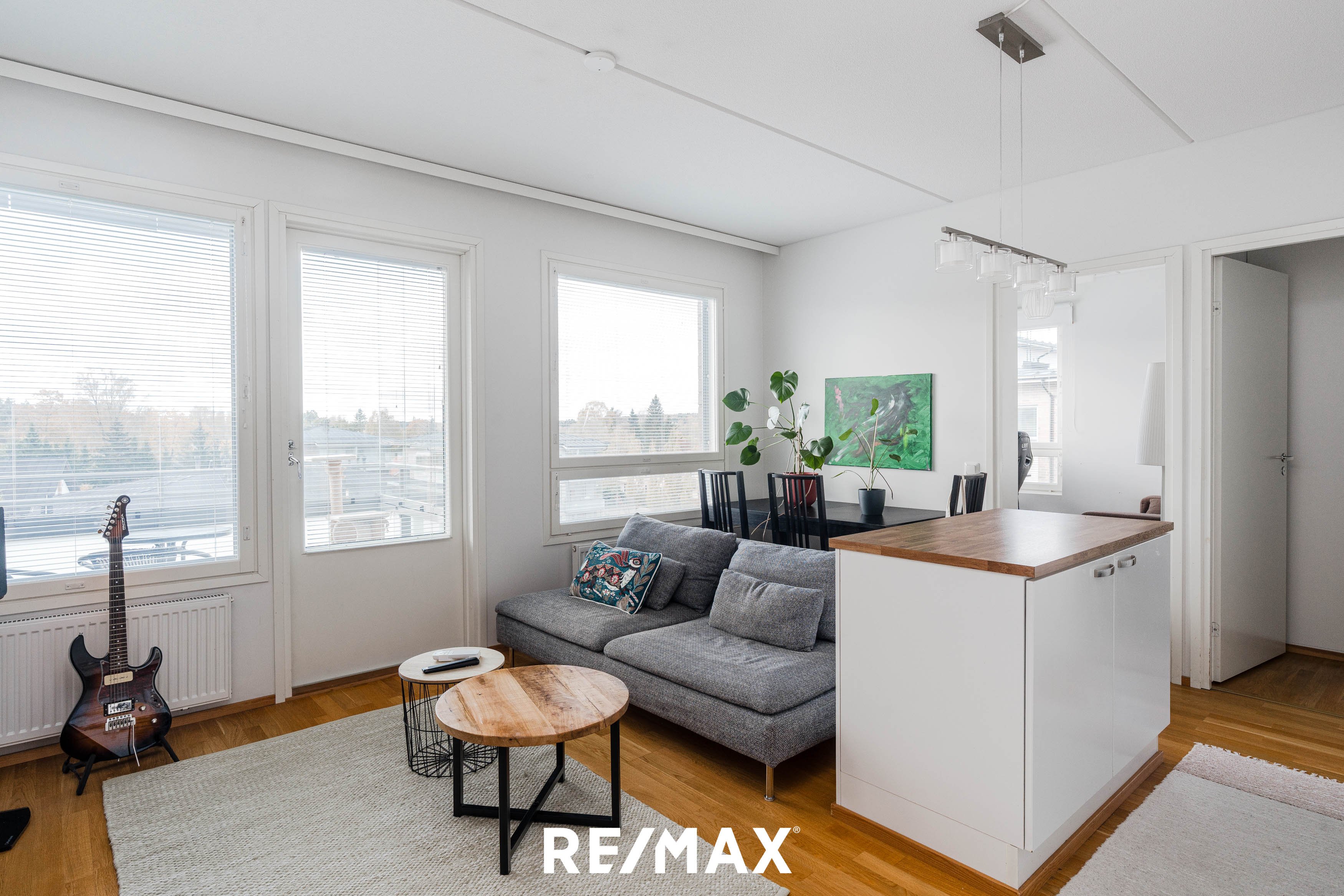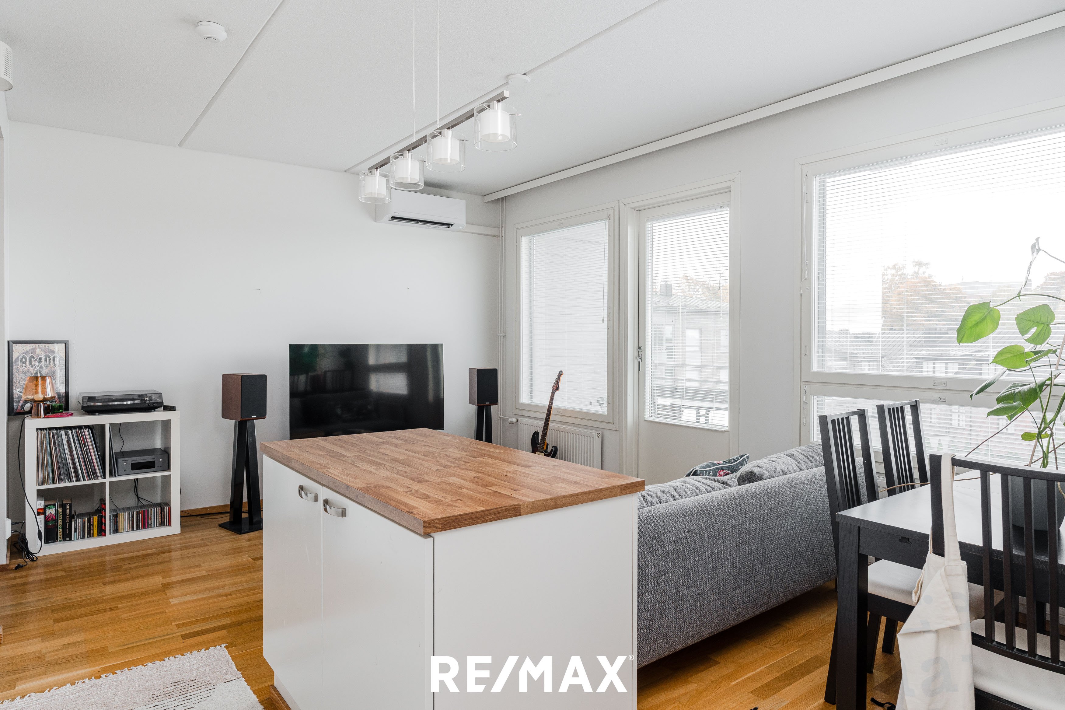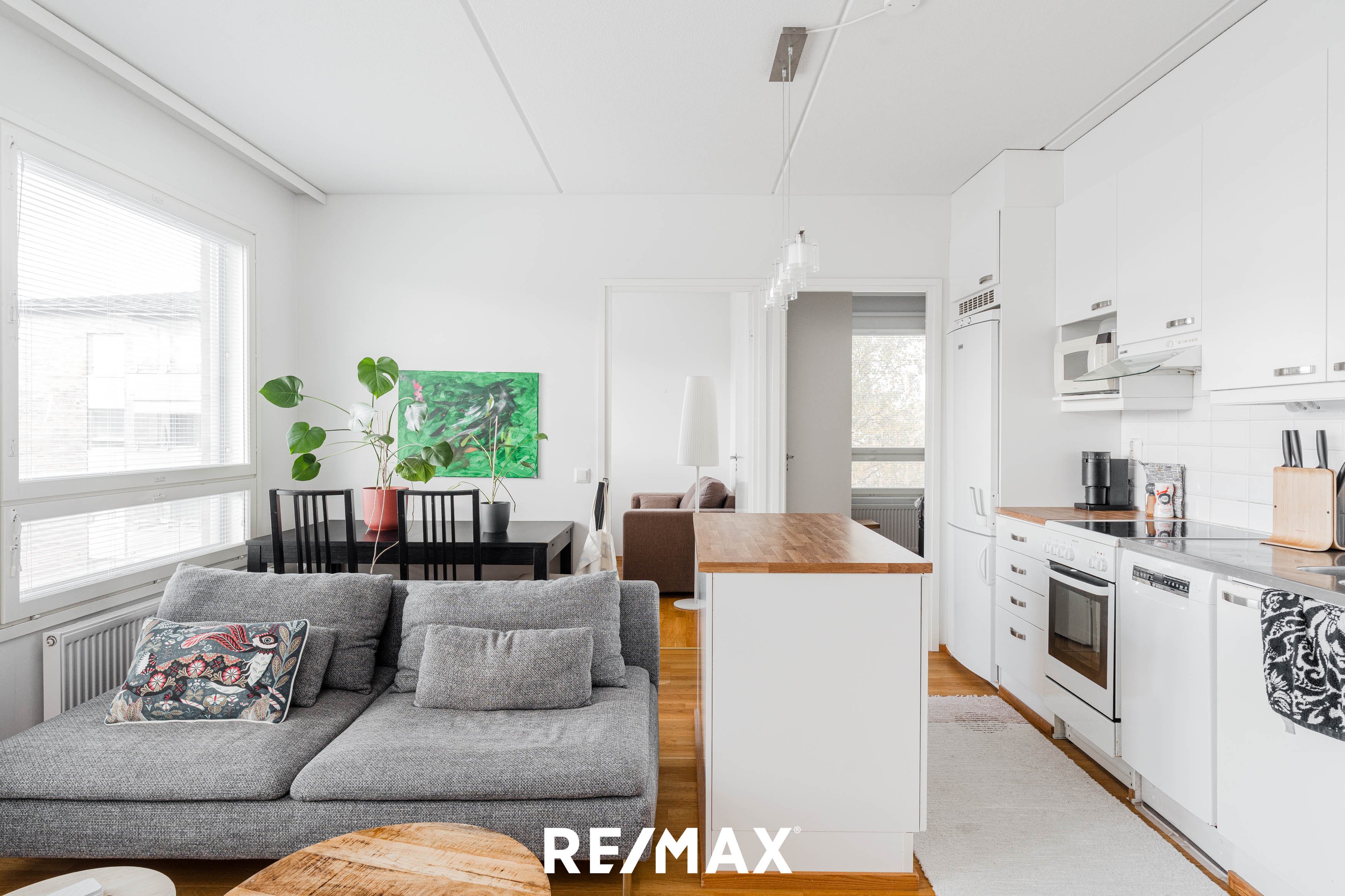 Olohuoneen ja keittiön yhtenäinen tila luo avaruutta ja mahdollistaa mukavat hetket perheen tai ystävien seurassa.