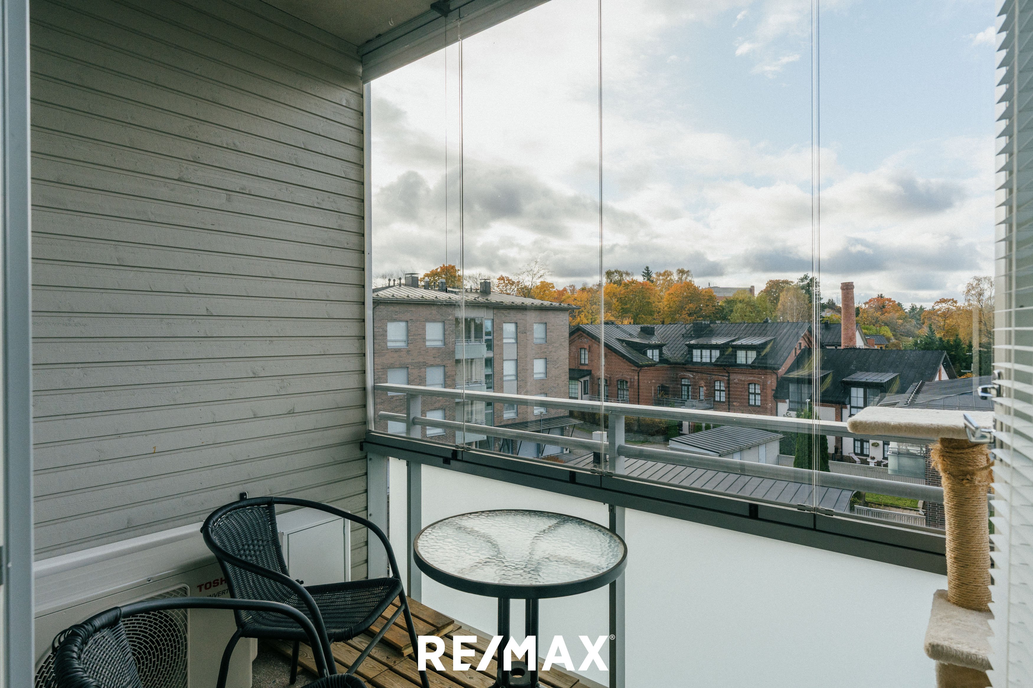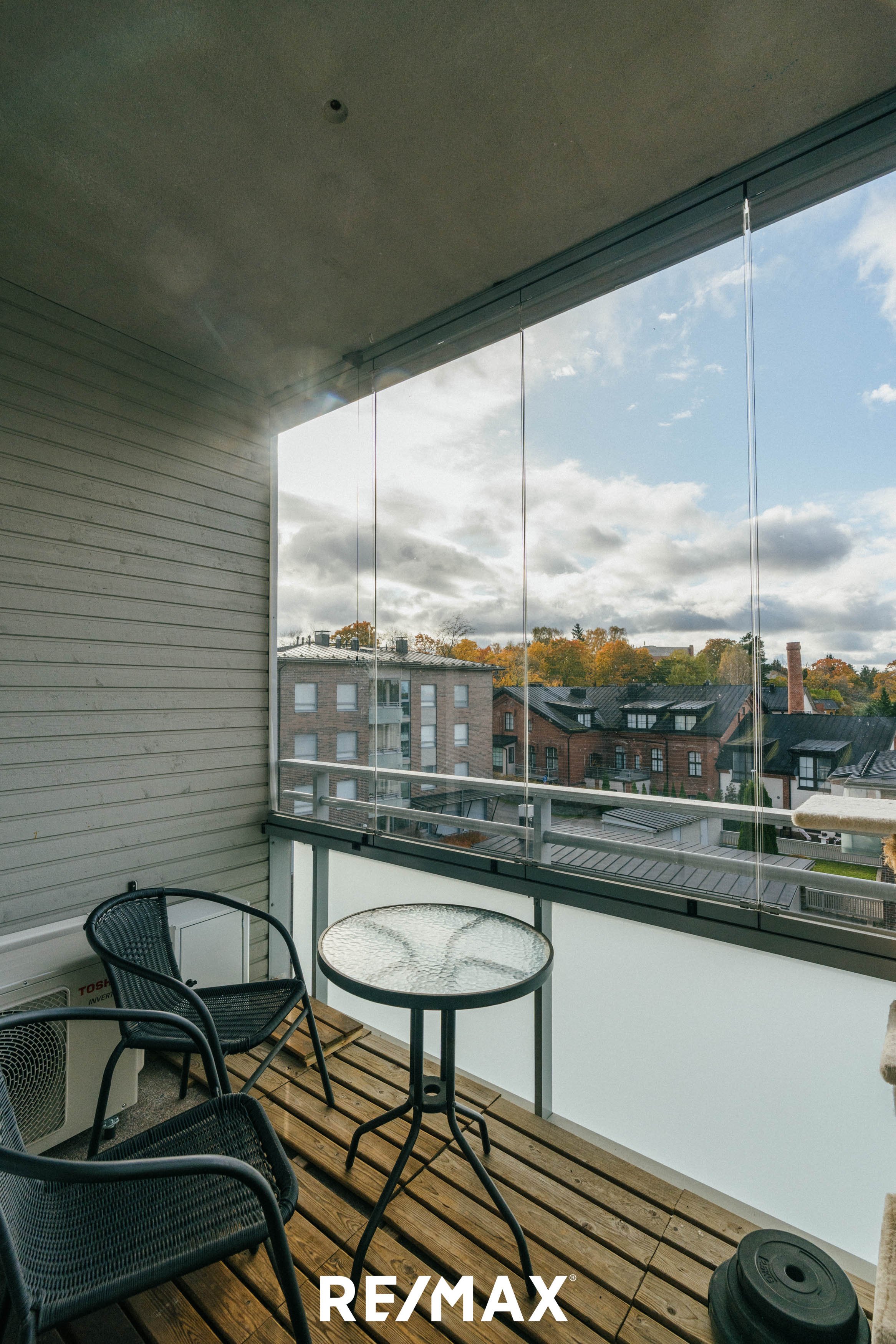 Asunnon parveke on lasitettu, mikä pidentää sen käyttöaikaa keväästä syksyyn.