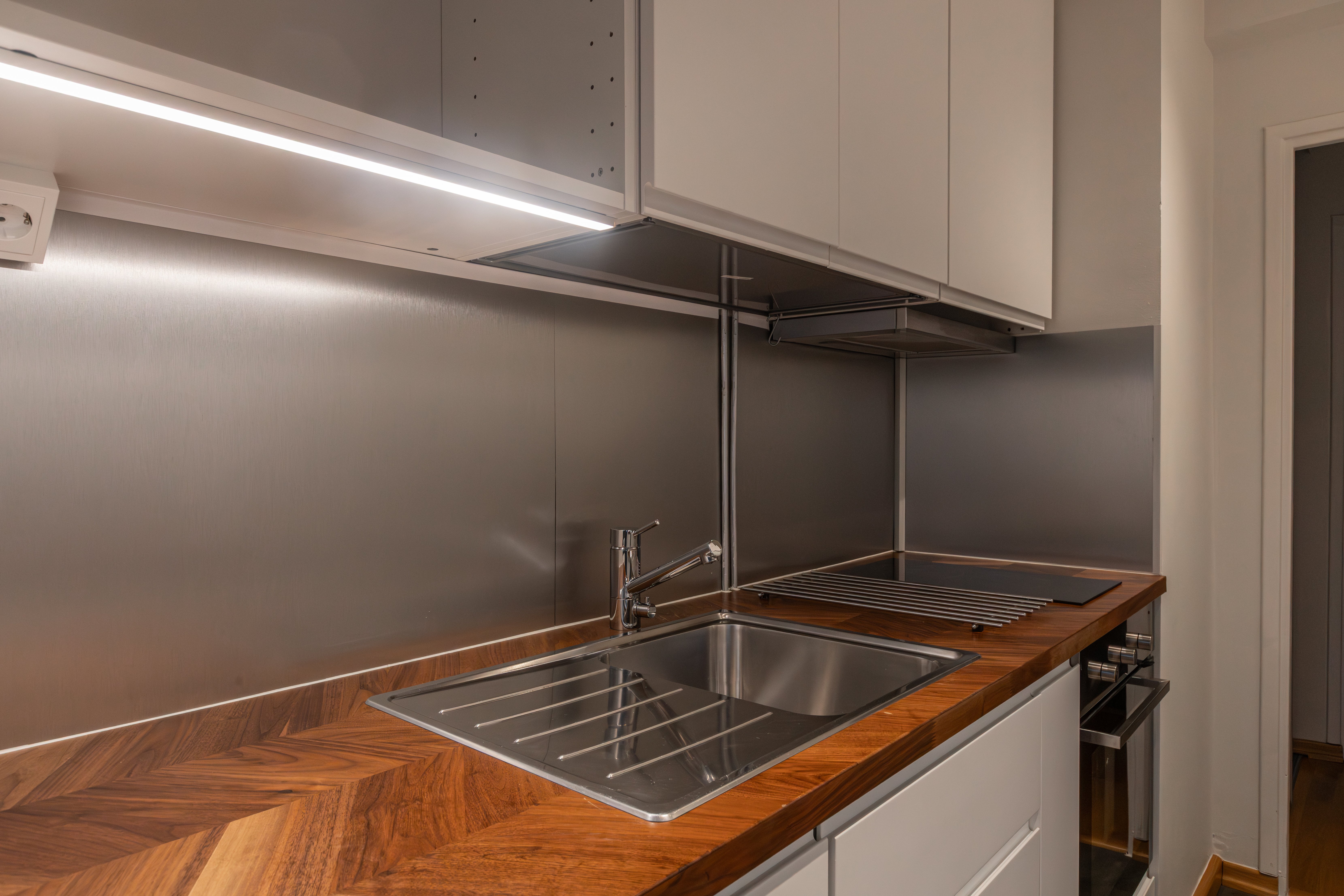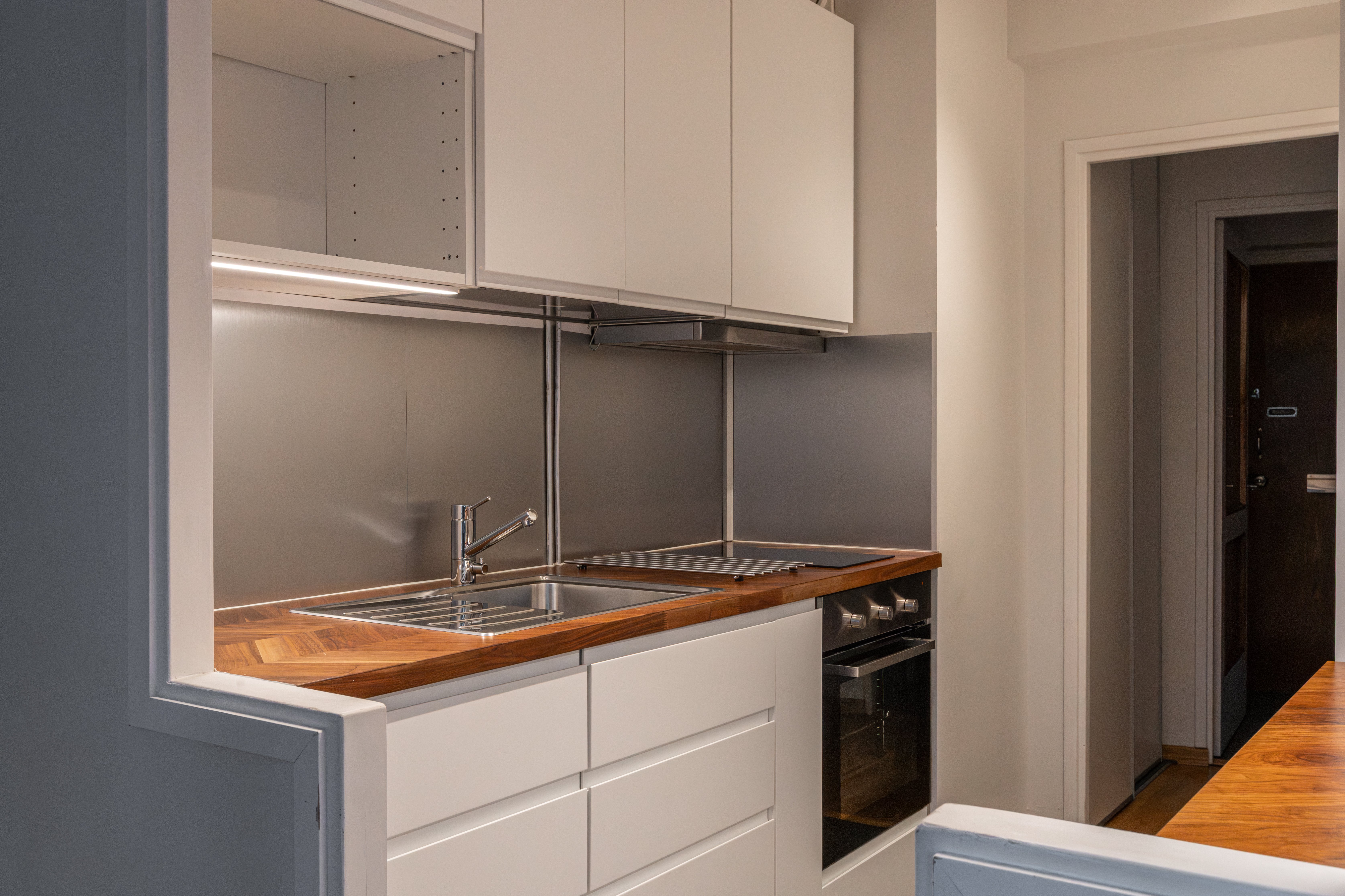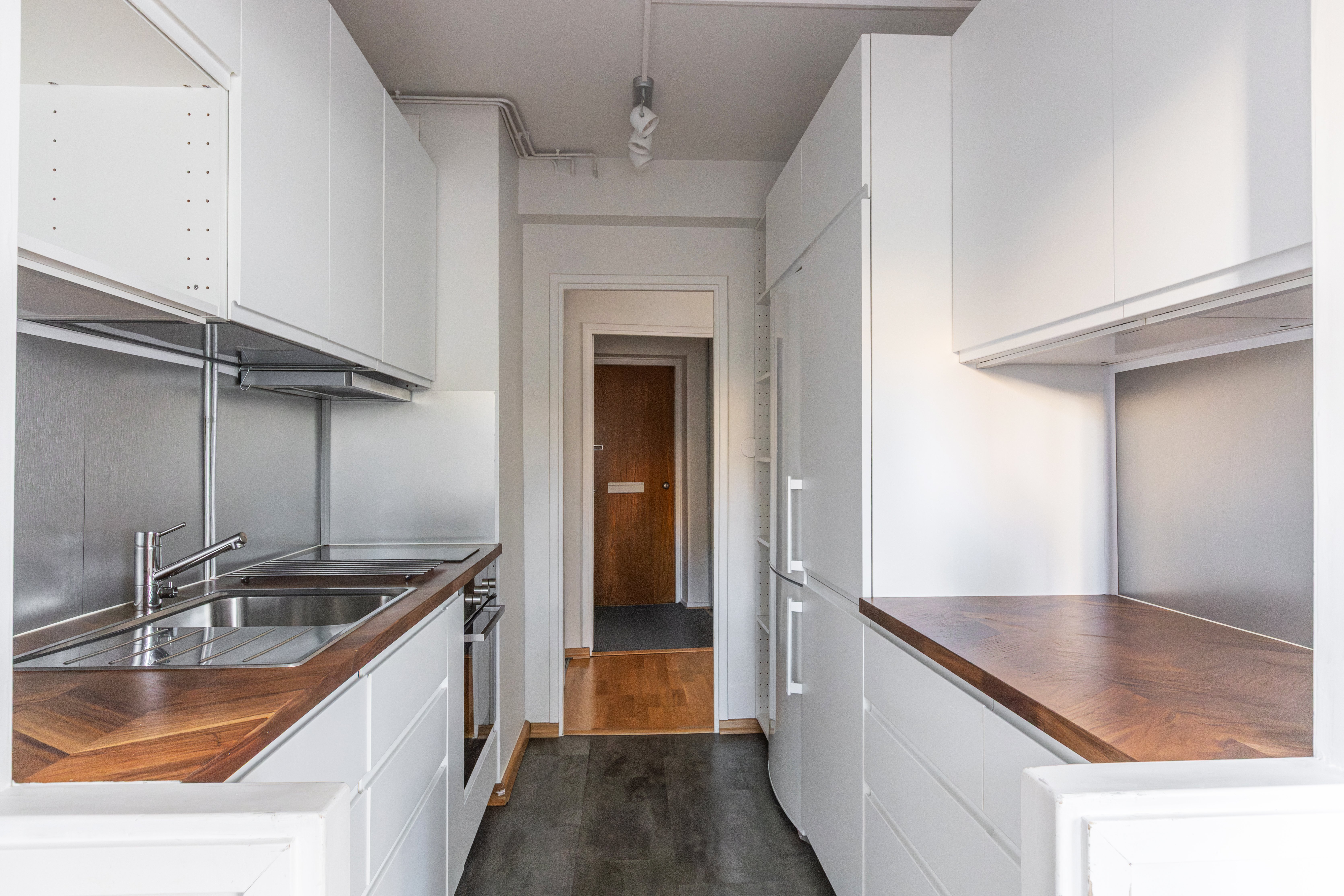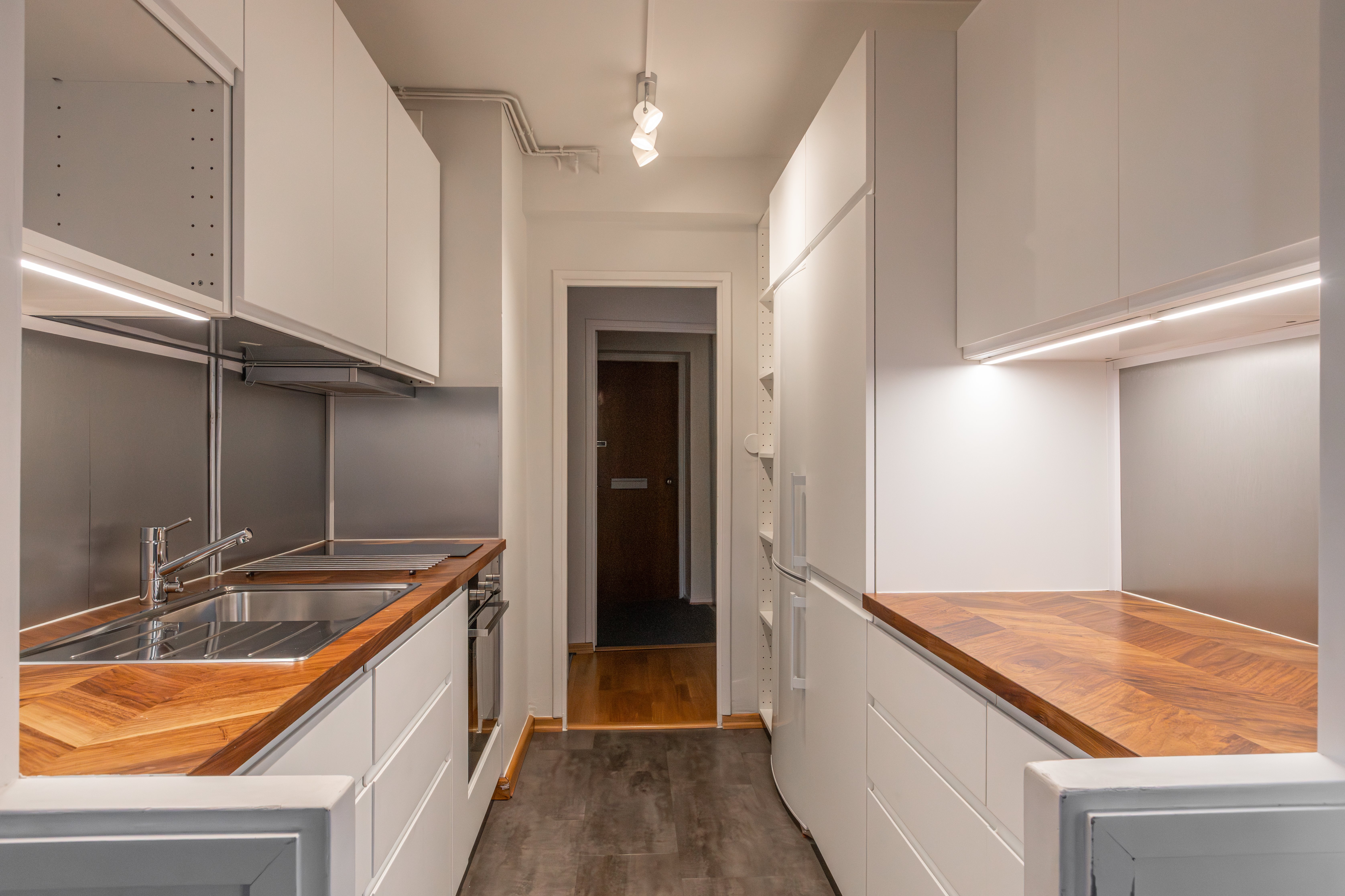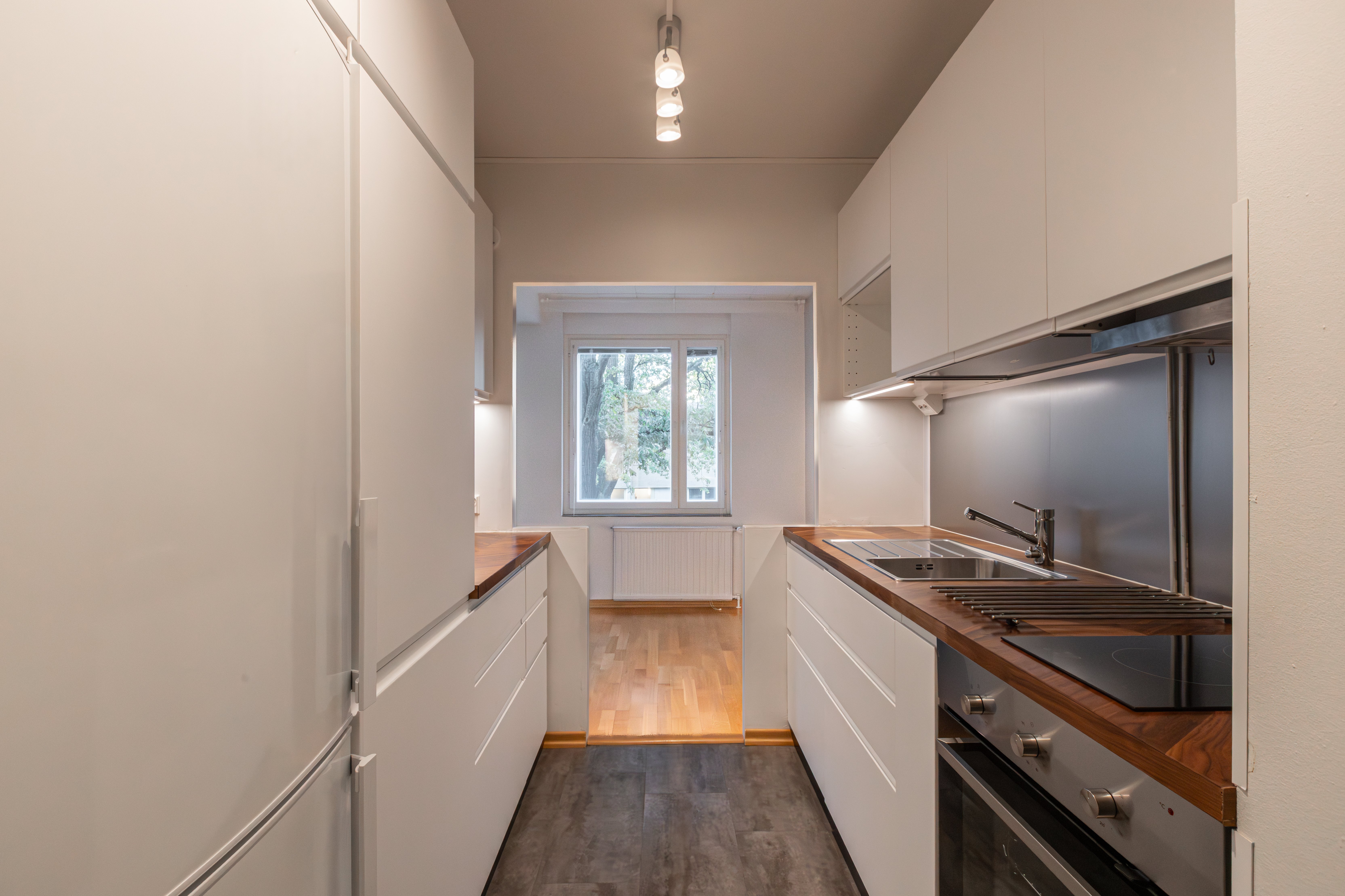 Keittiö on remontoitu vuonna 2017 ja varustettu nykyaikaisilla kodinkoneilla, kuten integroidulla astianpesukoneella ja induktioliedellä.