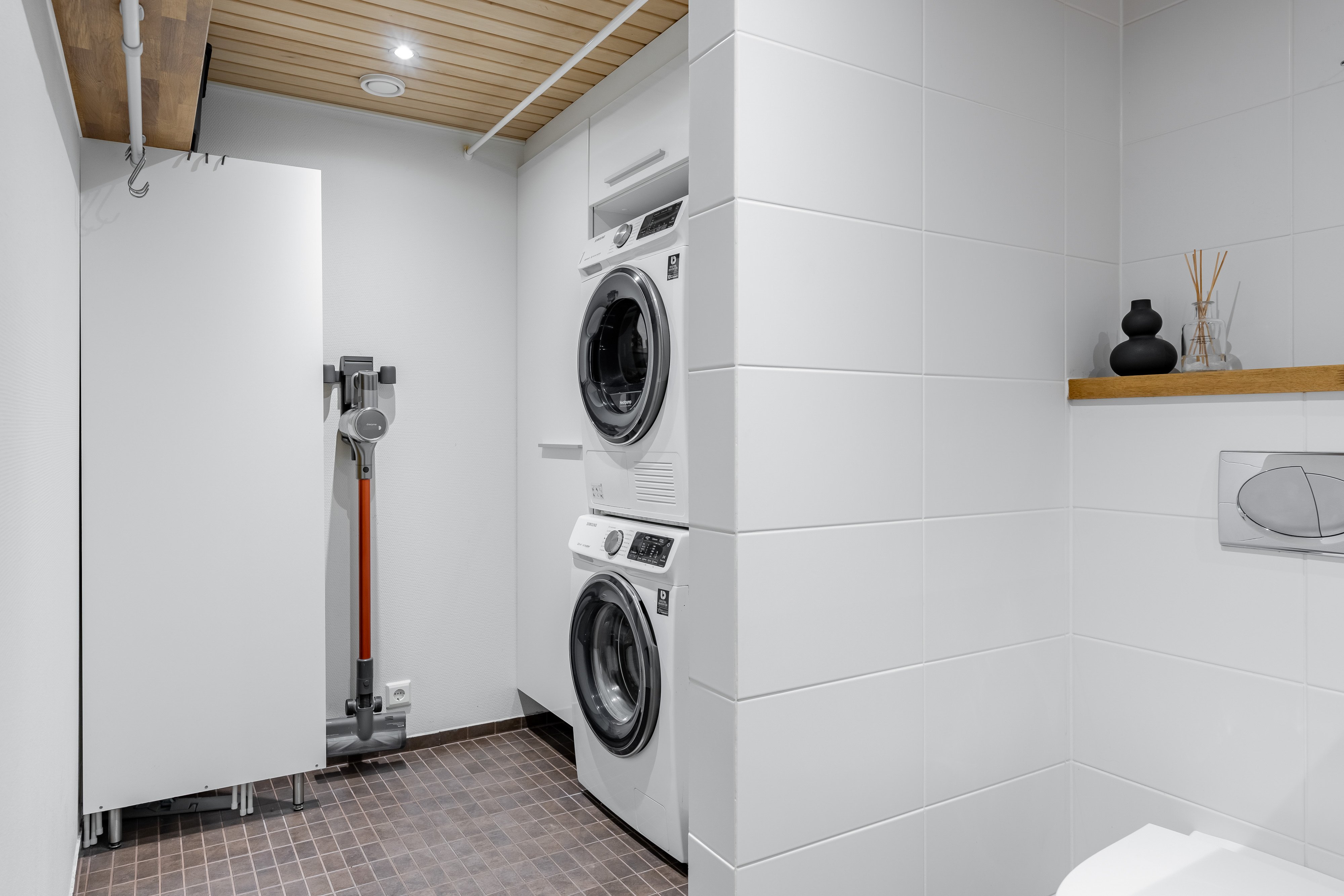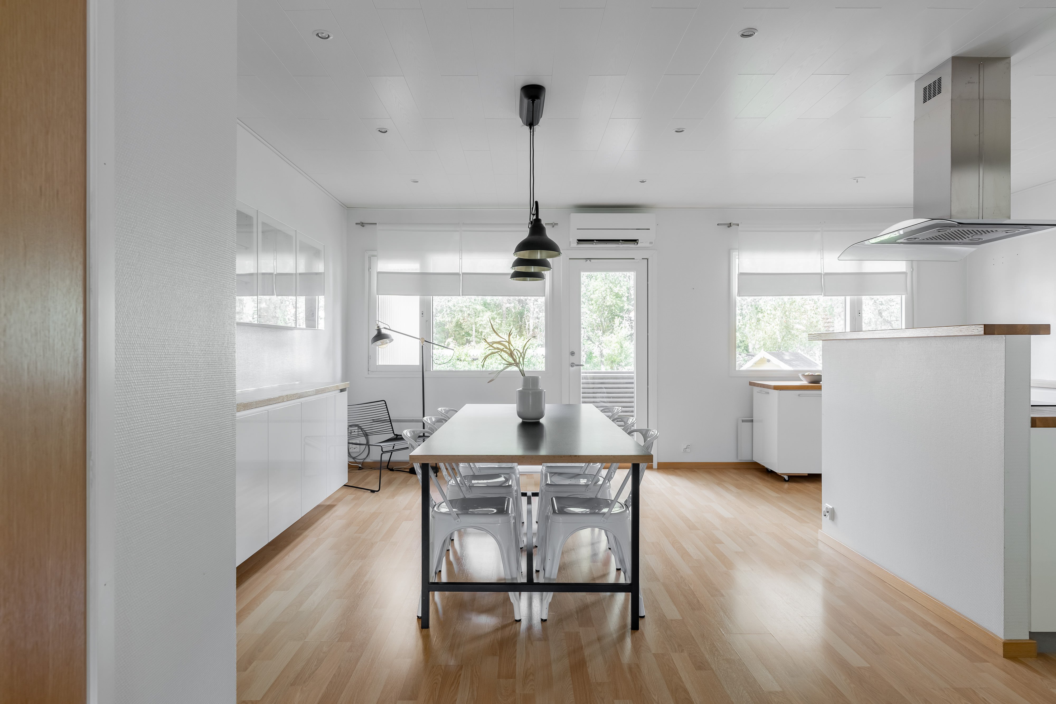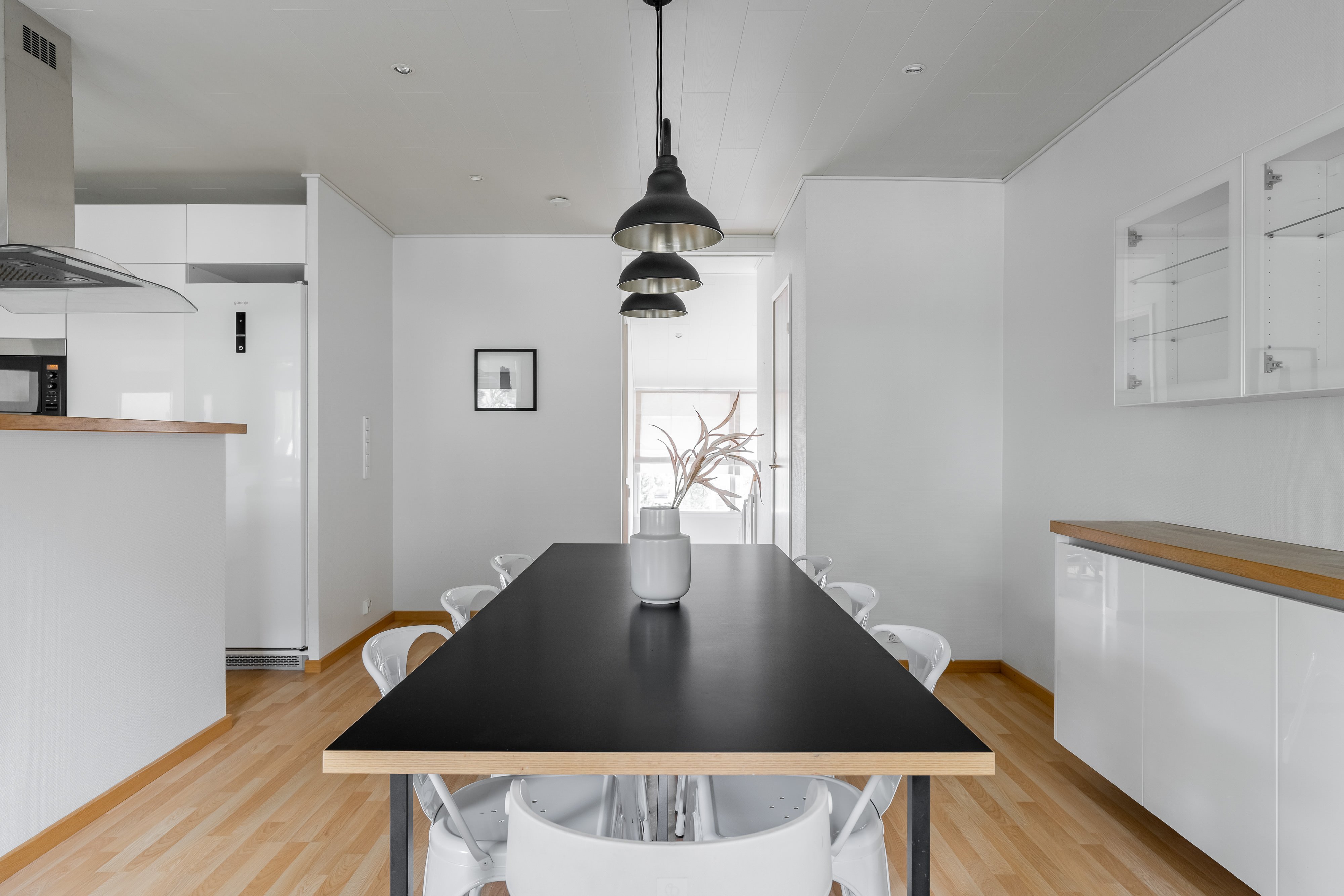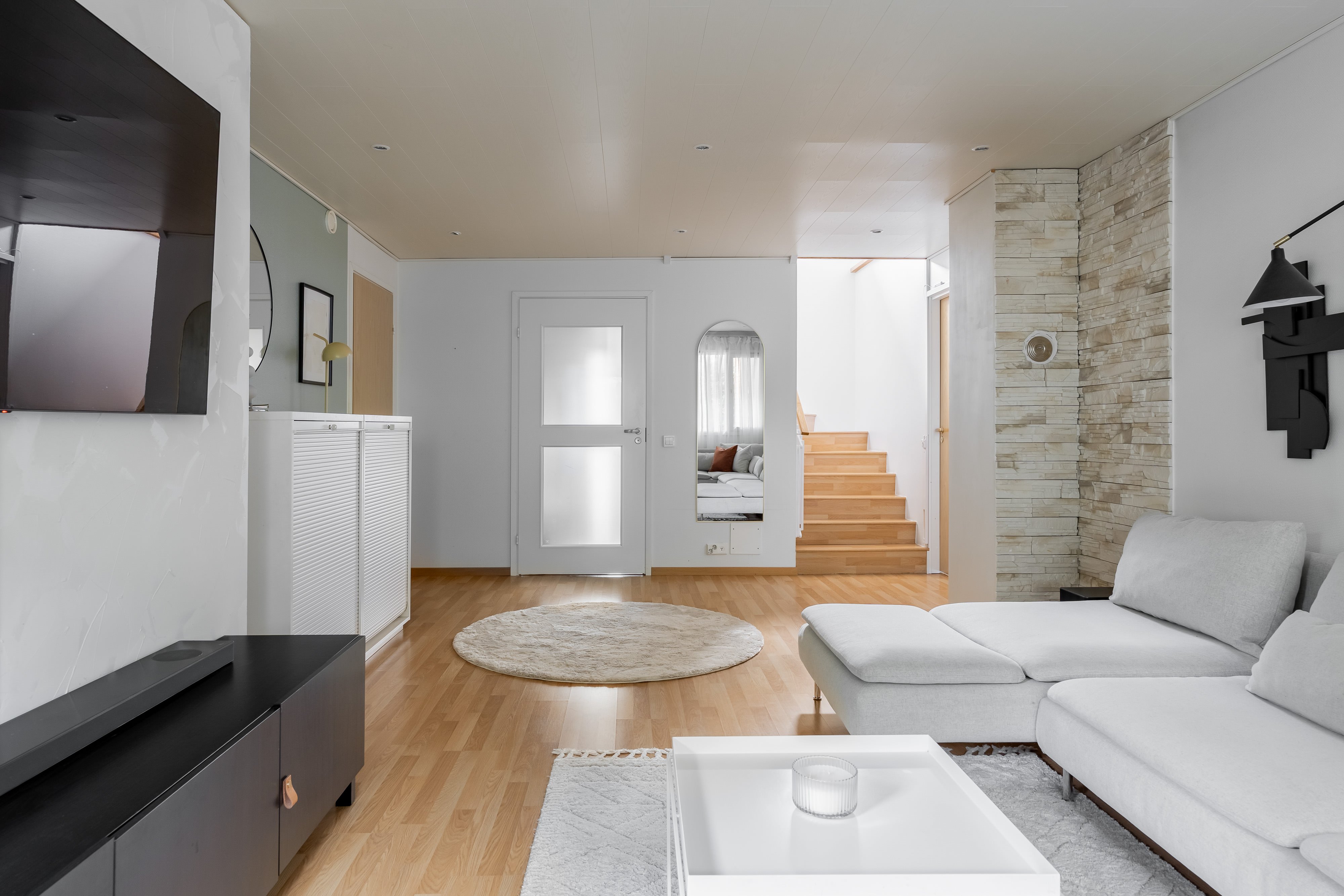 Asunnon alakerrassa on kaksi makuuhuonetta ja viihtyisä sekä avoin olohuone, josta on käynti takapihan terassille. Yläkerrassa sijaitsee kolmas makuuhuone, ruokailutila sekä avokeittiö, joka on varusteltu saarekkeella ja modernilla kodinkoneilla. Yläkerran yhteydessä on myös parveke ja erillinen wc. Yläkerran ruokailutila on muutettavissa helposti toiseksi olohuoneeksi, sillä ruokapöytä sopii lähemmäs keittiötäkin. Eteisessä on käytännöllinen liukuovellinen säilytystila, joka soveltuu hyvin vaikka harrastusvälineille.