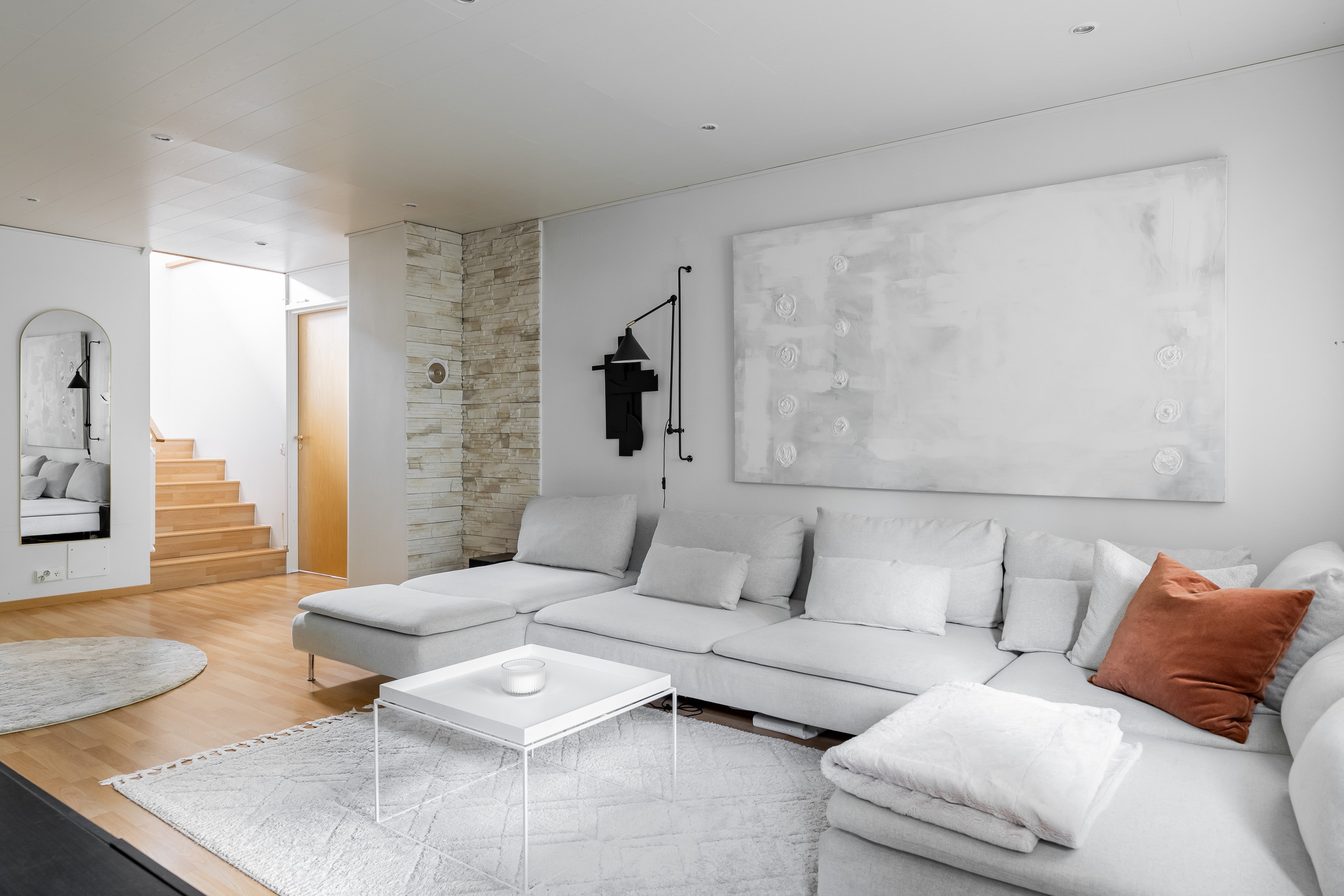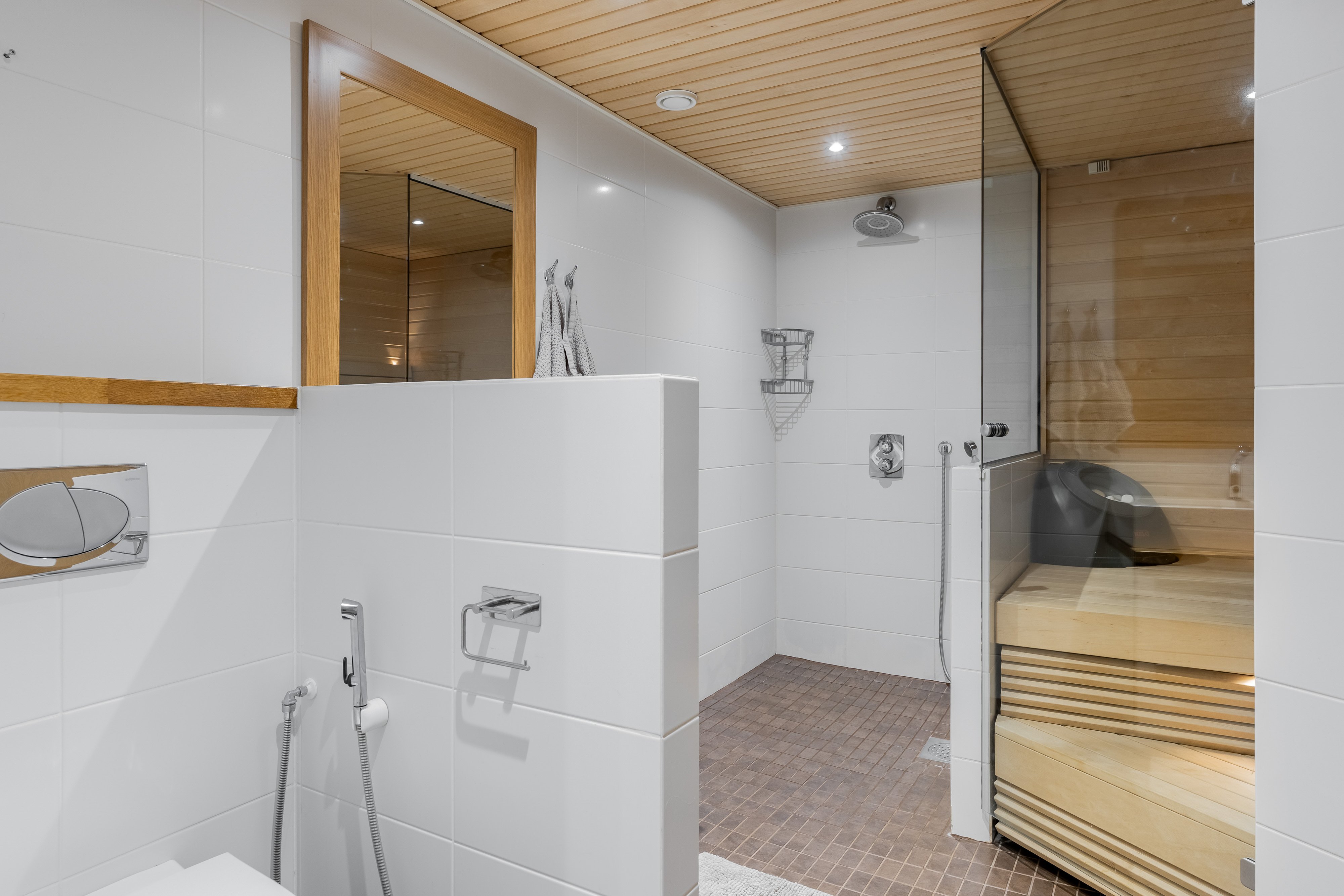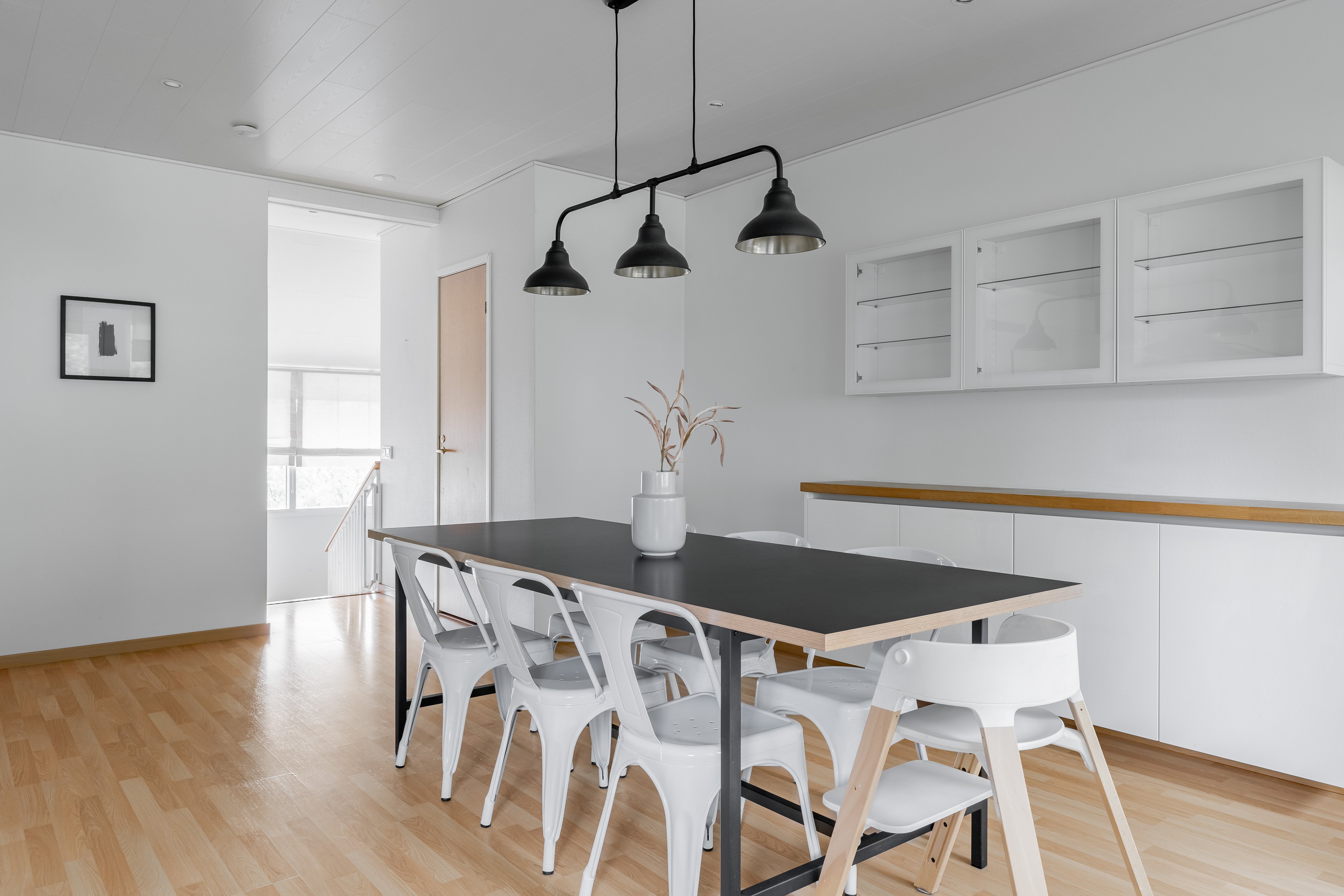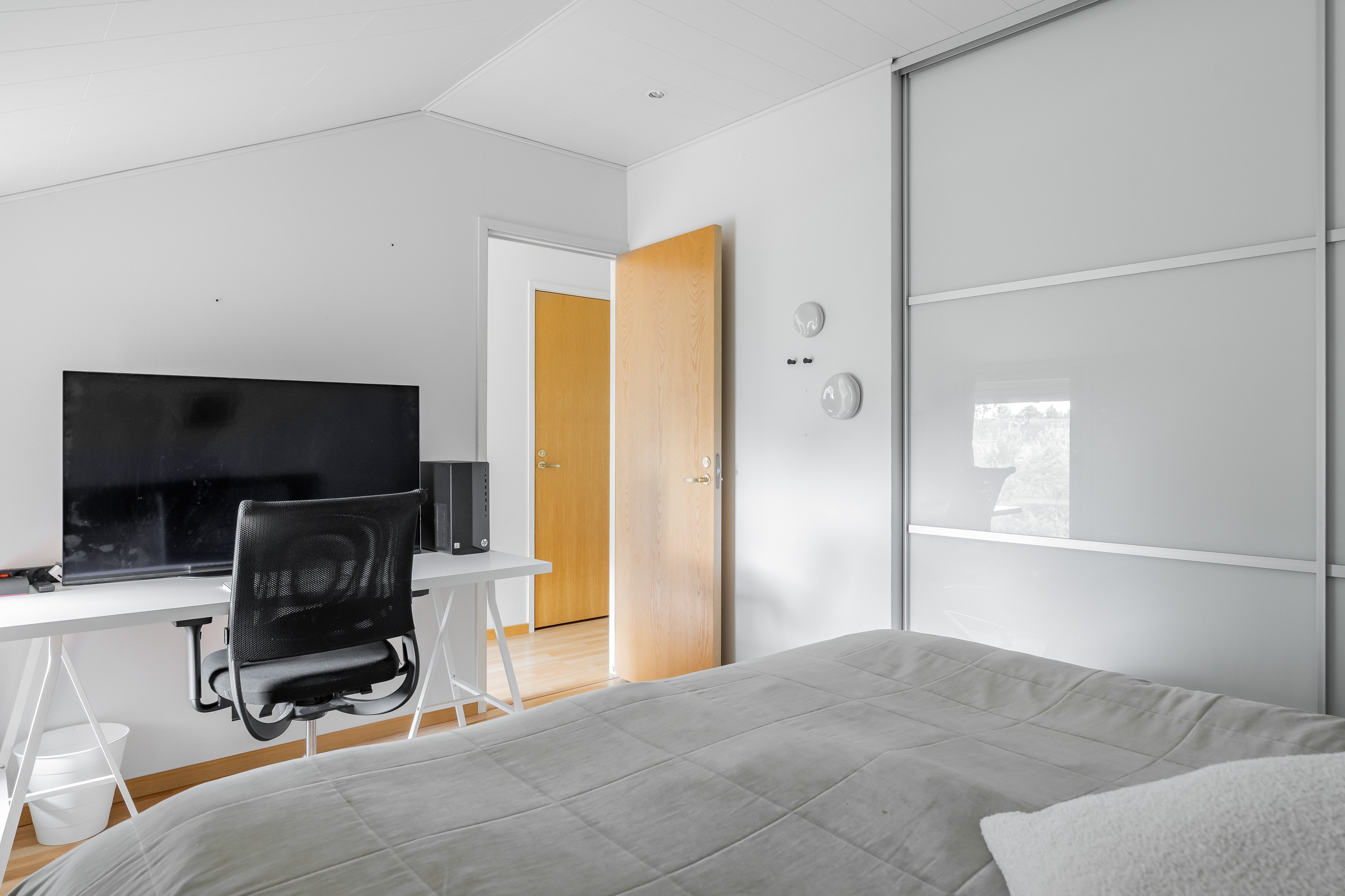 Asunnon alakerrassa on kaksi makuuhuonetta ja viihtyisä sekä avoin olohuone, josta on käynti takapihan terassille. Yläkerrassa sijaitsee kolmas makuuhuone, ruokailutila sekä avokeittiö, joka on varusteltu saarekkeella ja modernilla kodinkoneilla. Yläkerran yhteydessä on myös parveke ja erillinen wc. Yläkerran ruokailutila on muutettavissa helposti toiseksi olohuoneeksi, sillä ruokapöytä sopii lähemmäs keittiötäkin. Eteisessä on käytännöllinen liukuovellinen säilytystila, joka soveltuu hyvin vaikka harrastusvälineille.