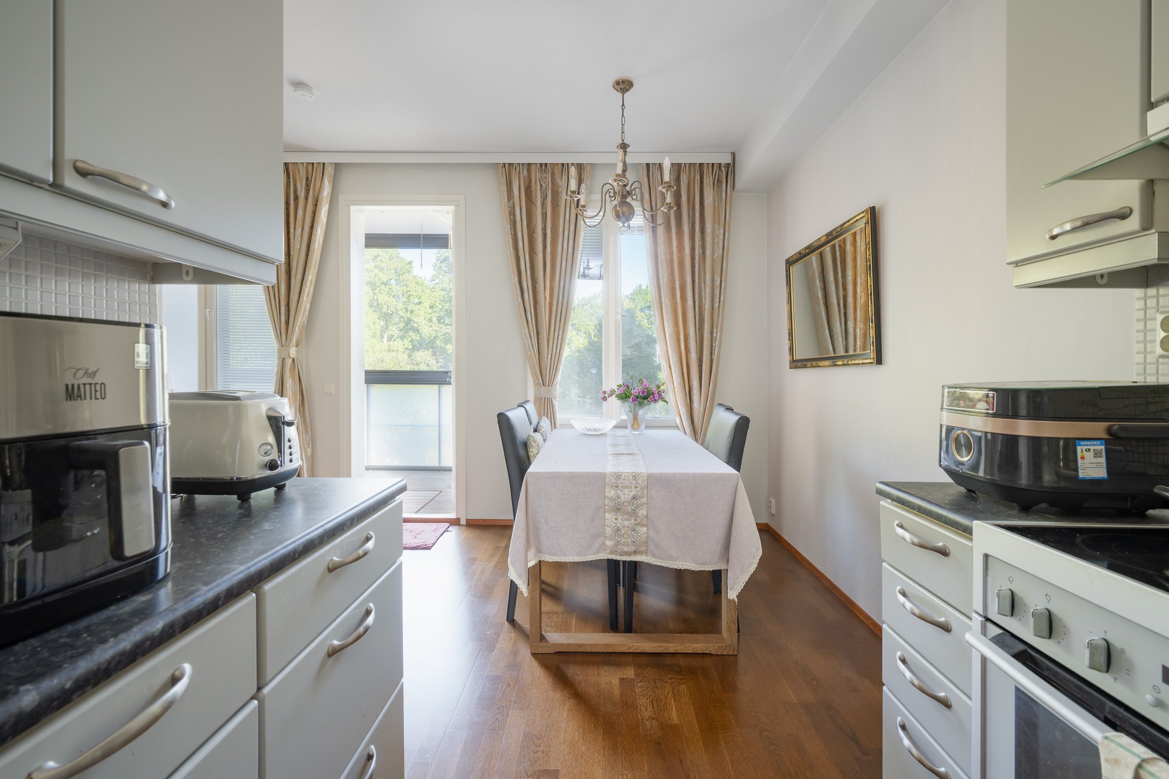 The apartment has two bedrooms, a private sauna and a glazed balcony where you can enjoy peaceful moments. The kitchen is equipped with modern appliances, such as an induction stove and dishwasher, and is seamlessly connected to the living room. The bathroom has everything you need to ensure the smooth running of everyday life.