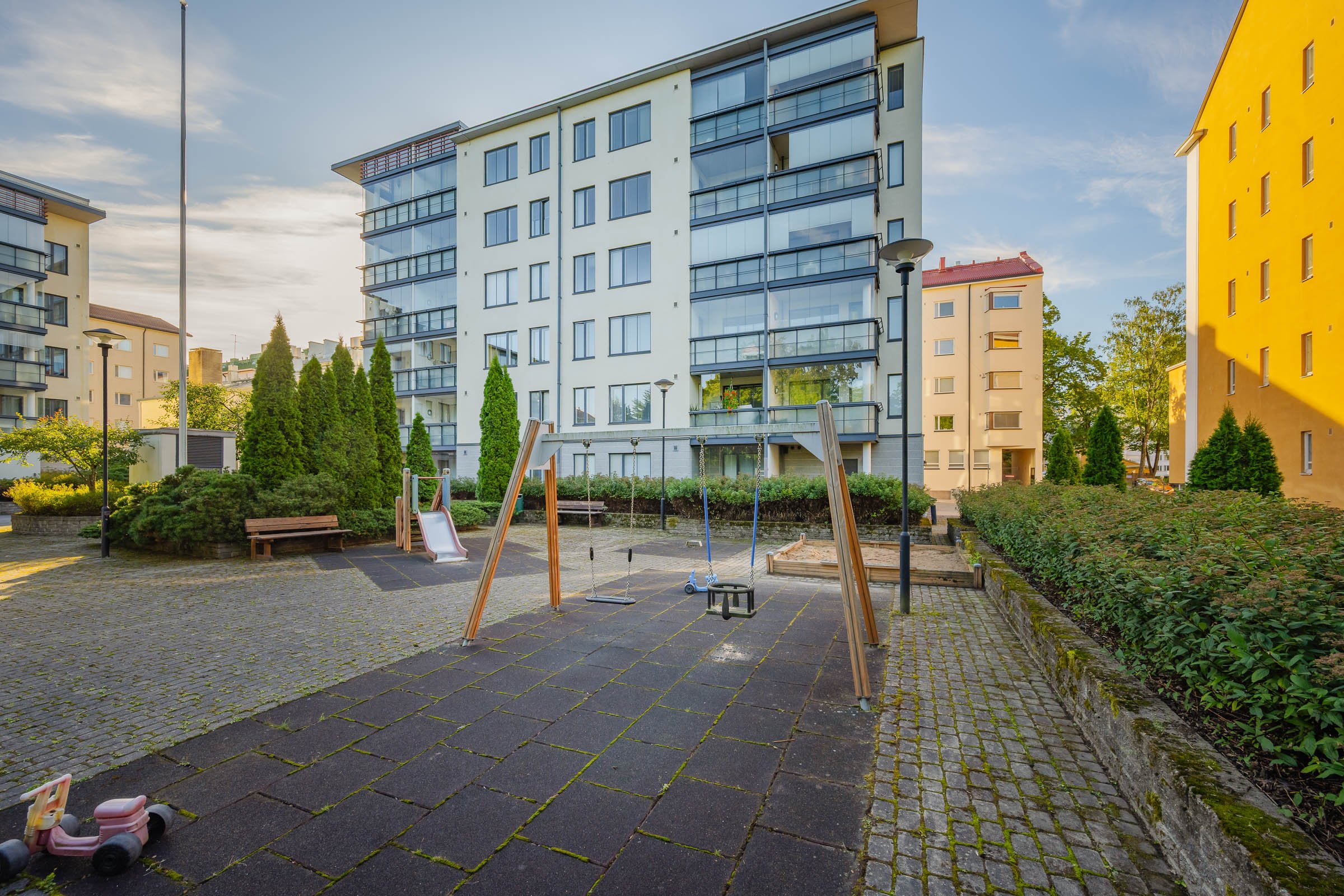 Sijainti on mitä mainioin: päiväkoti ja koulu ovat vain kivenheiton päässä, ja Turun keskustan palvelut, kuten kauppatori, ovat kävelyetäisyydellä. Liikenneyhteydet ovat erinomaiset, sillä lähistöltä löytyvät niin bussipysäkit kuin juna-asemakin.