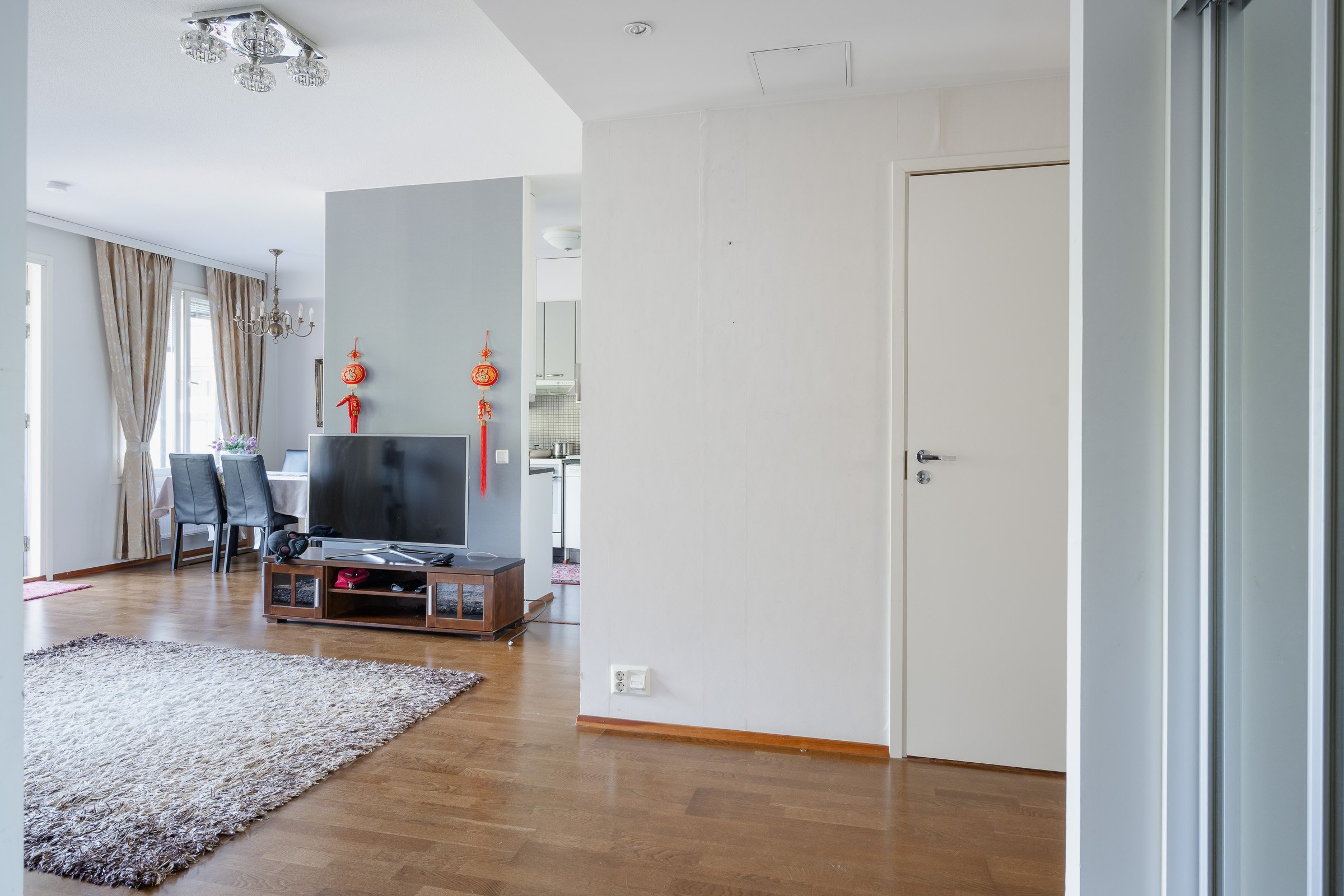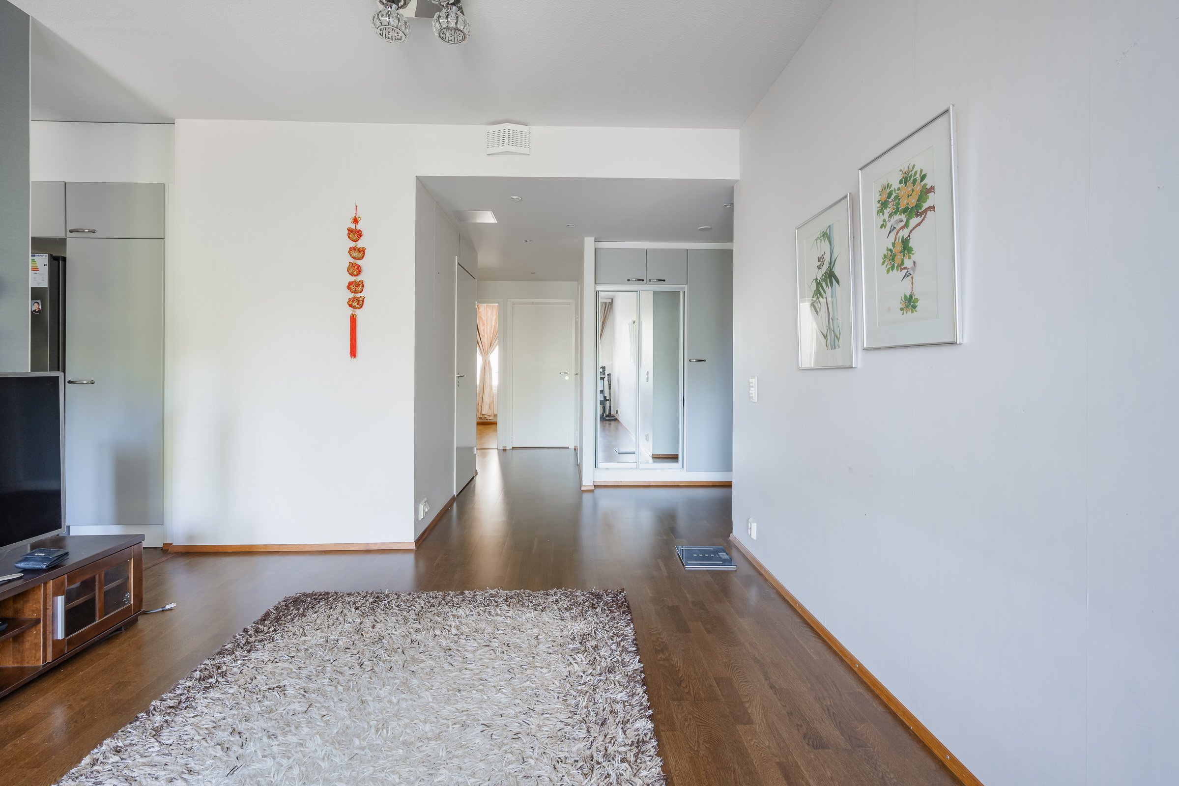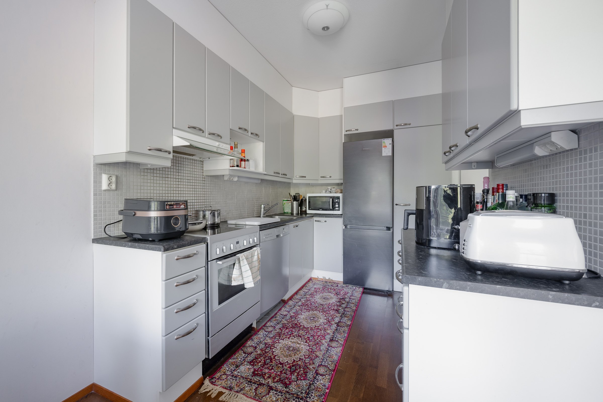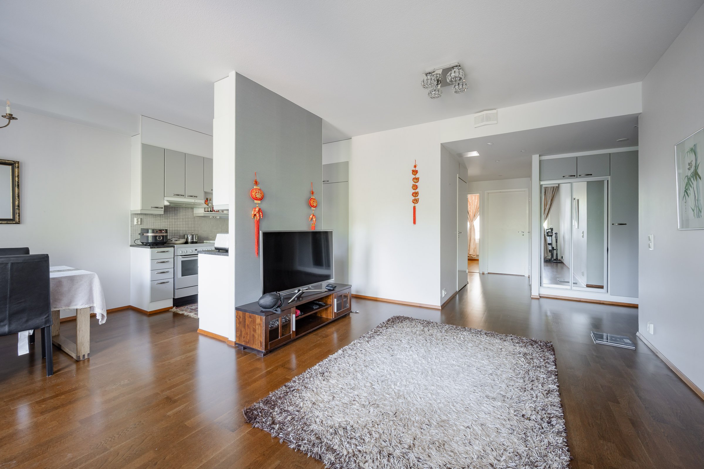 Asunnossa on kaksi makuuhuonetta, oma sauna sekä lasitettu parveke, jossa voi nauttia rauhallisista hetkistä. Keittiö on varustettu nykyaikaisilla laitteilla, kuten induktioliedellä ja astianpesukoneella, ja se yhdistyy saumattomasti olohuoneeseen. Kylpyhuoneessa on kaikki tarvittava arjen sujuvuuden takaamiseksi.