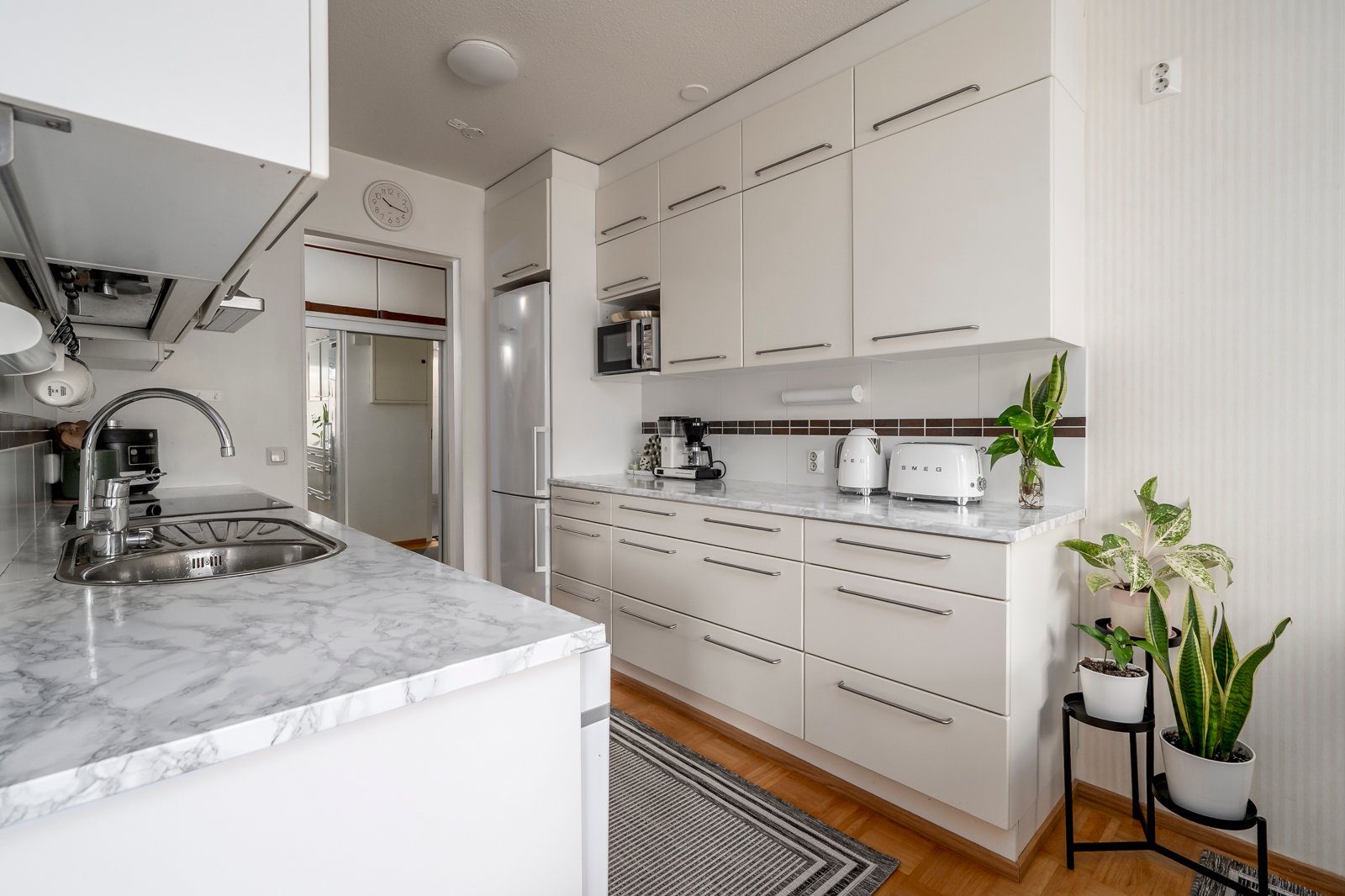 2022 remontoitu keittiö on varustettu nykyaikaisilla laitteilla ja olohuoneesta löytyy ilmalämpöpumppu viilentämään helteisiä päiviä. Kodissa on kaksi tilavaa makuuhuonetta, erillinen WC, sekä remontoitu kylpyhuone missä lattialämmitys ja oma sauna lisäävät pientä luksusta arkeen.