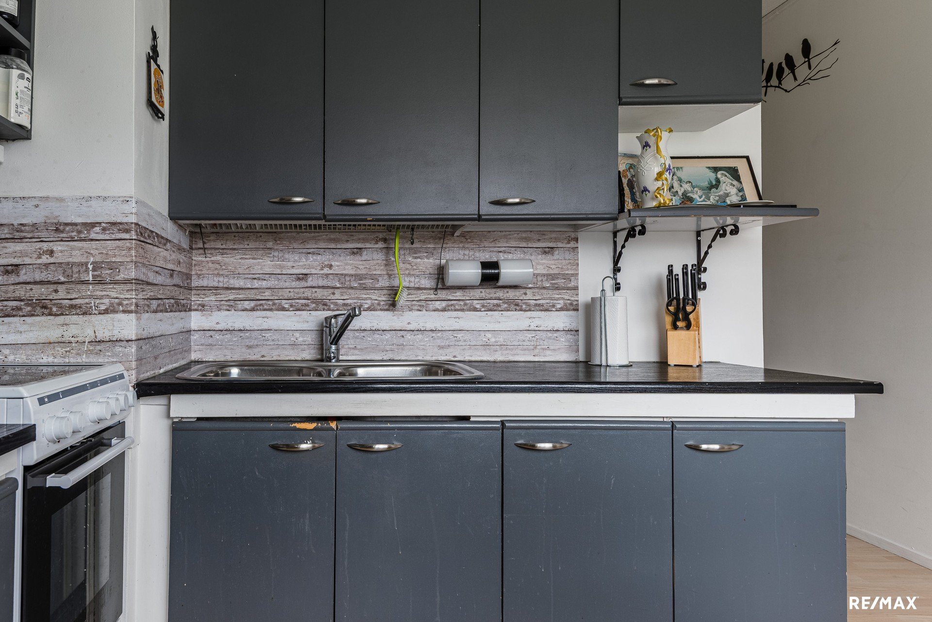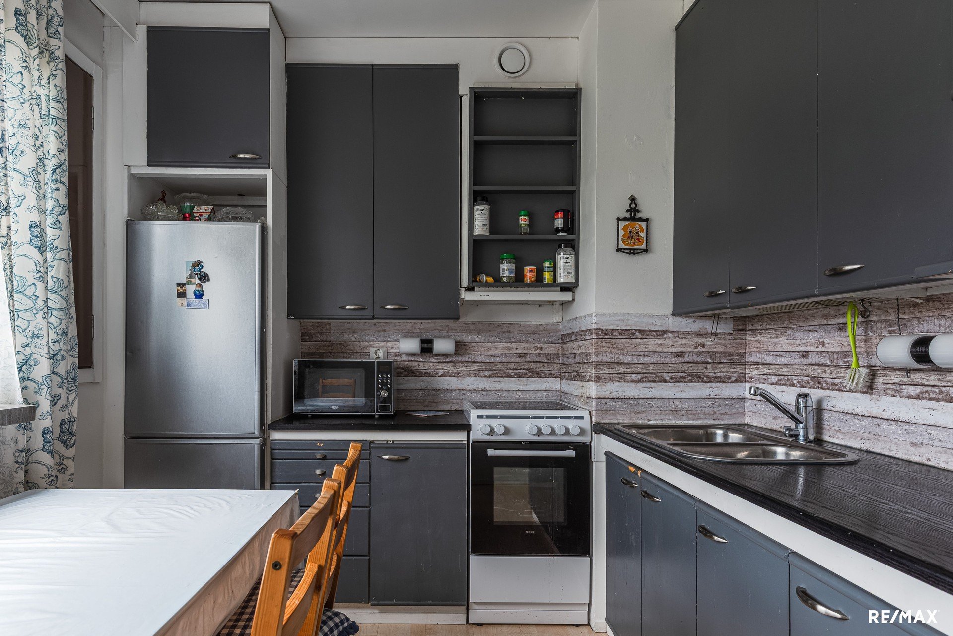 Keittiössä on tilaa ruokapöydälle ja ikkunanäkymä sisäpihalle. Kaapistot ovat alkuperäiset ja niitä on kunnostettu mm. maalaamalla. Asunnon pinnoissa on kuluneisuutta ja pienellä pintaremontilla teet asunnosta mieleisesi.
