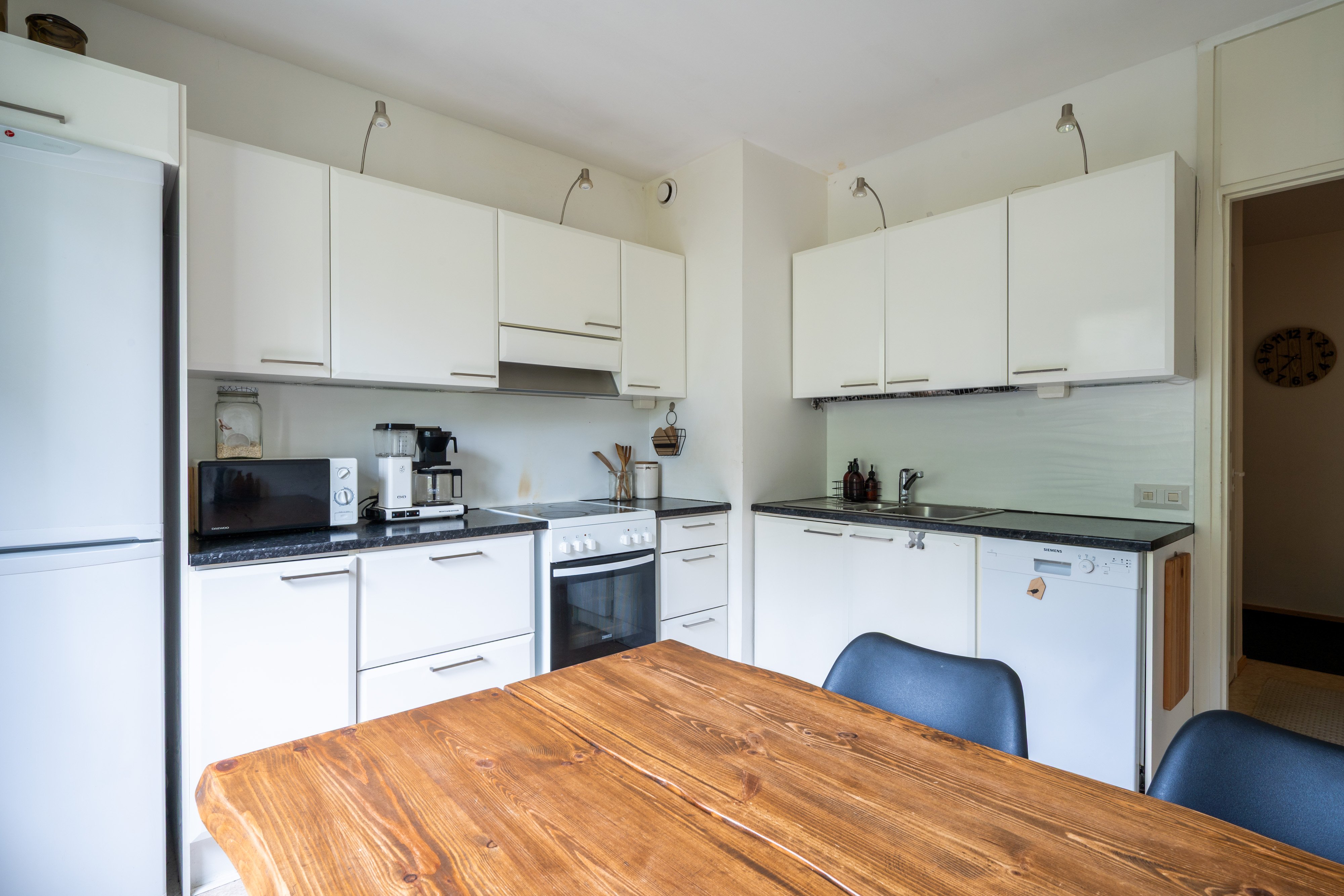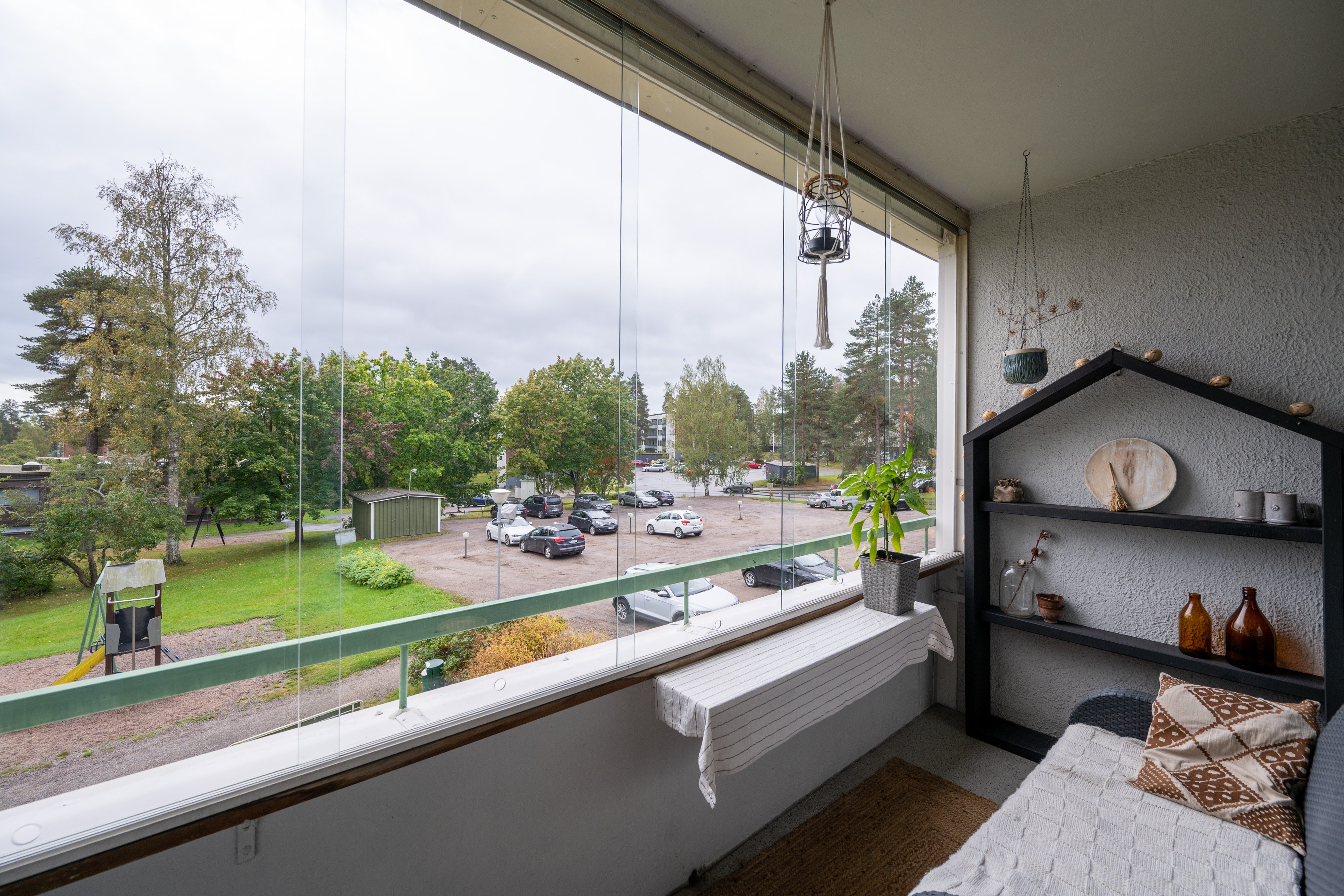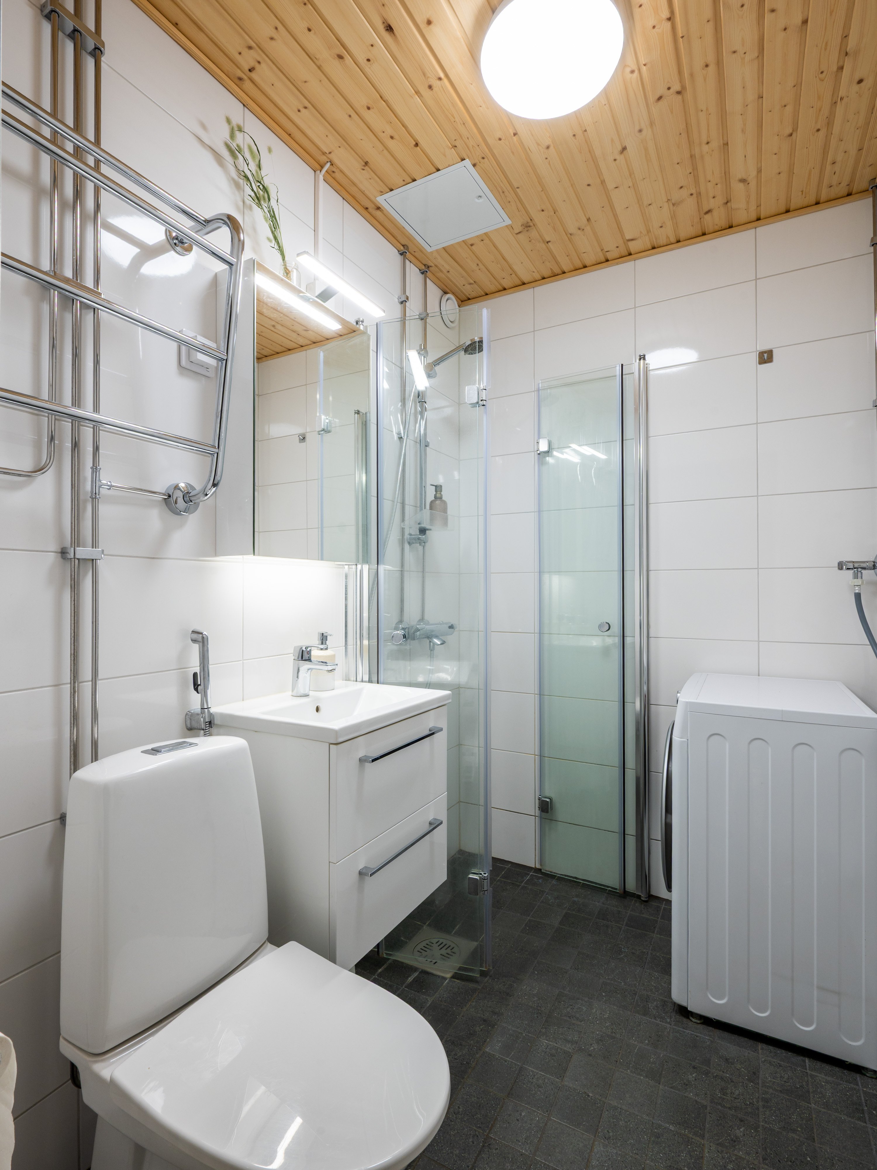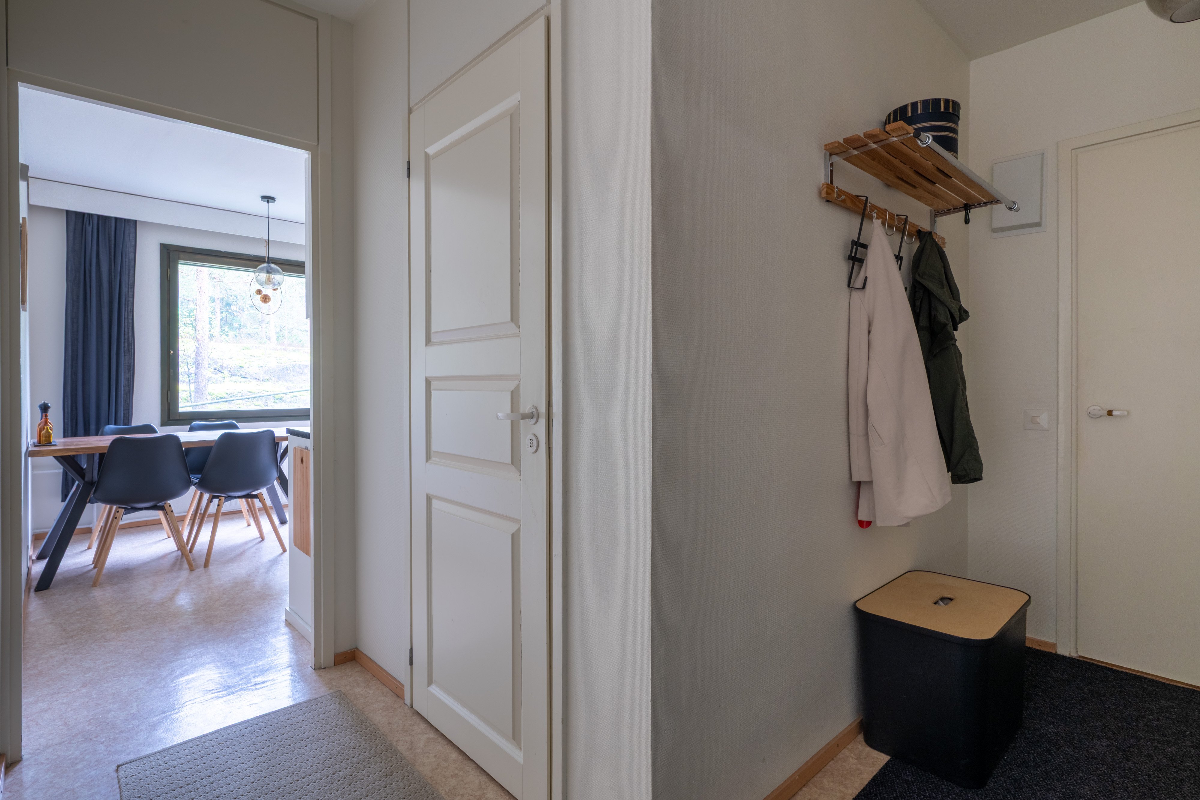 Kylpyhuone on remontoitu kauttaaltaan vuonna 2023. Laatoitetut pinnat ja ajantasaiset kalusteet tekevät siitä valmiin pitkälle tulevaisuuteen. Pesukoneelle on oma paikkansa, mikä helpottaa arkea. Keittiössä on jääkaappipakastin, keraaminen liesi, uuni ja astianpesukone, eli kaikki tarvittava peruskokkaamiseen. Olohuoneen ja makuuhuoneiden lattiat ovat muovimattoa, seinissä lasikuitutapettia, tapettia ja maalia. Huoneistoa on eletty rauhassa, joten pinnat ovat muutoin siistissä kunnossa.