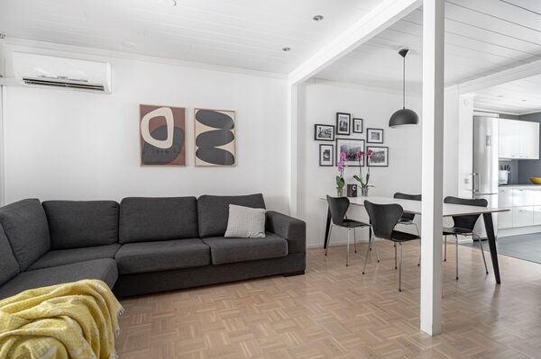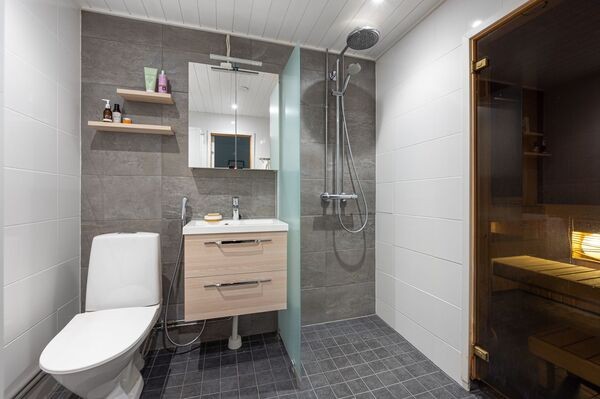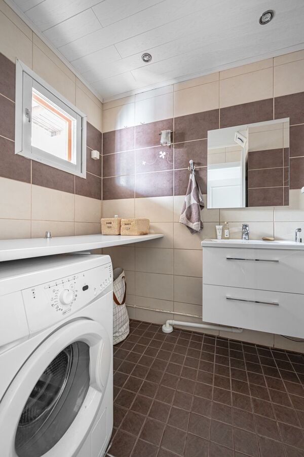 Kodinhoitotila, jossa on käytännöllisiä yksityiskohtia kuten lastenhoitopöytä, joka helpottaa lapsiperheen arjen askareita. Ilmalämpöpumppu olohuoneessa takaa miellyttävän sisäilman ympäri vuoden – viilentäen kesähelteillä ja tuoden lisälämpöä lämmistyskaudella.