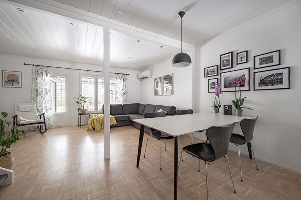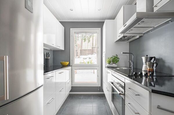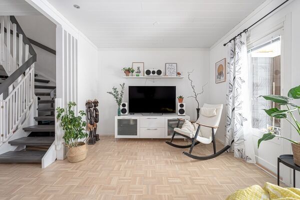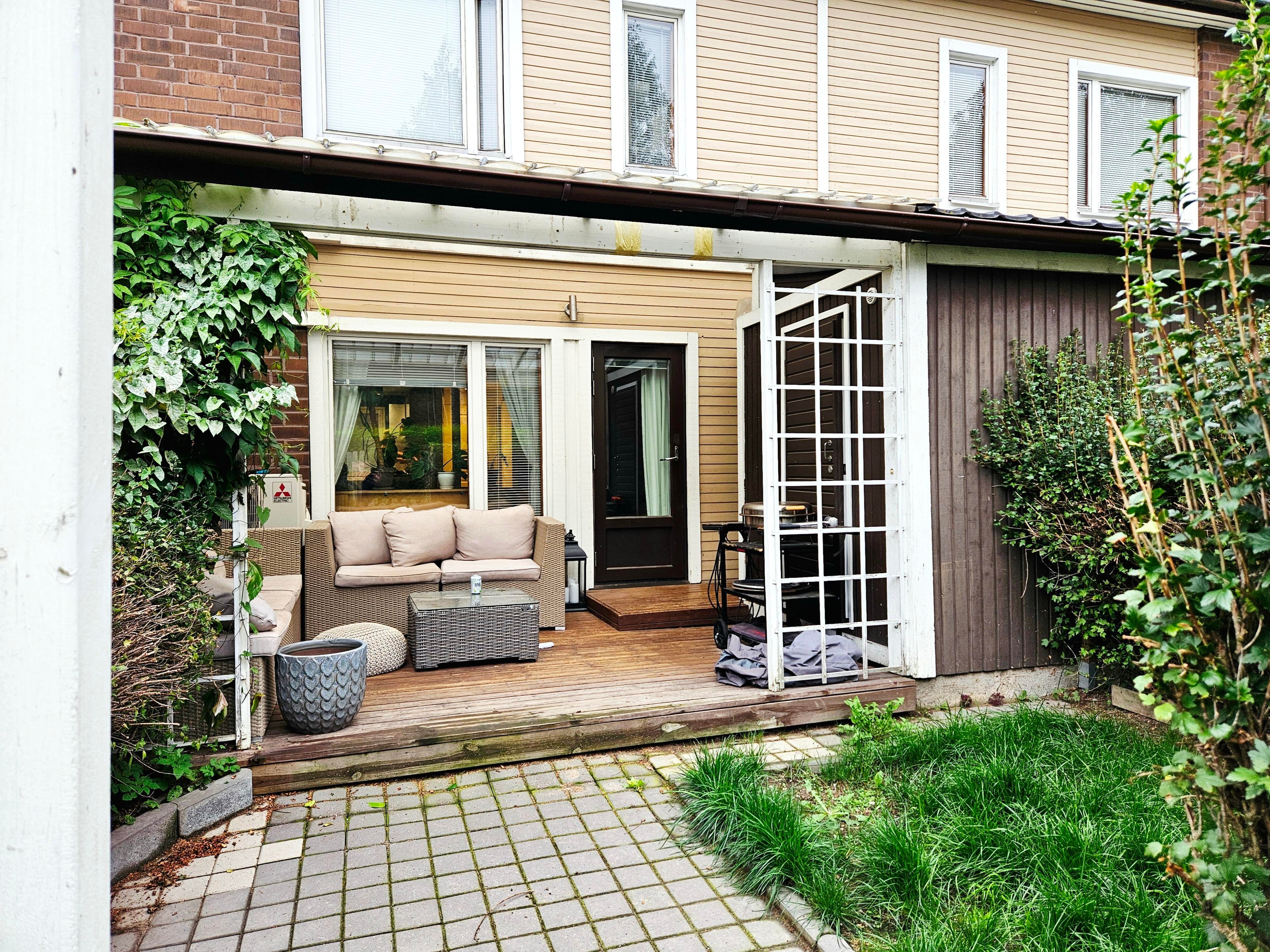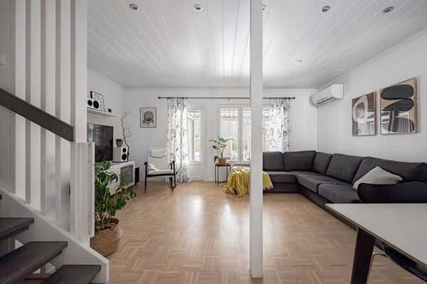 Tässä 82 neliömetrin rivitalokodissa on kaikki mitä tarvitset viihtyisään asumiseen – tilava olohuone, josta pääsy omalle takapihan terassille, moderni keittiö, joka uusittiin vuonna 2012 ja kaksi makuuhuonetta yläkerrassa. Keittiön kivitasot ja laadukkaat kodinkoneet tekevät ruoanlaitosta nautinnon. Lisäksi kodissa on uusittu kylpyhuone, jossa voit rentoutua päivän päätteeksi, sekä sauna, joka tuo ripauksen luksusta arkeen.