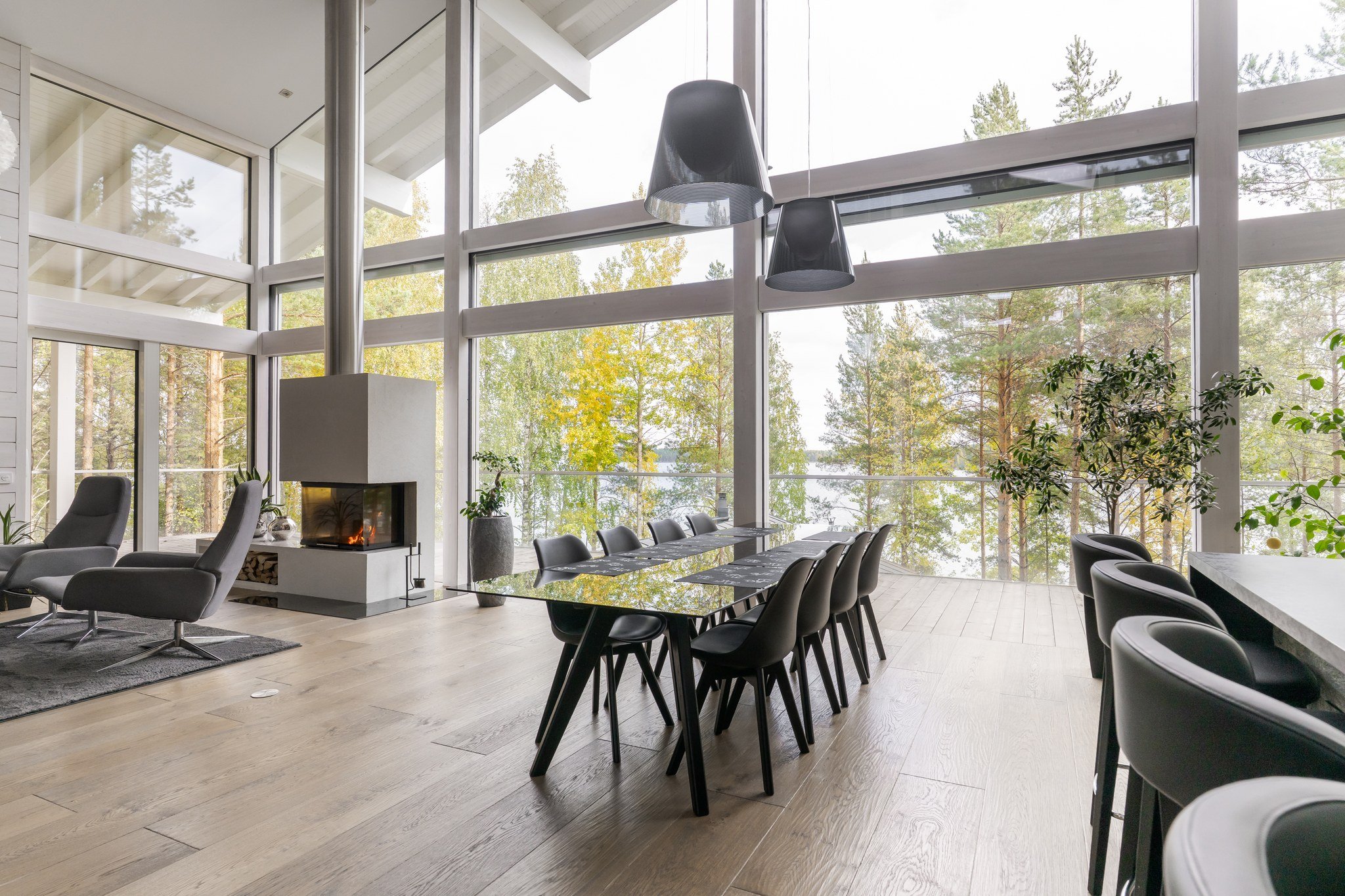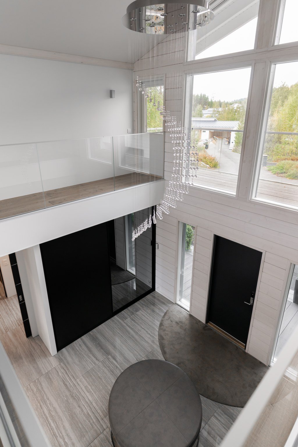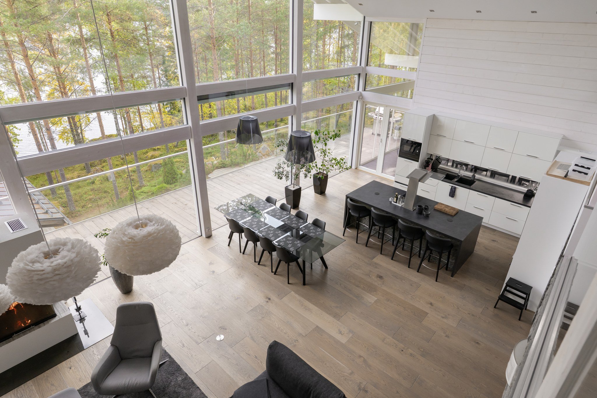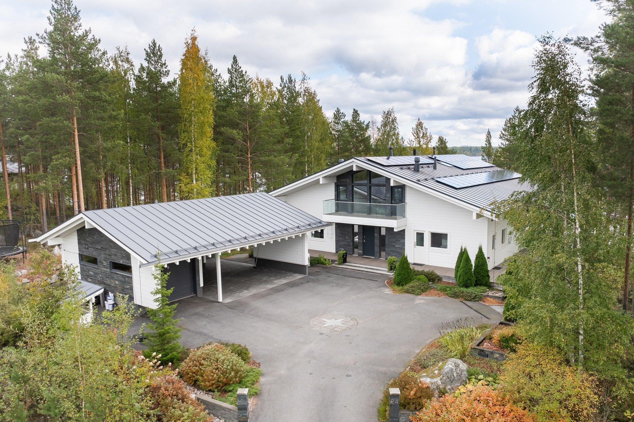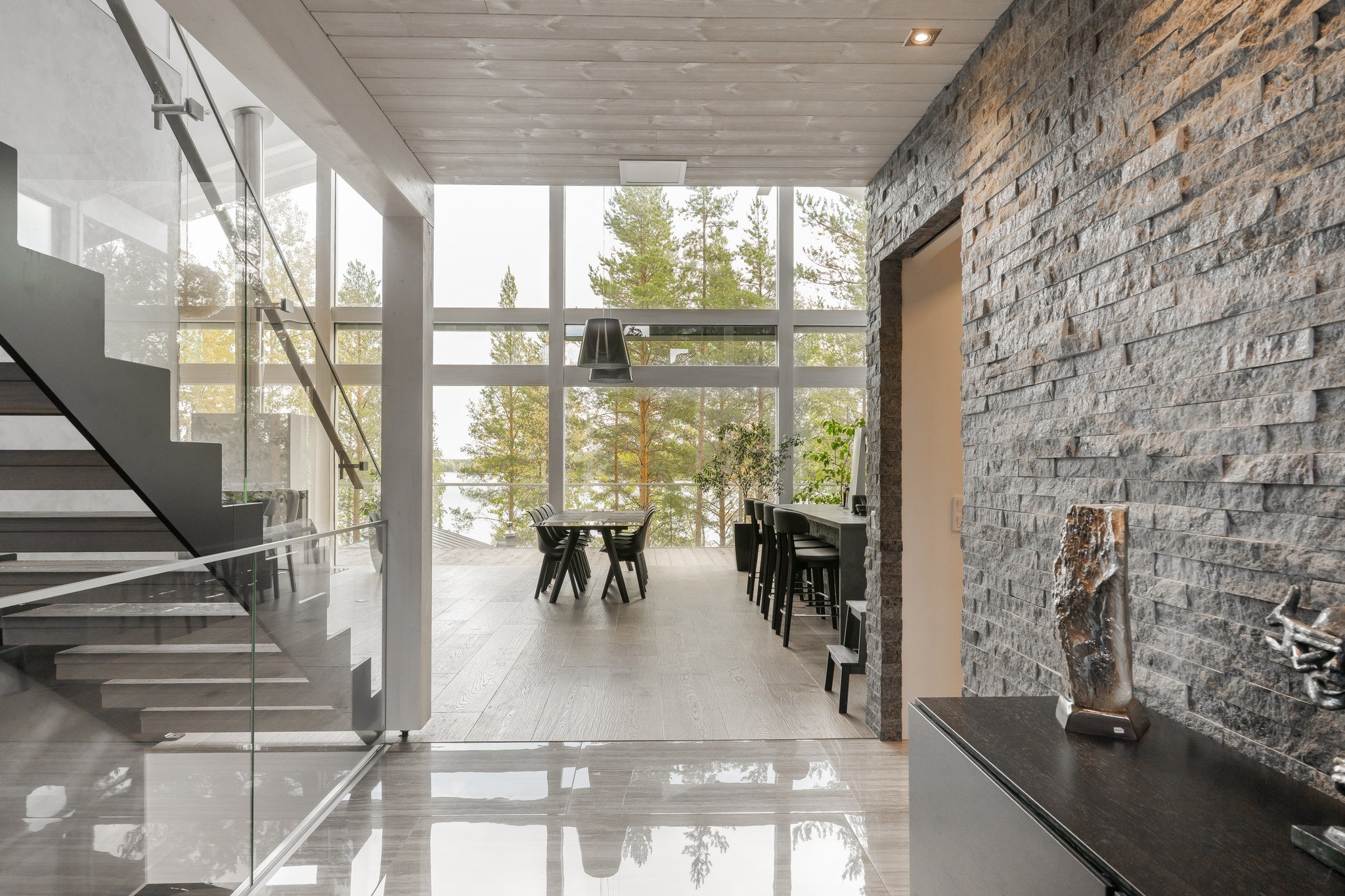 Tässä modernissa kodissa jokainen yksityiskohta on viimeistelty sisustussuunnittelija Marika Kurjen taidokkaalla otteella. Sisätiloissa yhdistyvät ajaton eleganssi, huippumateriaalit ja luova tilasuunnittelu, joka huomioi luonnonvalon kauniisti kaikissa huoneissa. Avara pohjaratkaisu ja suuret ikkunapinnat tuovat sisään luonnonläheisyyden ja tarjoavat upeat näkymät järvelle.