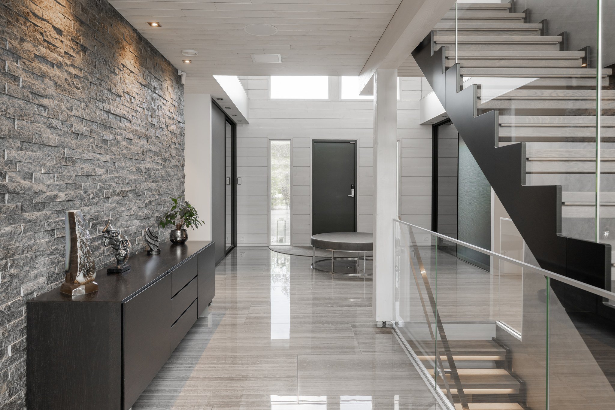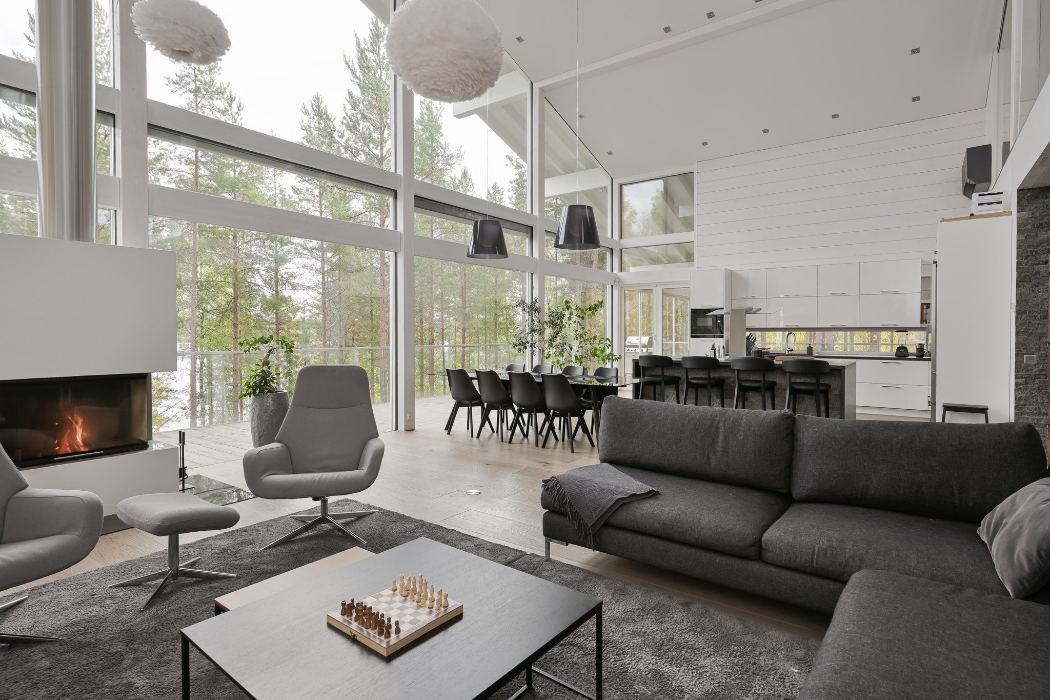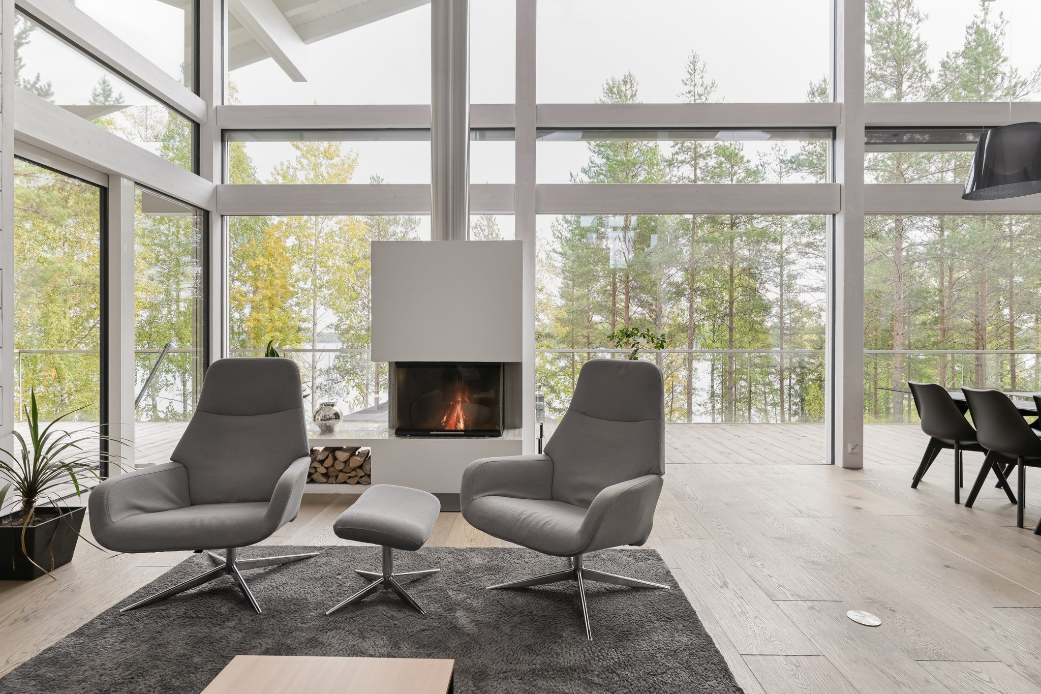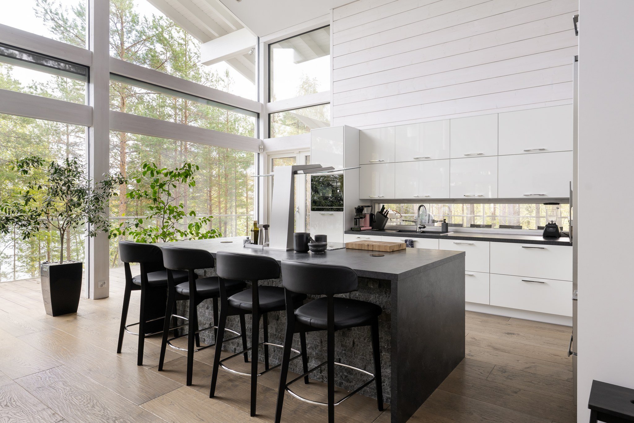 Tässä modernissa kodissa jokainen yksityiskohta on viimeistelty sisustussuunnittelija Marika Kurjen taidokkaalla otteella. Sisätiloissa yhdistyvät ajaton eleganssi, huippumateriaalit ja luova tilasuunnittelu, joka huomioi luonnonvalon kauniisti kaikissa huoneissa. Avara pohjaratkaisu ja suuret ikkunapinnat tuovat sisään luonnonläheisyyden ja tarjoavat upeat näkymät järvelle.