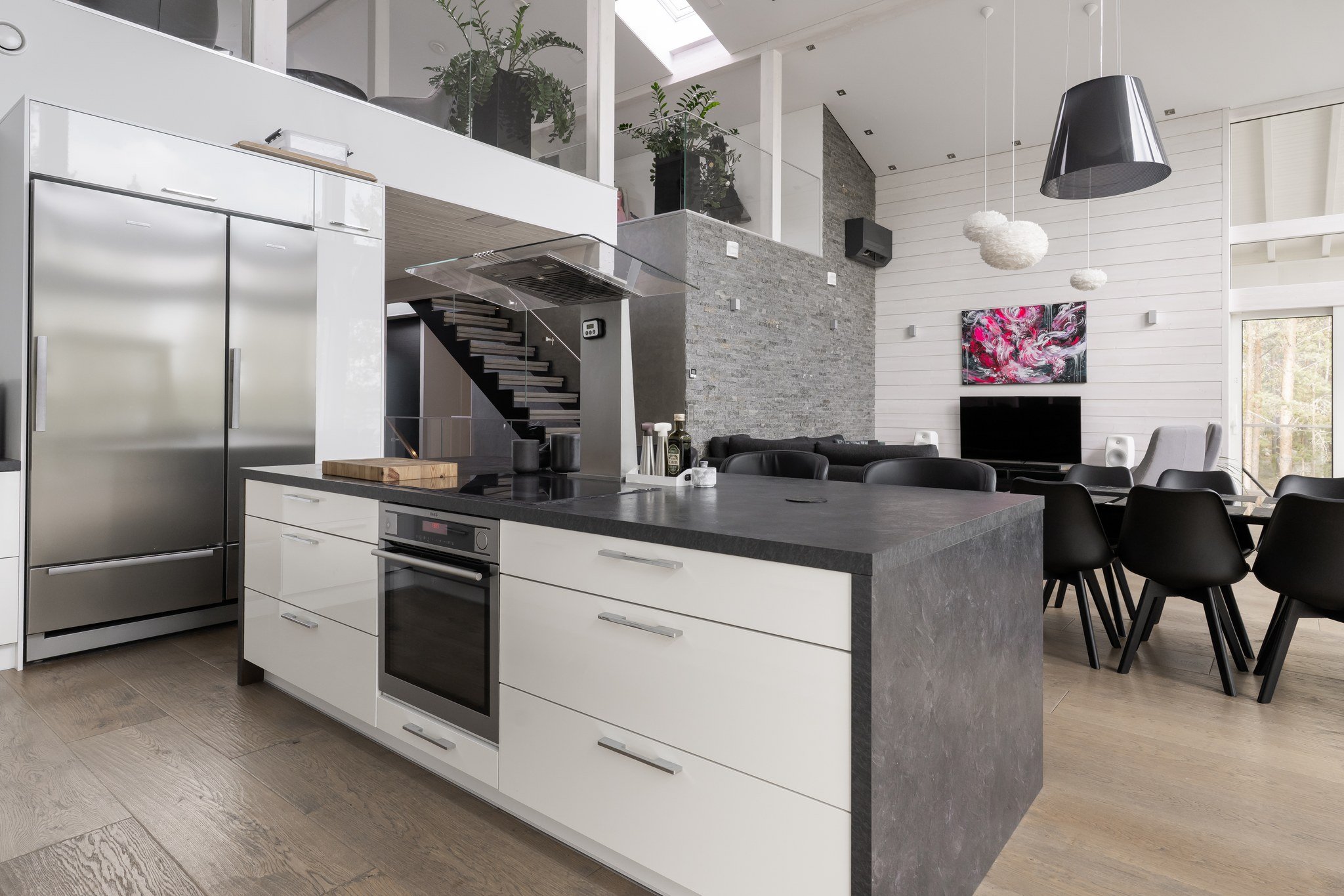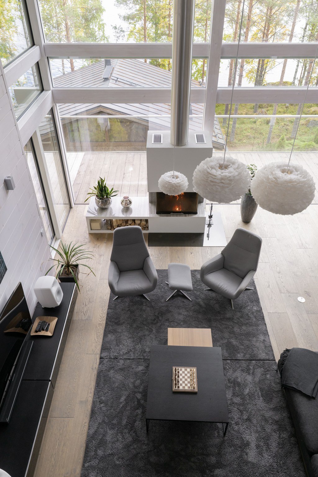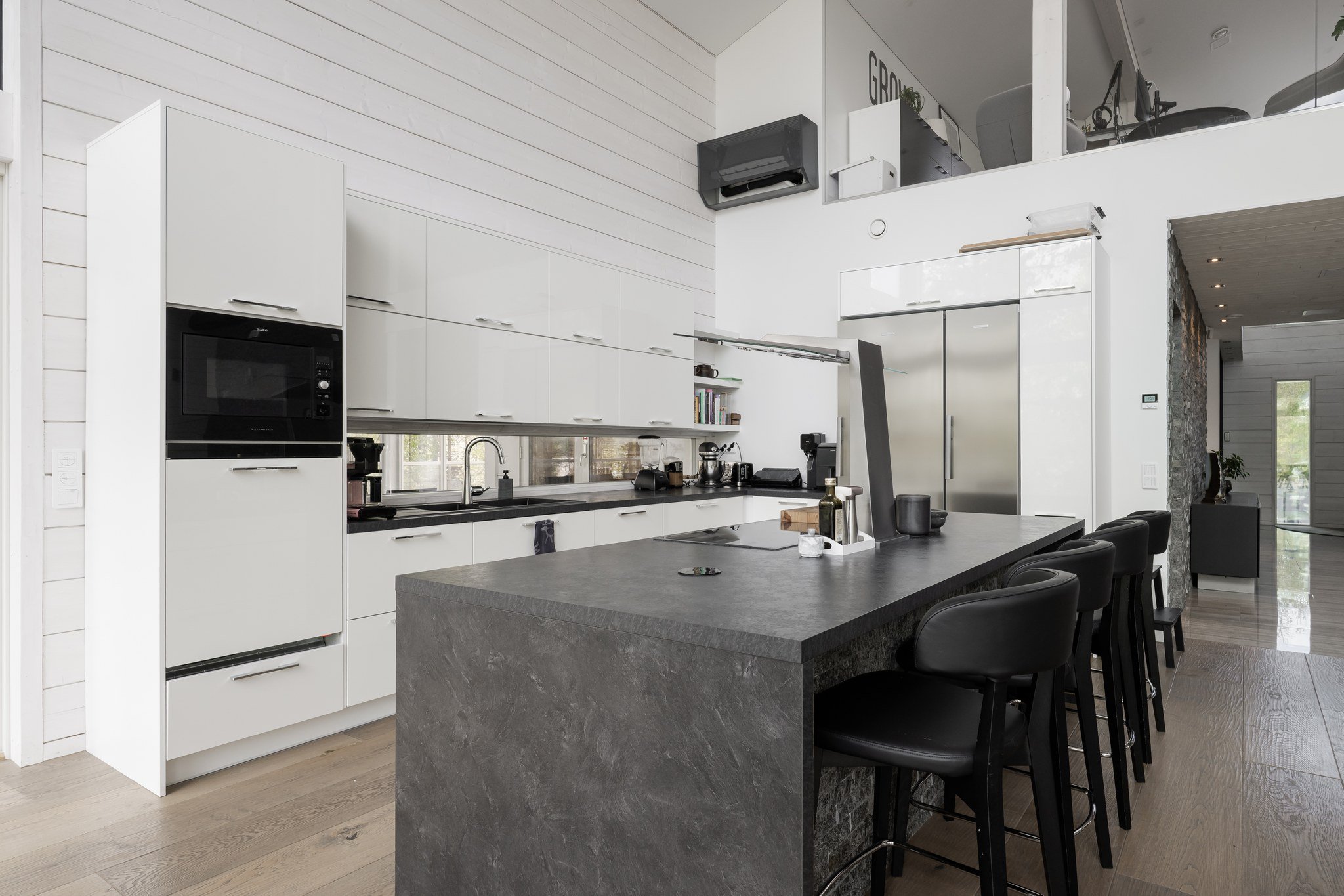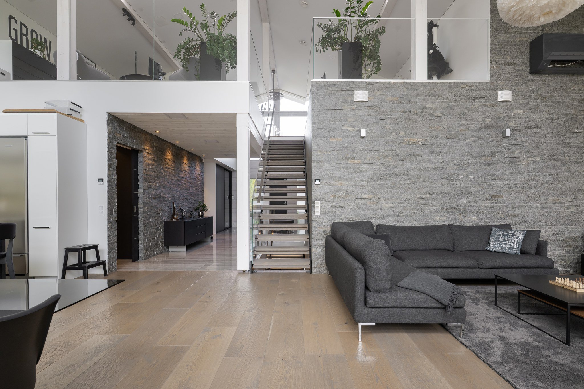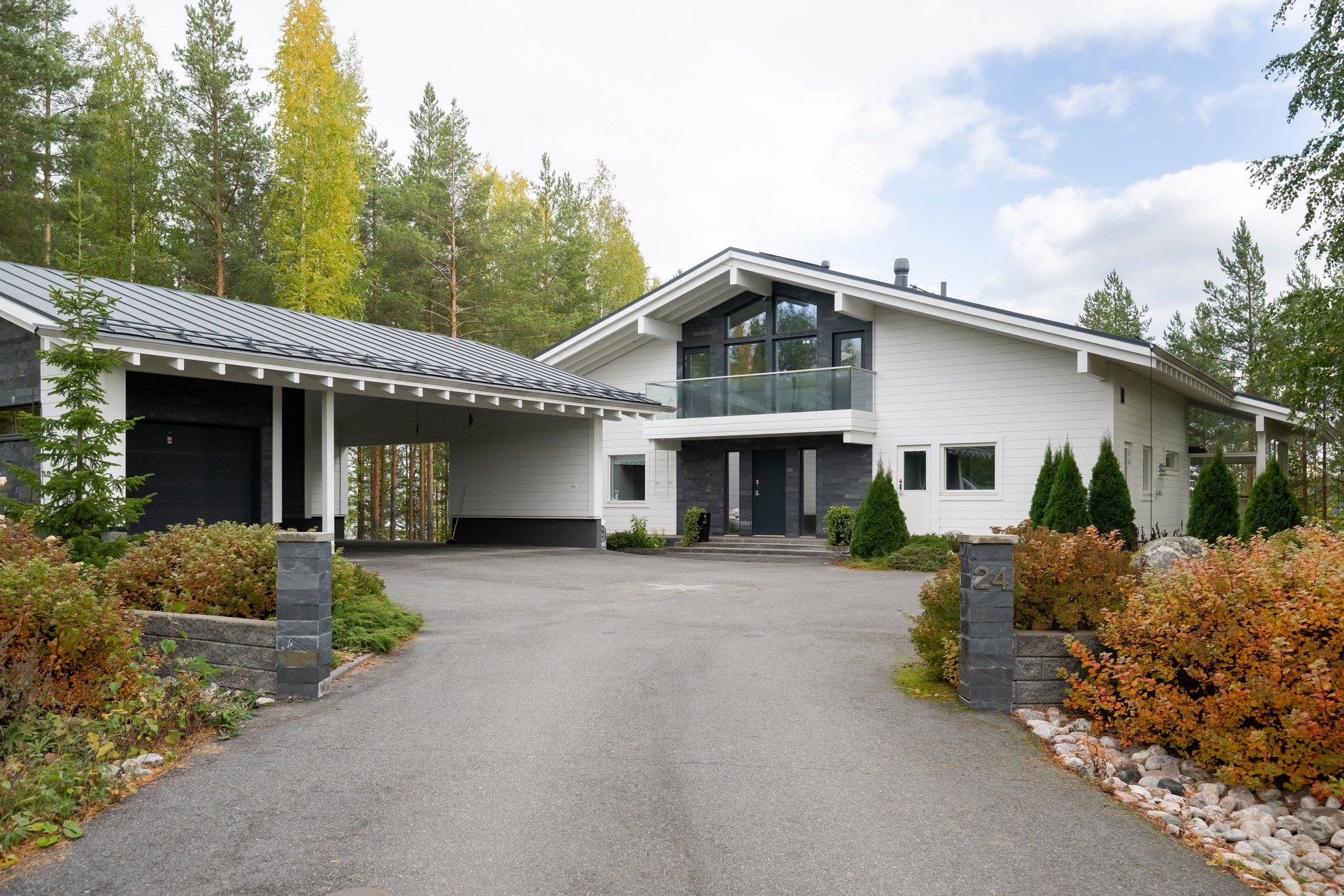 Tässä modernissa kodissa jokainen yksityiskohta on viimeistelty sisustussuunnittelija Marika Kurjen taidokkaalla otteella. Sisätiloissa yhdistyvät ajaton eleganssi, huippumateriaalit ja luova tilasuunnittelu, joka huomioi luonnonvalon kauniisti kaikissa huoneissa. Avara pohjaratkaisu ja suuret ikkunapinnat tuovat sisään luonnonläheisyyden ja tarjoavat upeat näkymät järvelle.