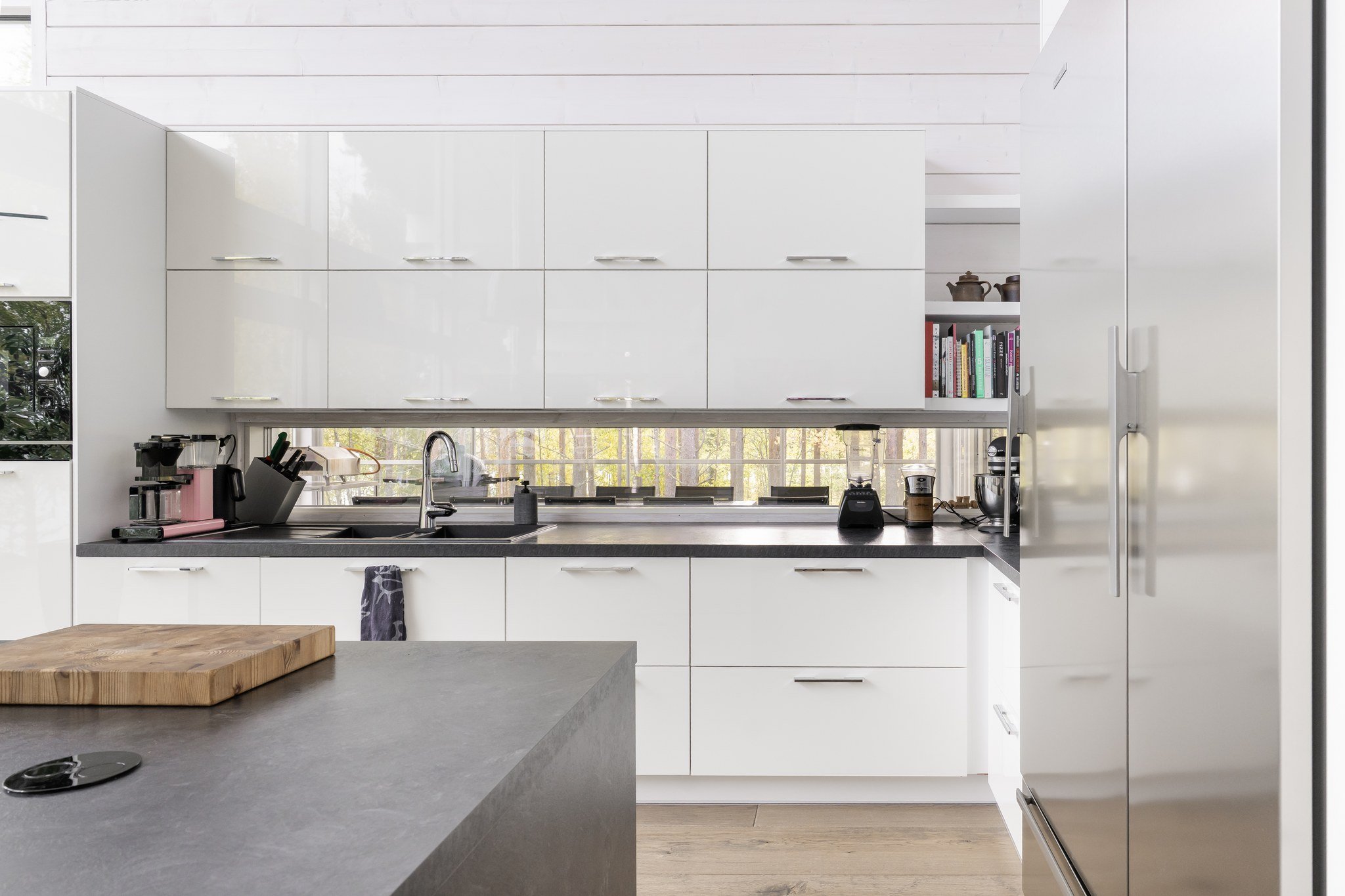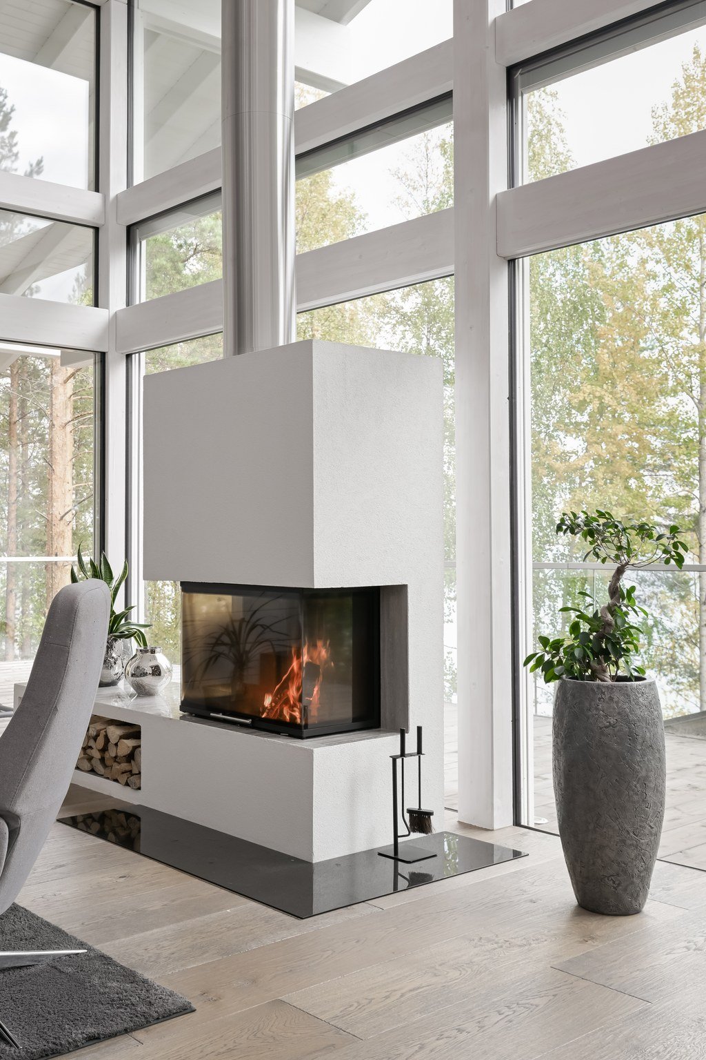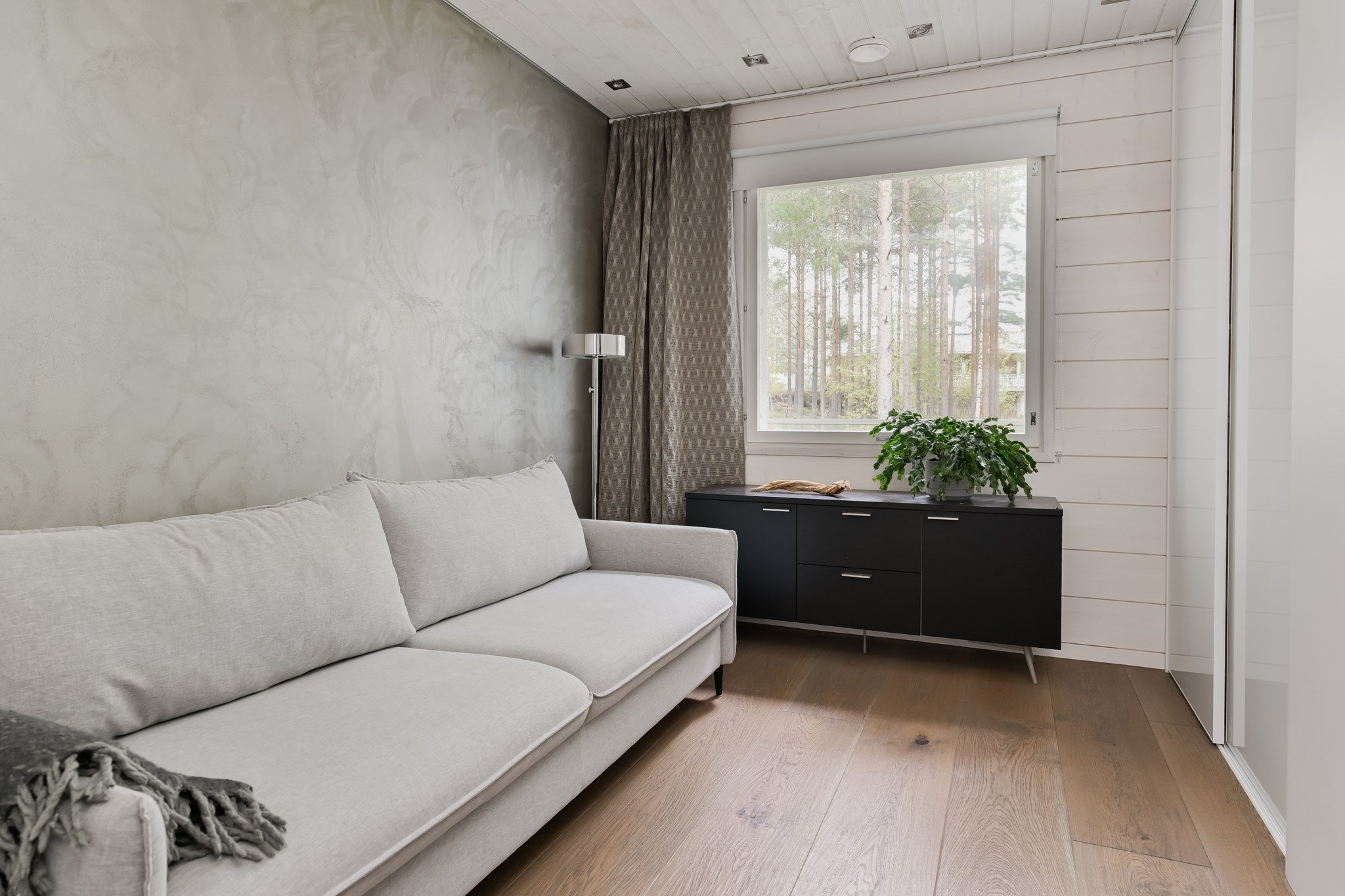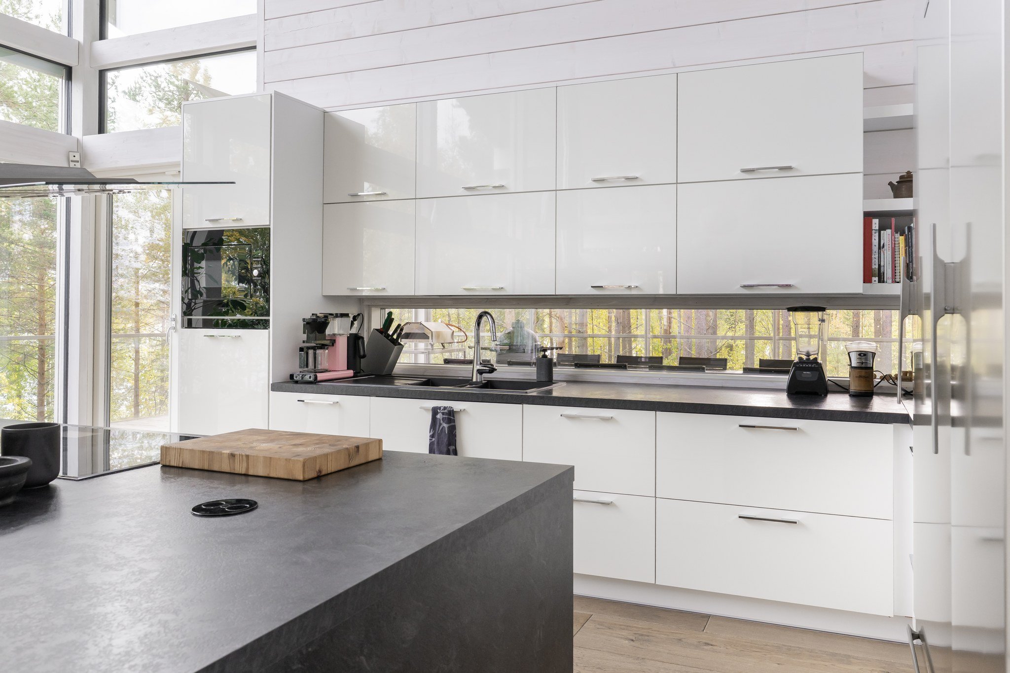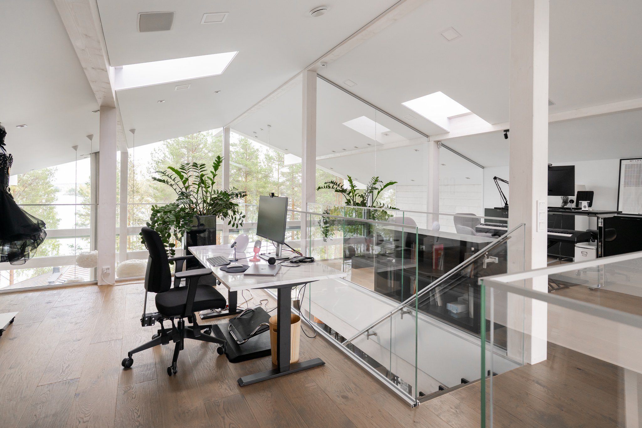 Tässä modernissa kodissa jokainen yksityiskohta on viimeistelty sisustussuunnittelija Marika Kurjen taidokkaalla otteella. Sisätiloissa yhdistyvät ajaton eleganssi, huippumateriaalit ja luova tilasuunnittelu, joka huomioi luonnonvalon kauniisti kaikissa huoneissa. Avara pohjaratkaisu ja suuret ikkunapinnat tuovat sisään luonnonläheisyyden ja tarjoavat upeat näkymät järvelle.