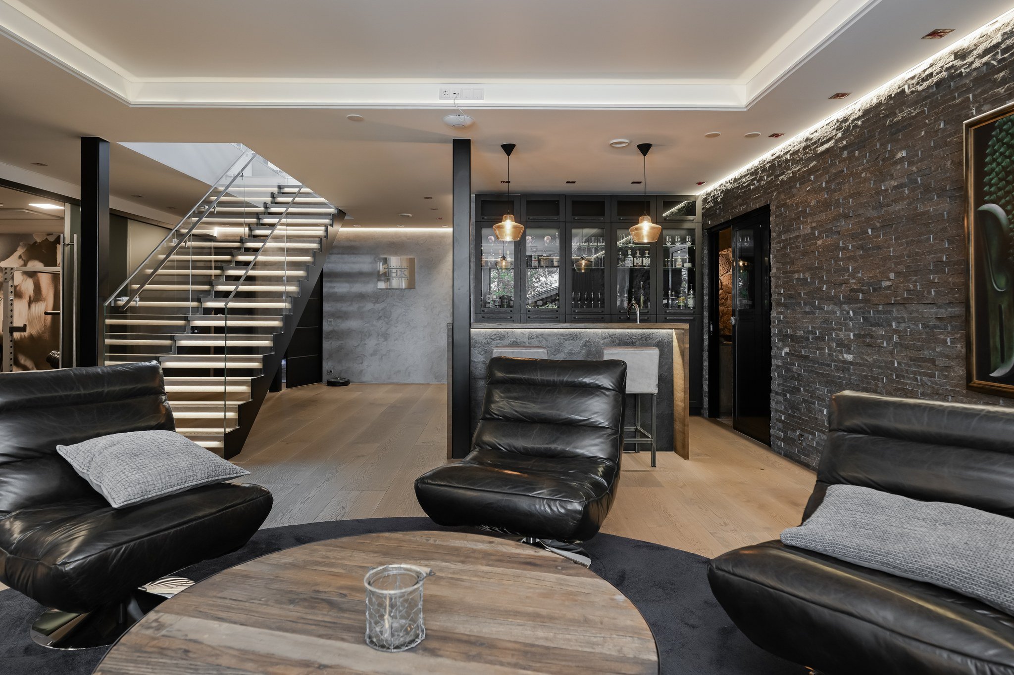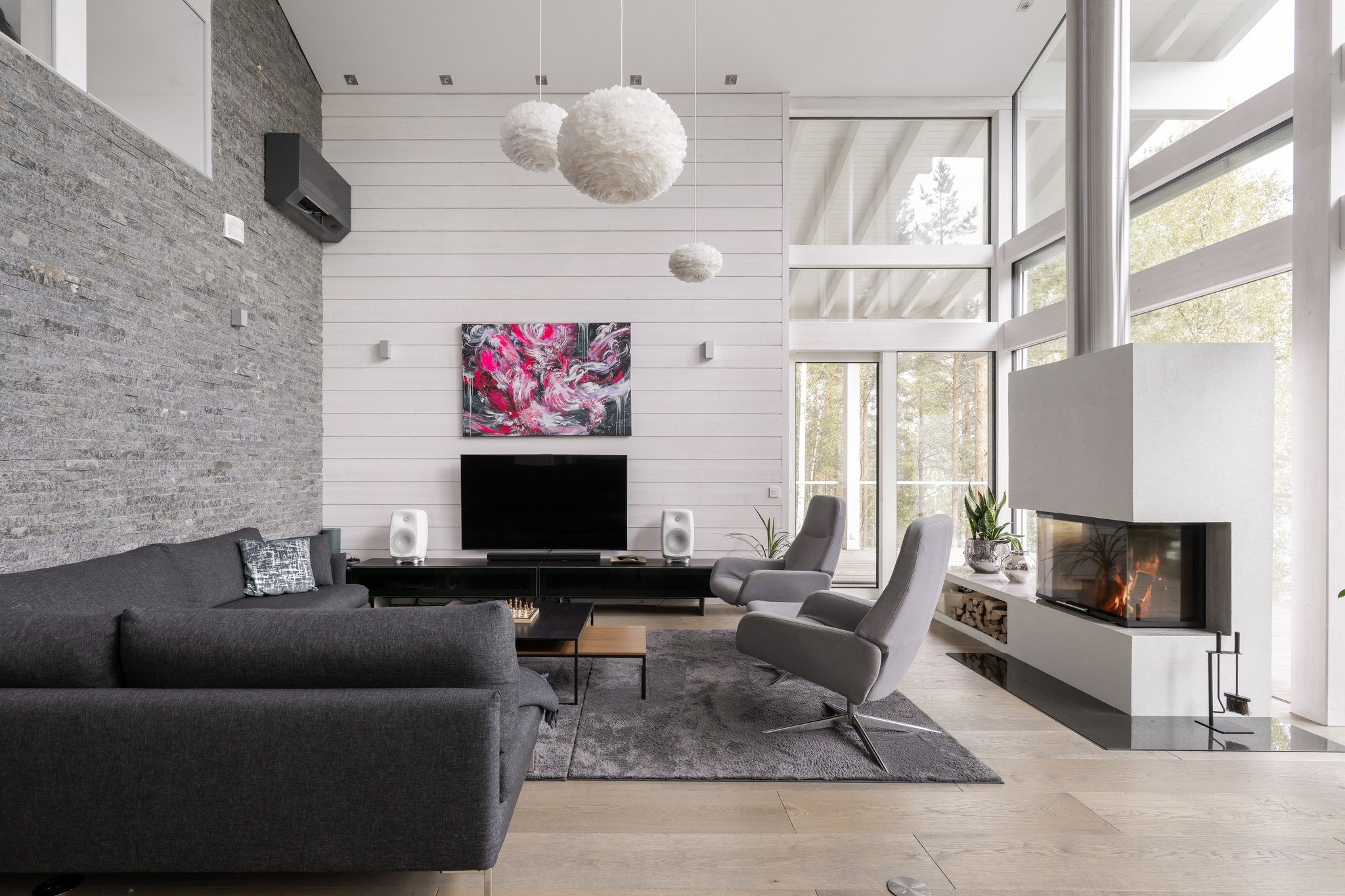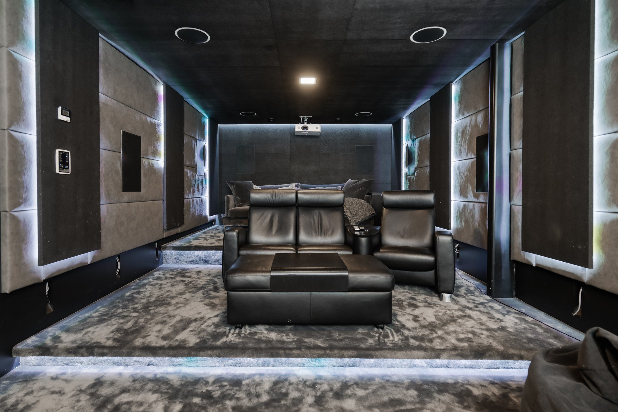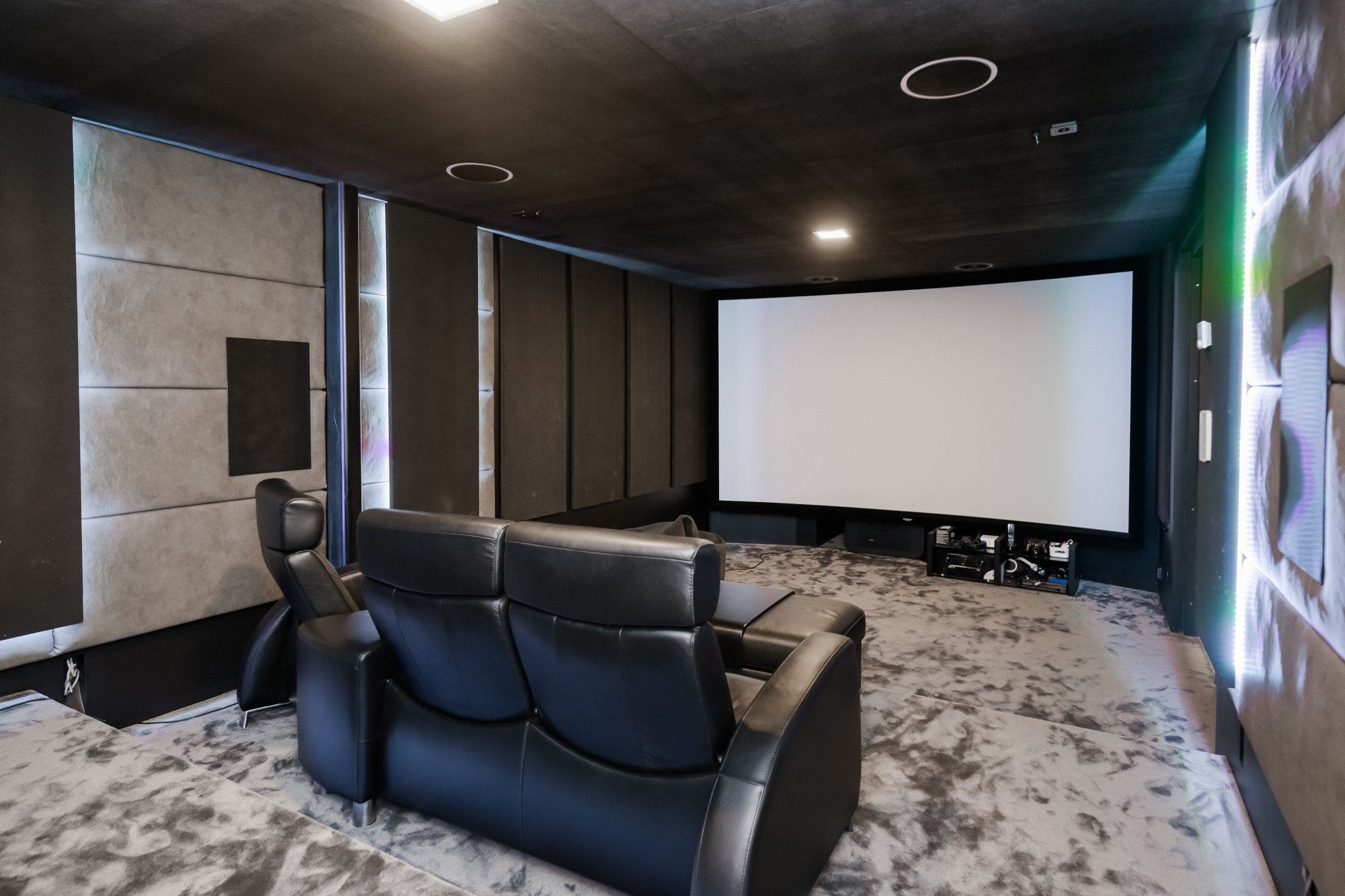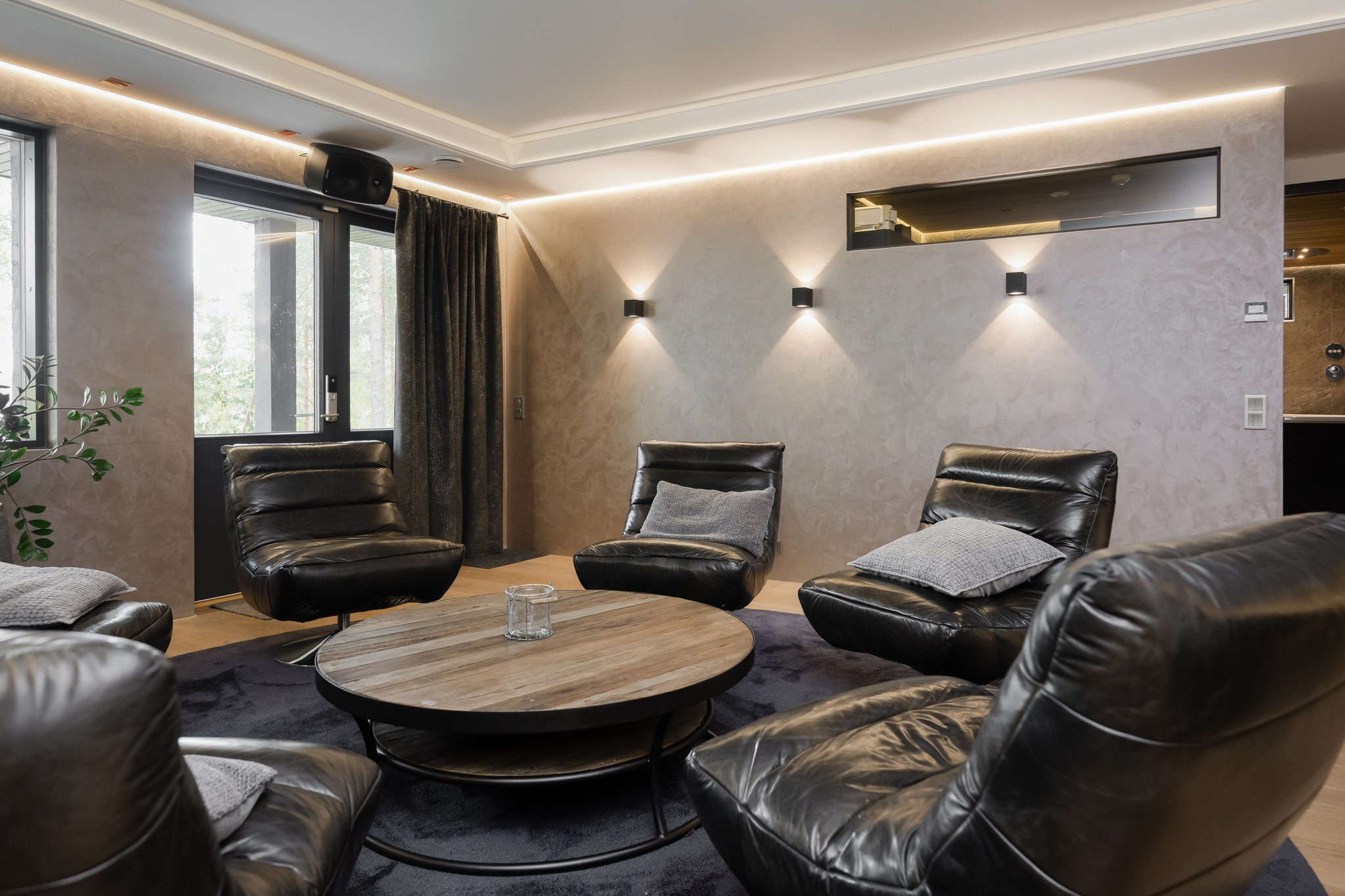 • Leffateatteri: Oma kotiteatteri takaa elokuvaillat parhaalla mahdollisella tavalla. Tilassa on huippuluokan Genelec 7.2.4 audiojärjestelmä. Leffateatterin äänentoisto on myös osa koko talon kattavaa 28 kaiuttimen monihuonejärjestelmää.