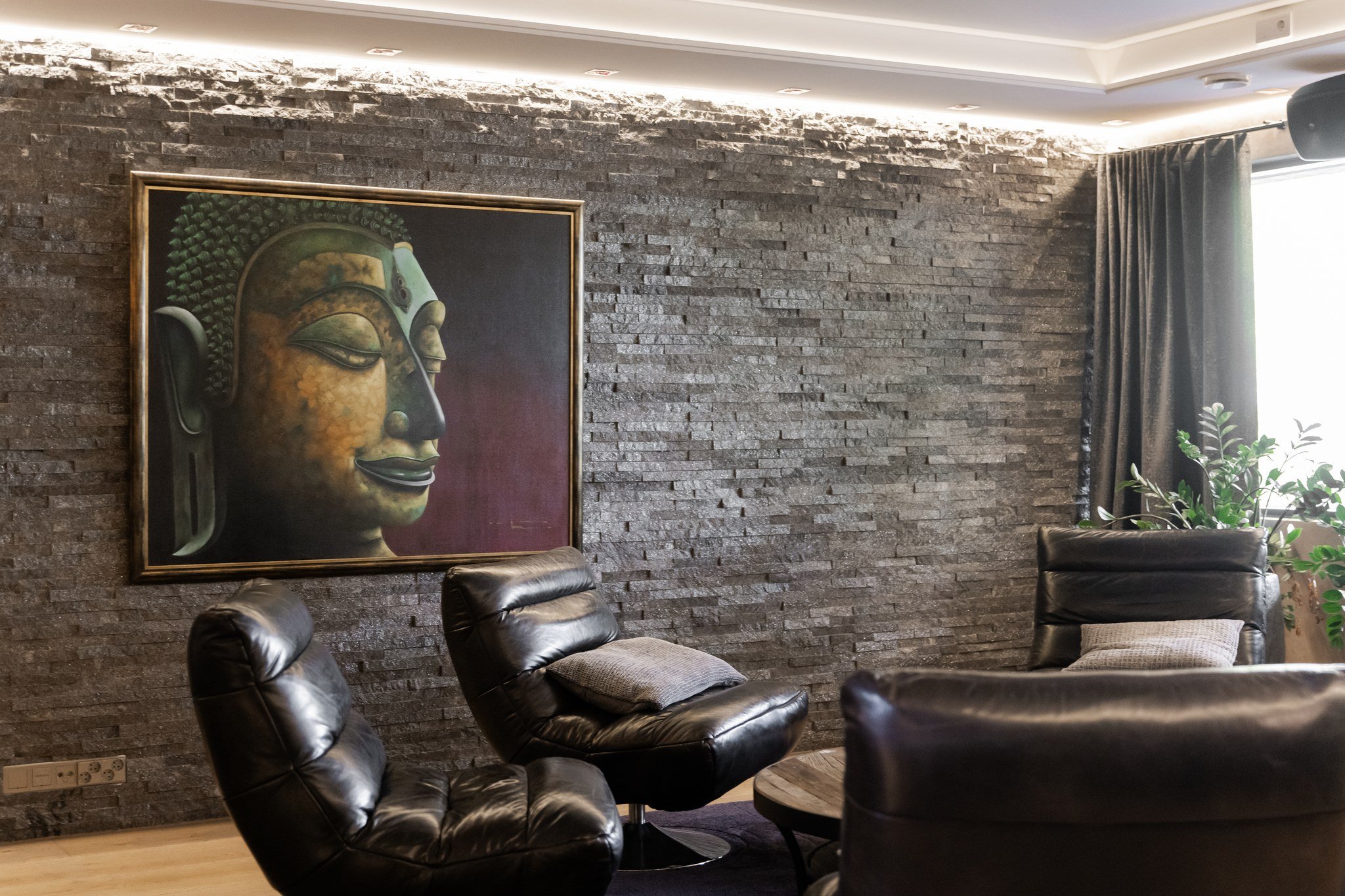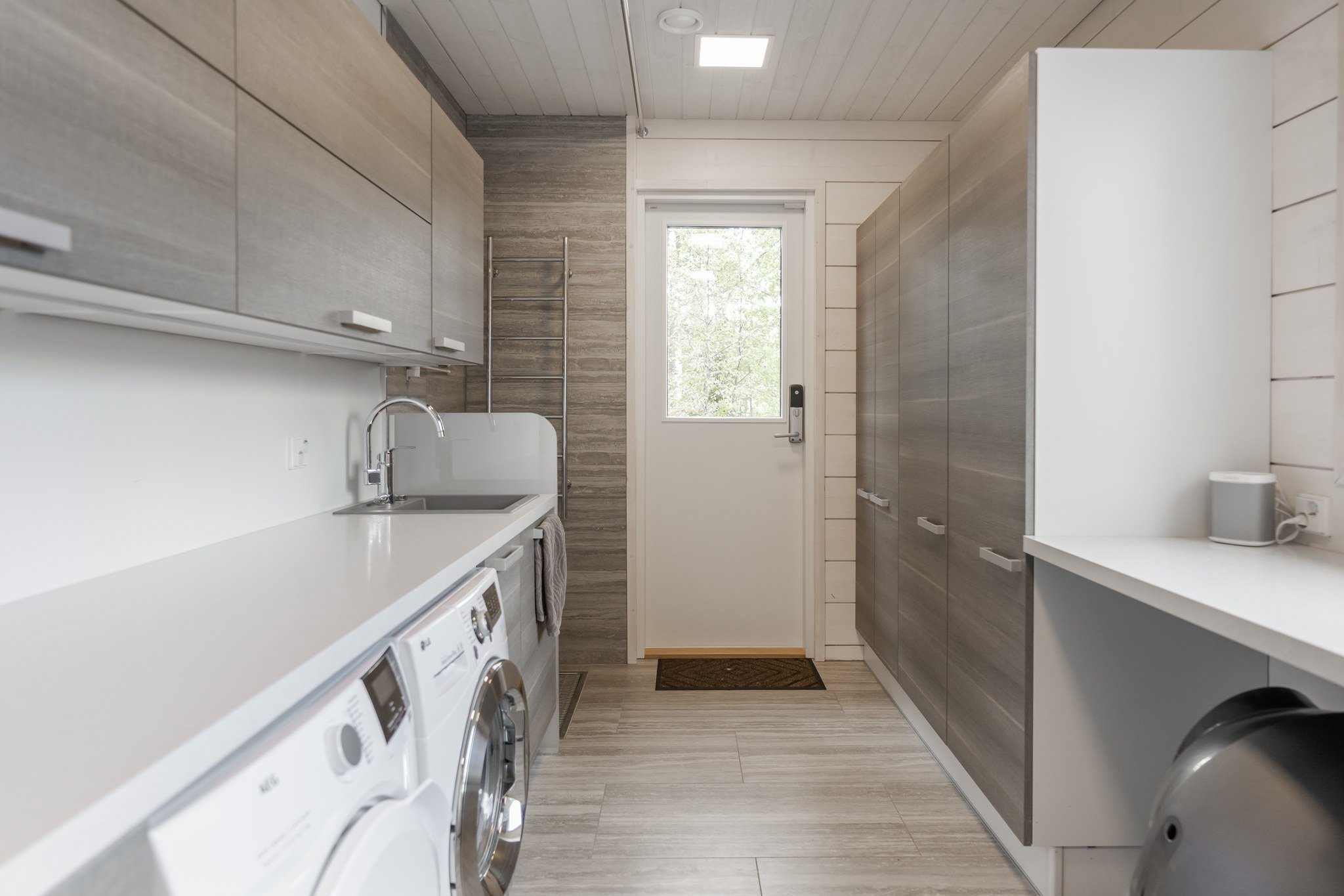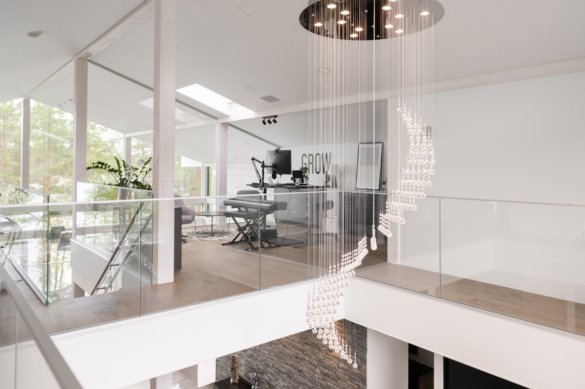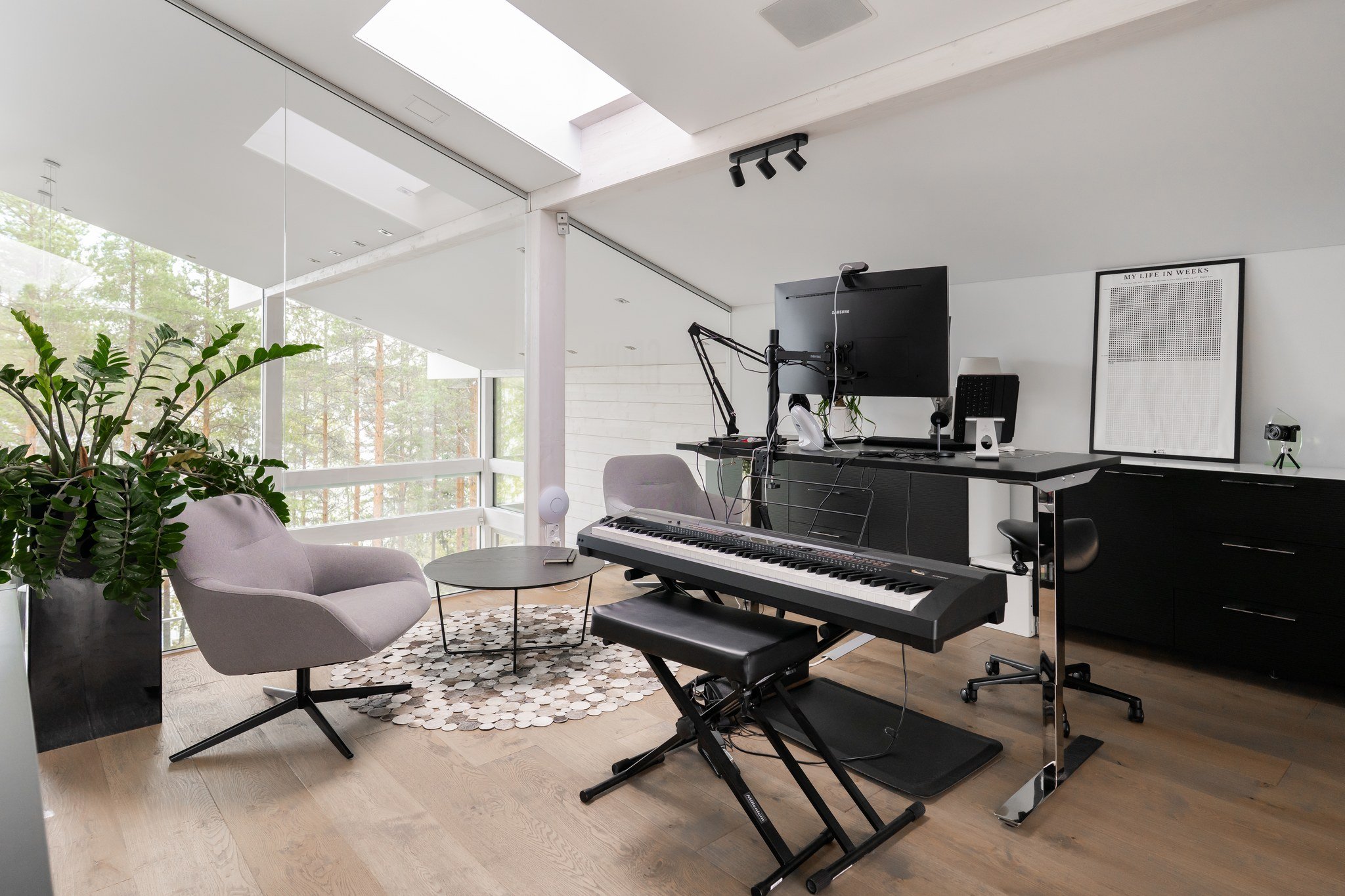 • Leffateatteri: Oma kotiteatteri takaa elokuvaillat parhaalla mahdollisella tavalla. Tilassa on huippuluokan Genelec 7.2.4 audiojärjestelmä. Leffateatterin äänentoisto on myös osa koko talon kattavaa 28 kaiuttimen monihuonejärjestelmää.