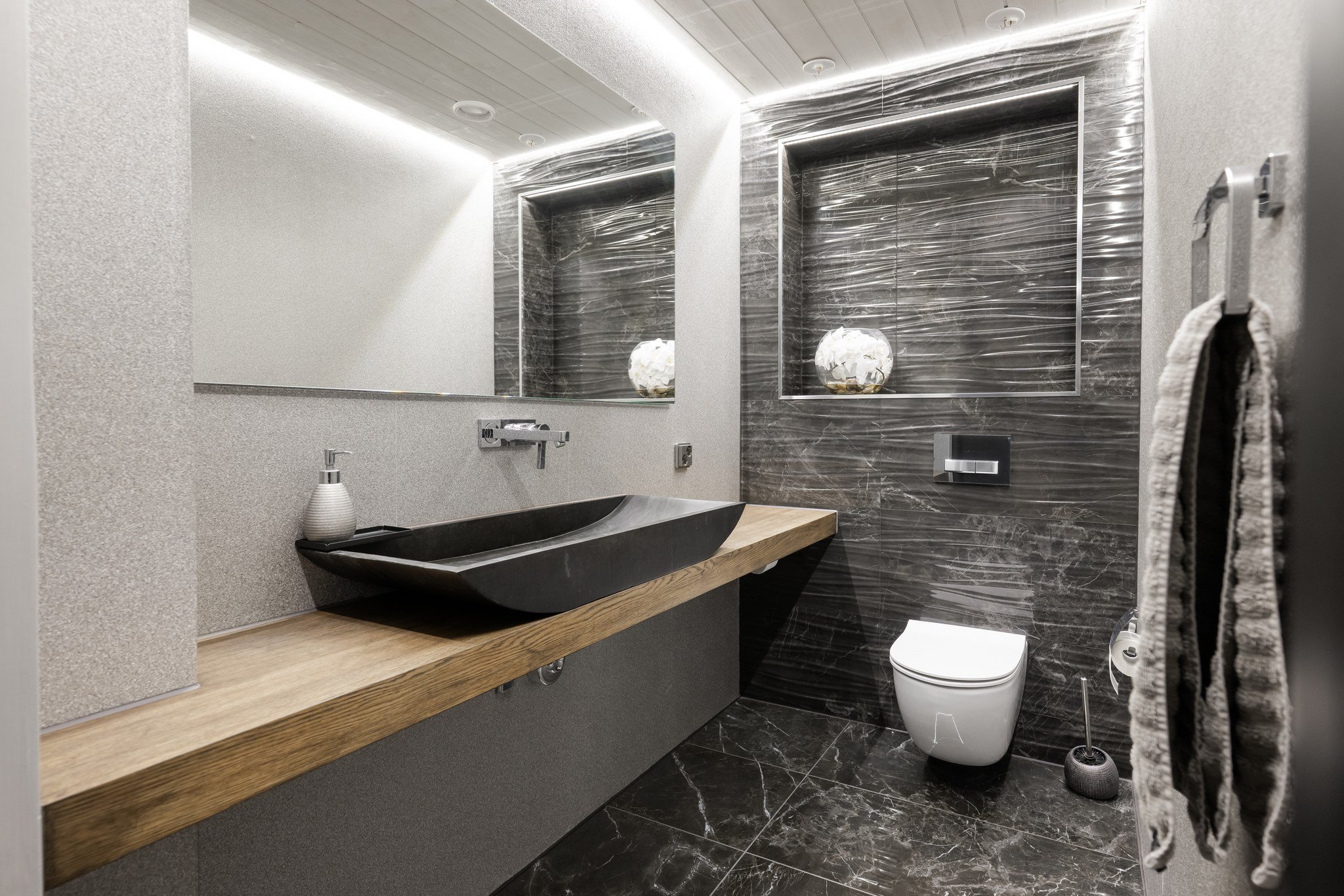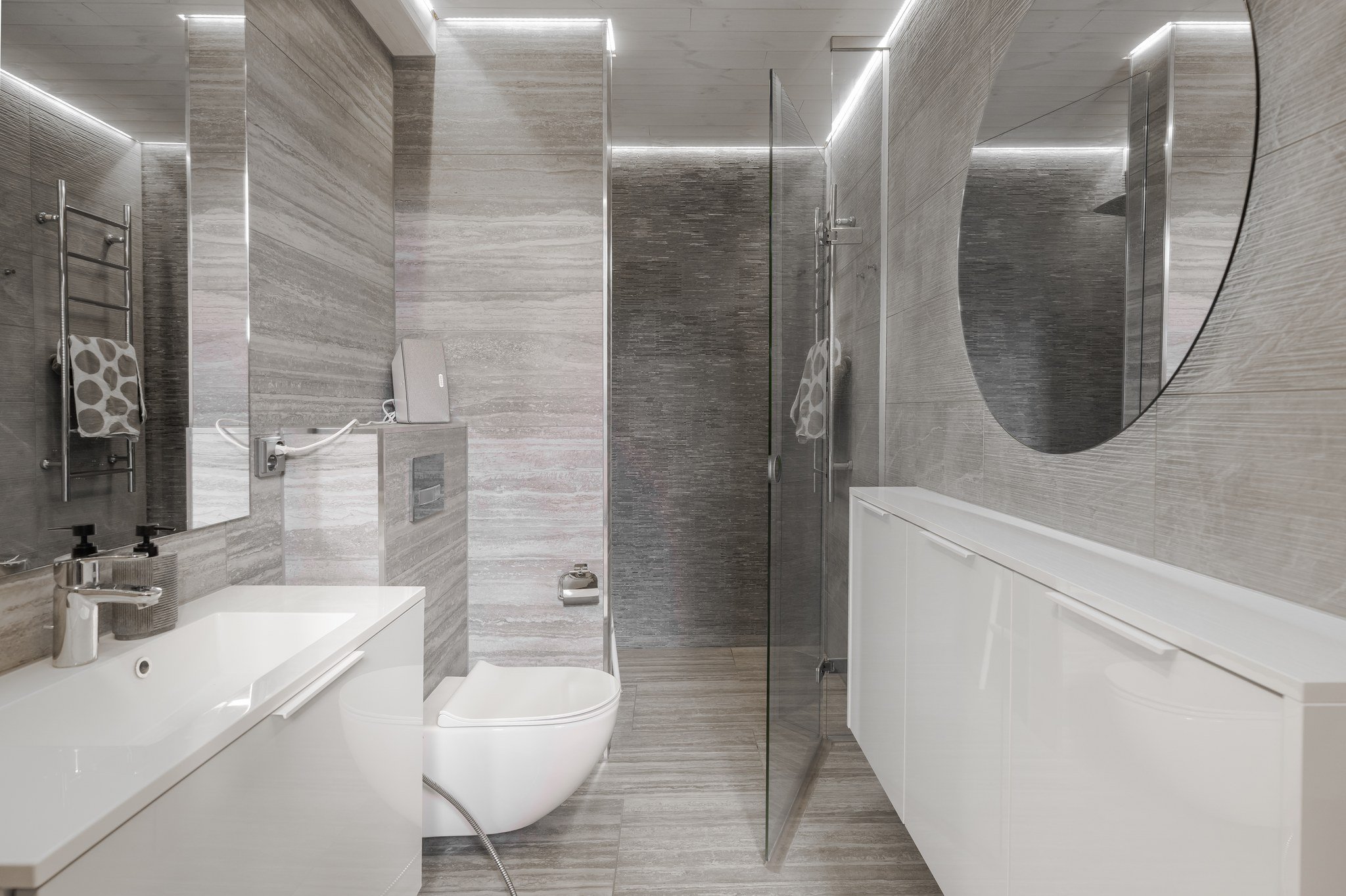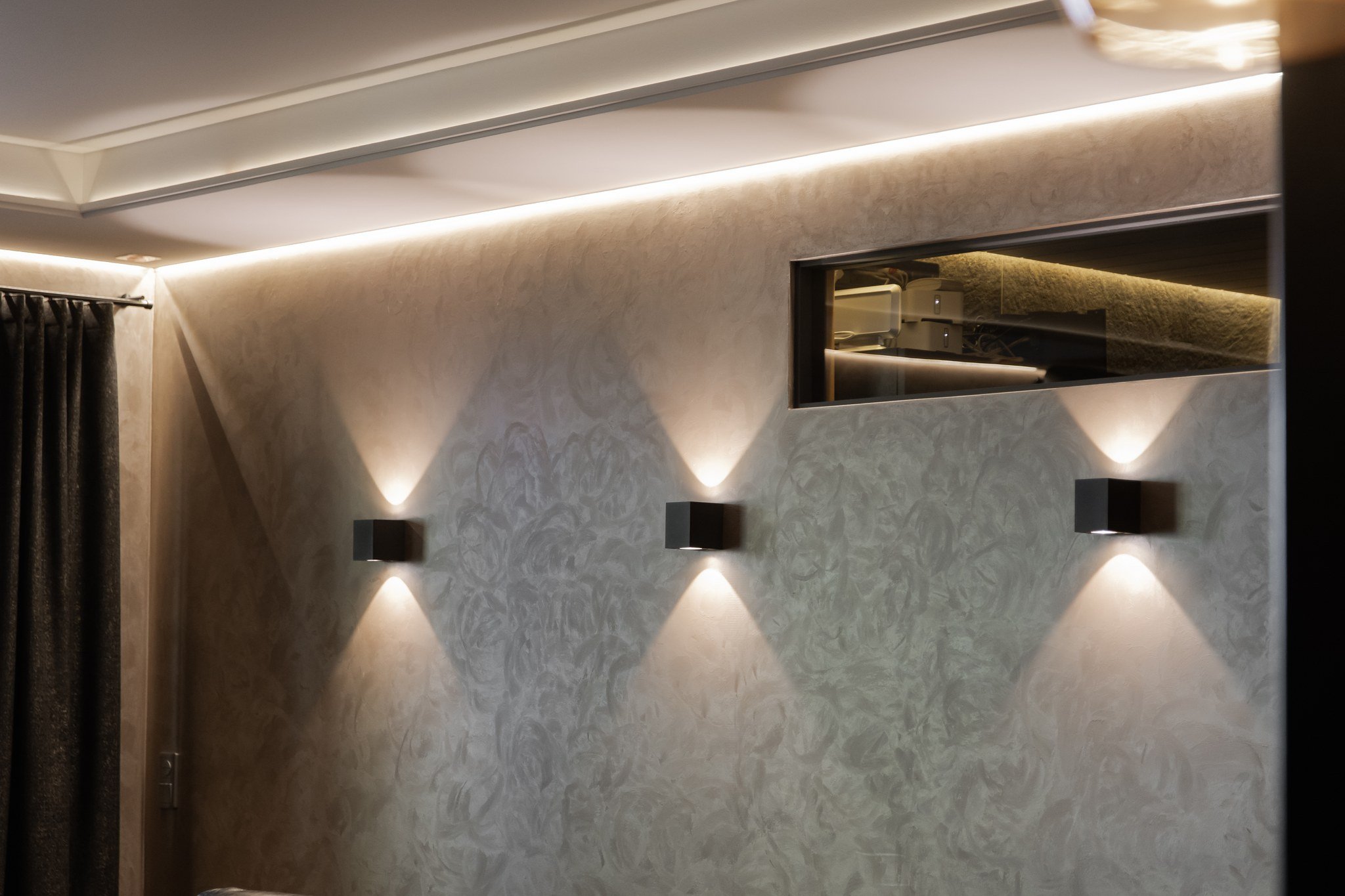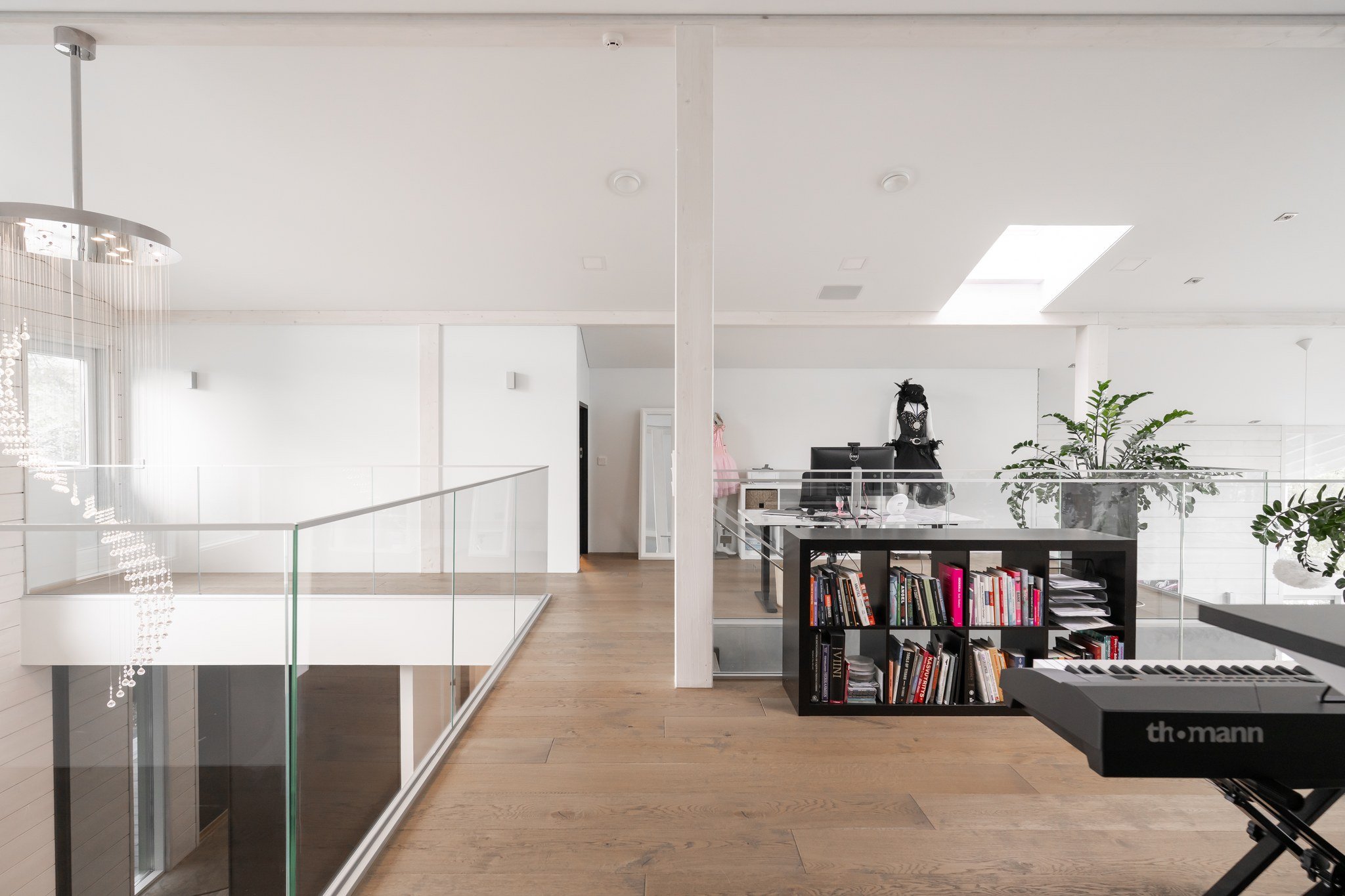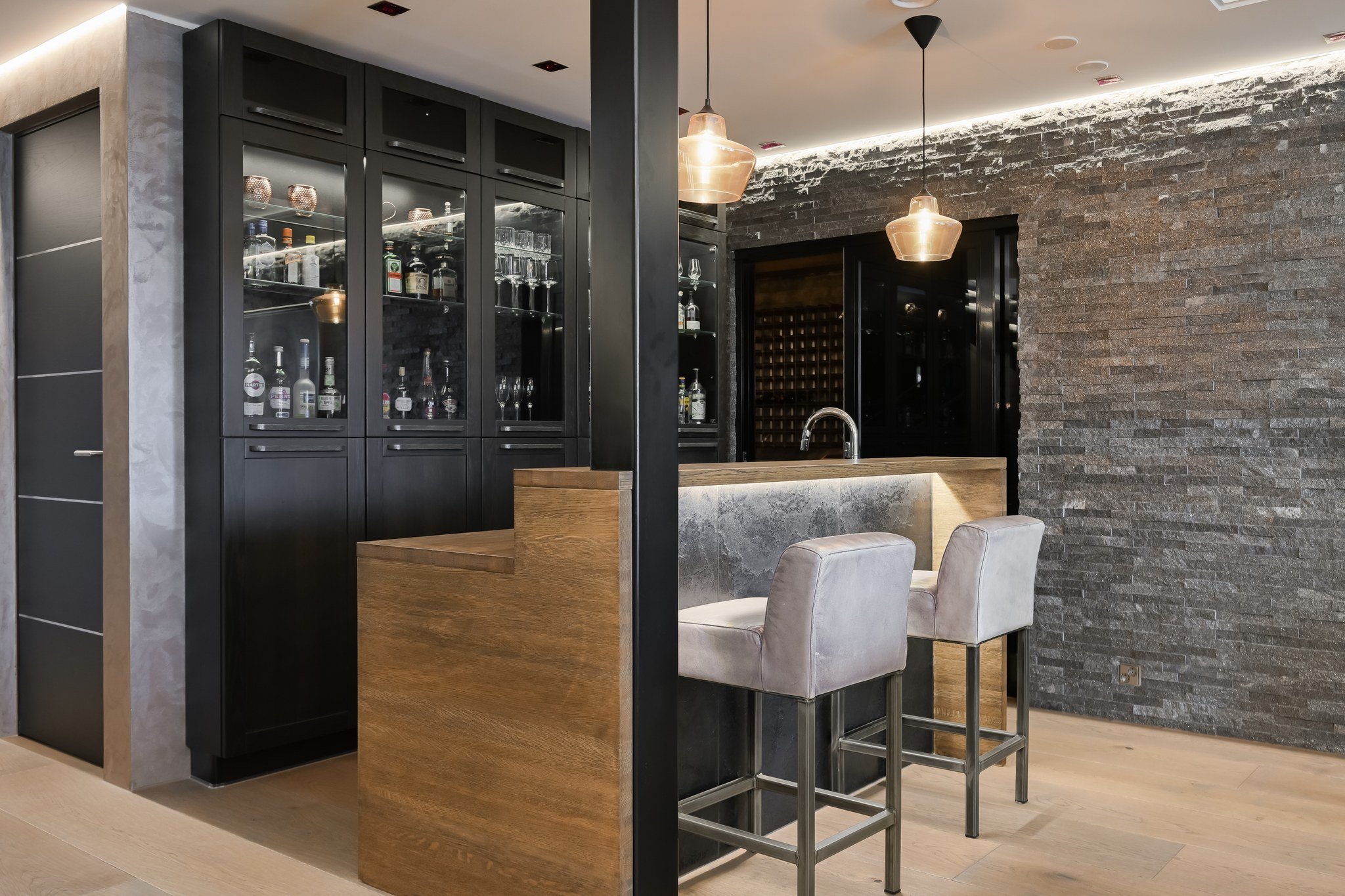 • Leffateatteri: Oma kotiteatteri takaa elokuvaillat parhaalla mahdollisella tavalla. Tilassa on huippuluokan Genelec 7.2.4 audiojärjestelmä. Leffateatterin äänentoisto on myös osa koko talon kattavaa 28 kaiuttimen monihuonejärjestelmää.