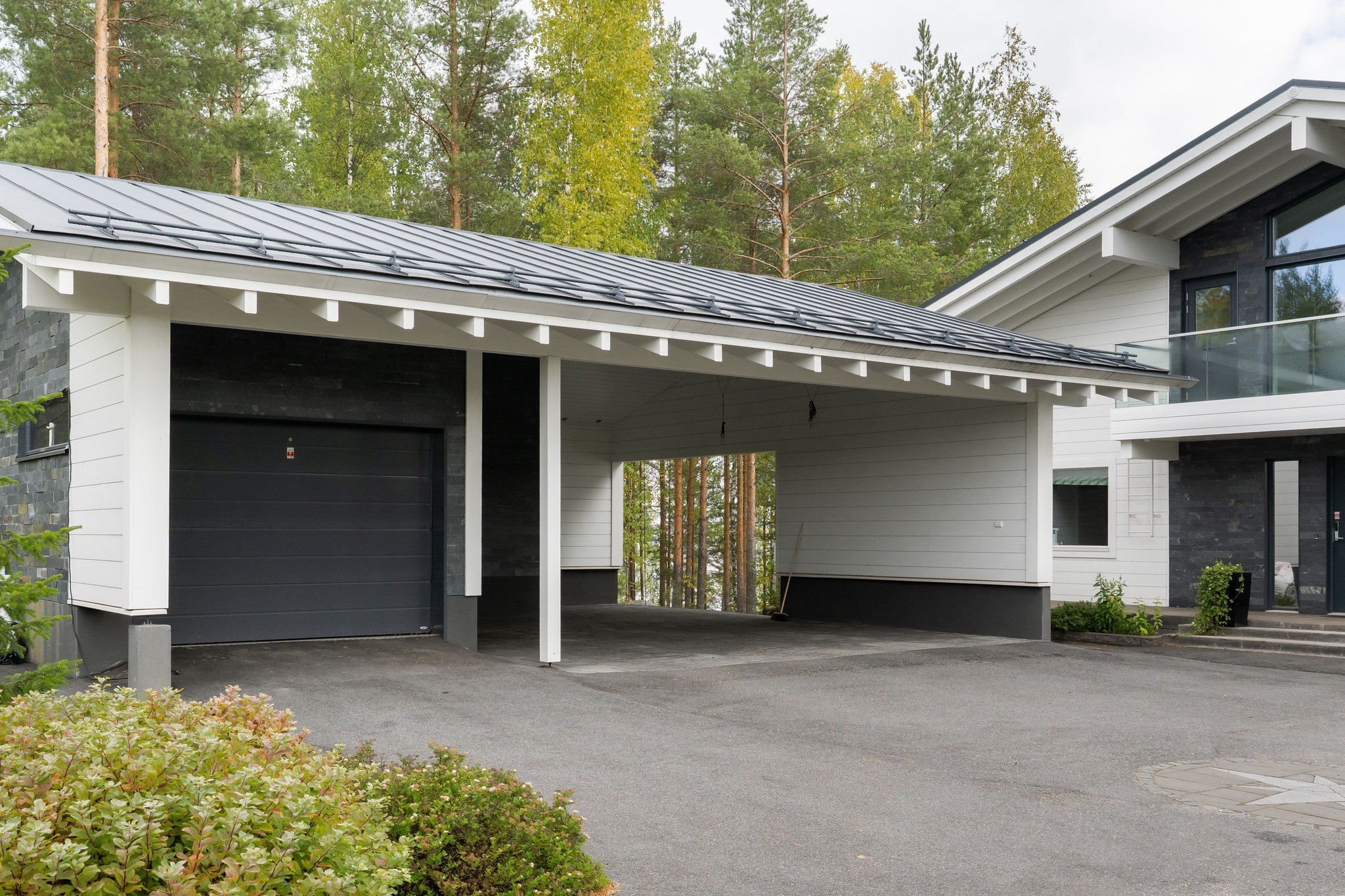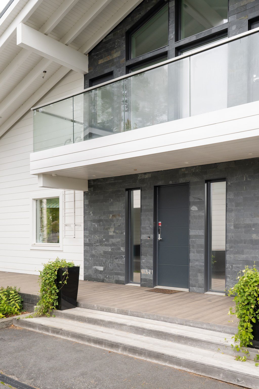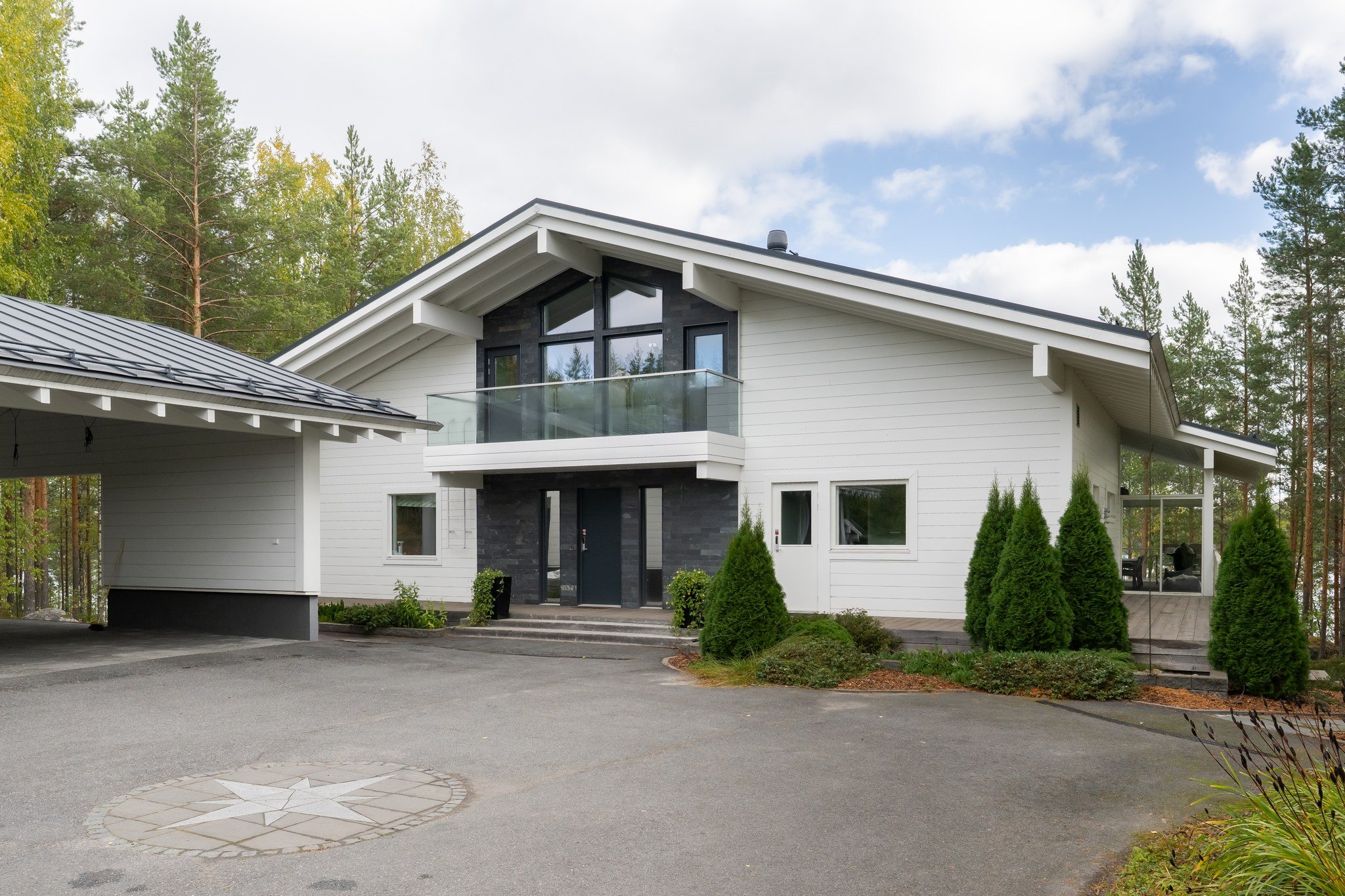 Ulkotilat ovat yhtä vaikuttavat kuin sisätilatkin. Talon kaunis terassi avautuu järvelle ja lasitettu parveke tarjoaa rauhallisen paikan aamukahville. Piha on osittain asfaltoitu ja osittain luonnonvarainen, mikä tarjoaa monipuoliset mahdollisuudet pihan käyttöön.