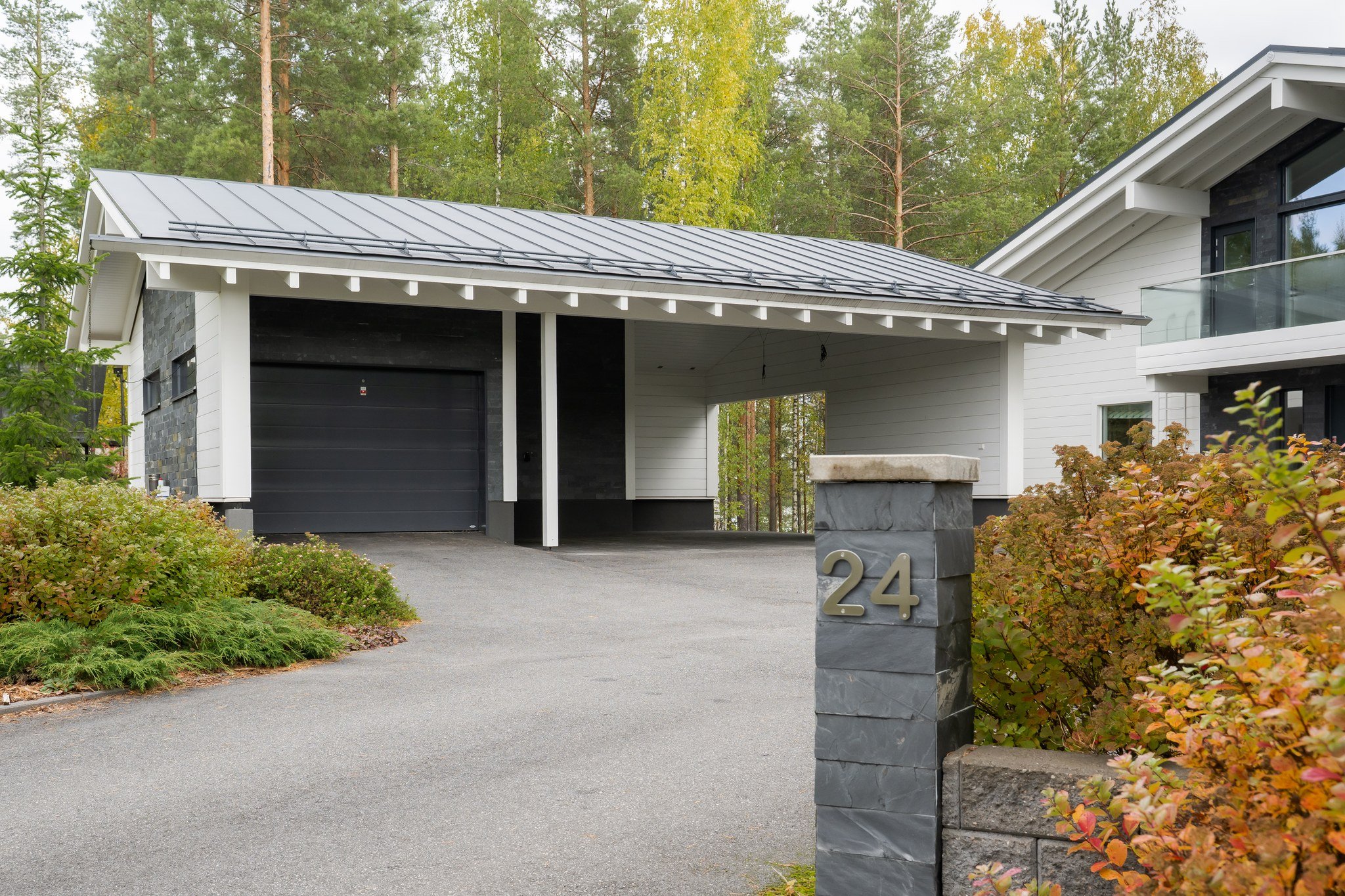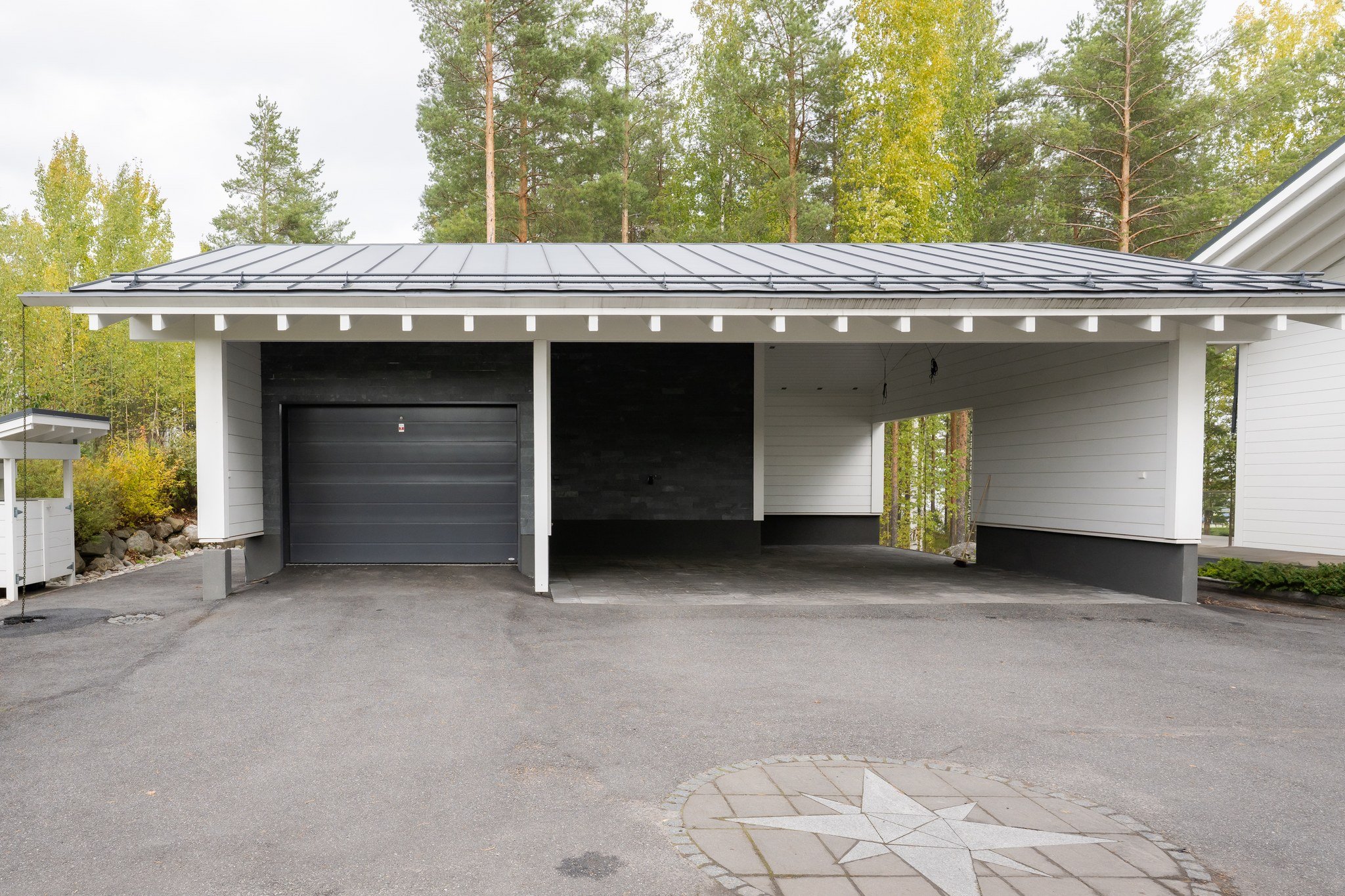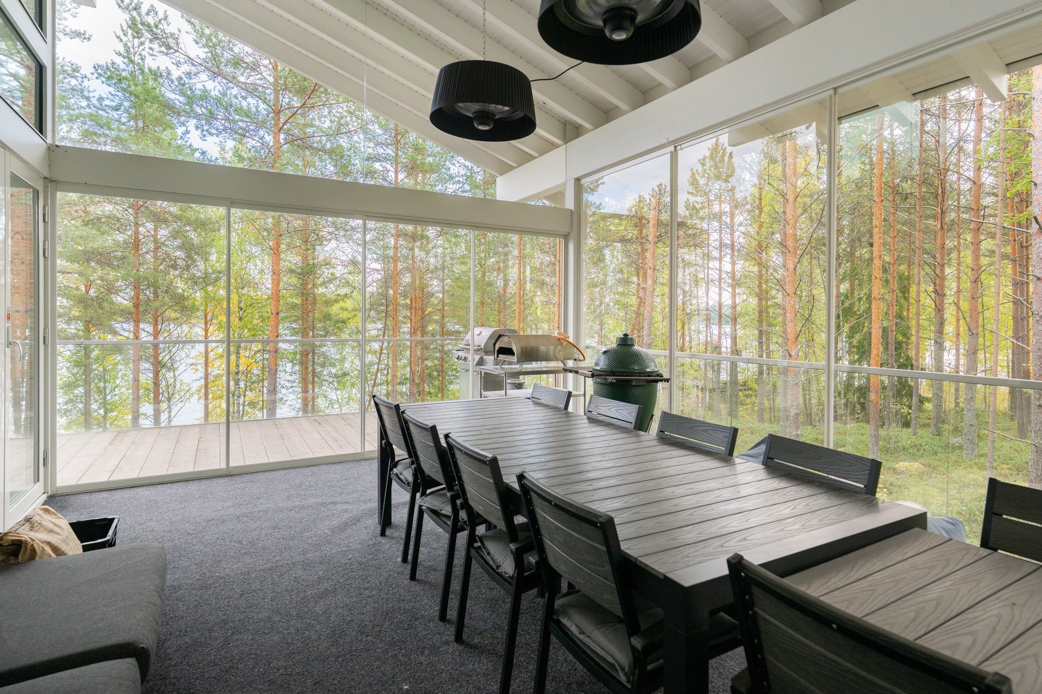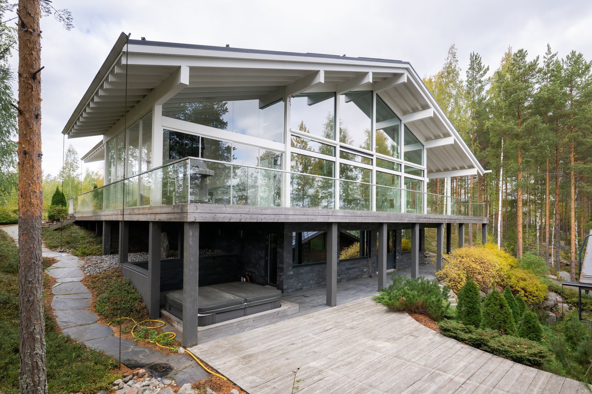 Ulkotilat ovat yhtä vaikuttavat kuin sisätilatkin. Talon kaunis terassi avautuu järvelle ja lasitettu parveke tarjoaa rauhallisen paikan aamukahville. Piha on osittain asfaltoitu ja osittain luonnonvarainen, mikä tarjoaa monipuoliset mahdollisuudet pihan käyttöön.