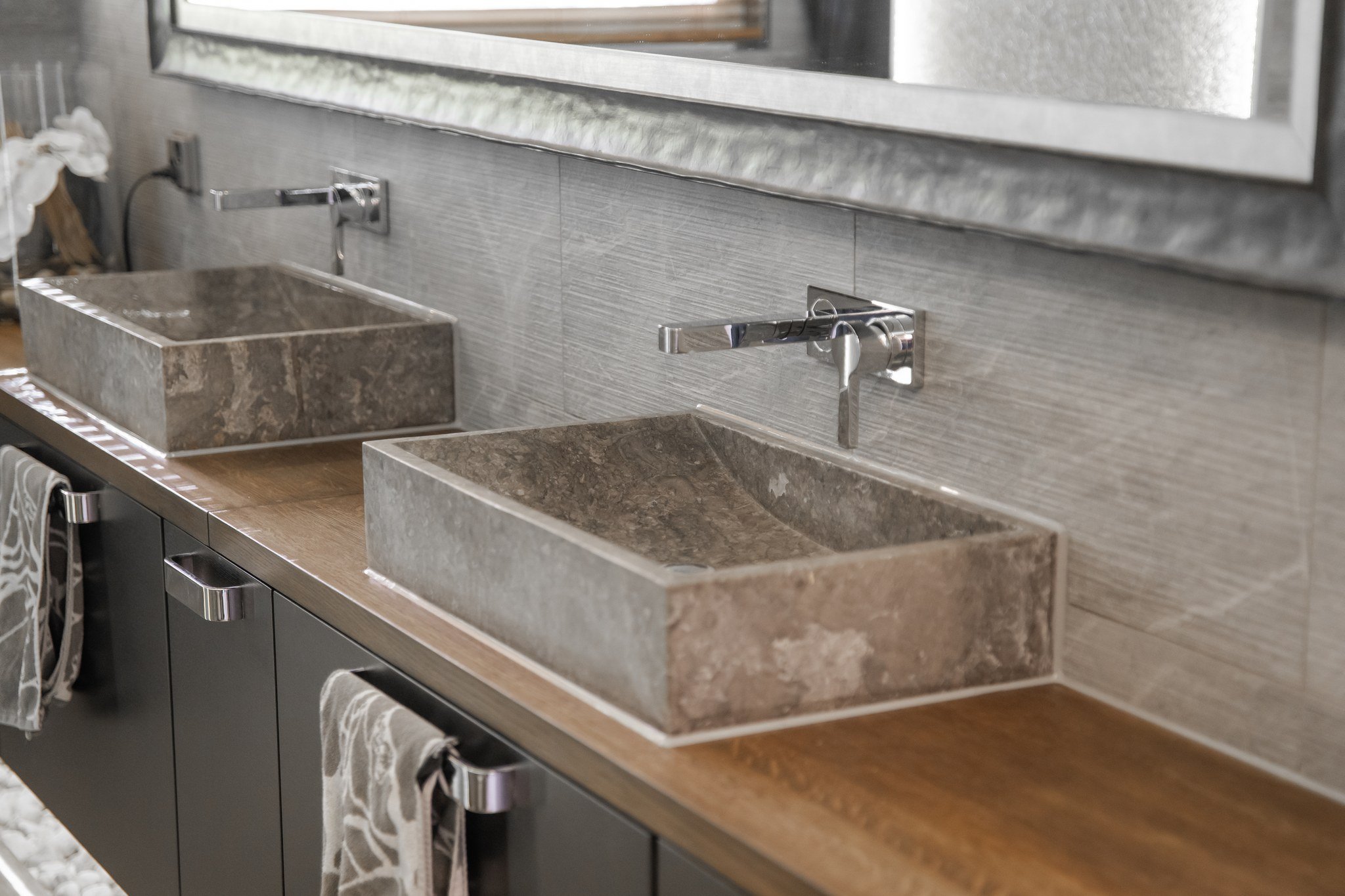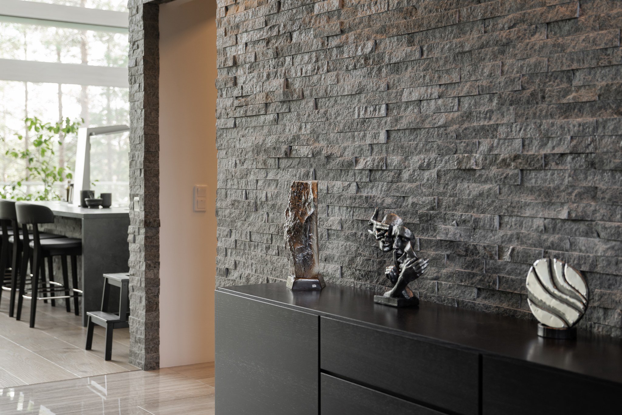 Talon jokainen yksityiskohta on suunniteltu tarkkaan ja toteutettu ensiluokkaisista materiaaleista. Sisätiloissa toistuu laadukas ja harmoninen värimaailma. Lattiat ovat pääosin käsinveistettyä antiikkipintaista Trinity-tammilankkua, jonka sävy on tumma Eben-Poppeli. Useissa tiloissa on näyttäviä tehosteseiniä kivipinnoilla tai erikoismaaleilla. Kiintokalusteista näkyvin osa on puusepäntyönä toteutettua massiivitammea ja osa Puustellin mallistosta.