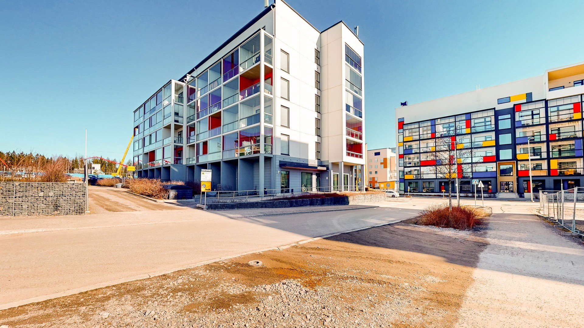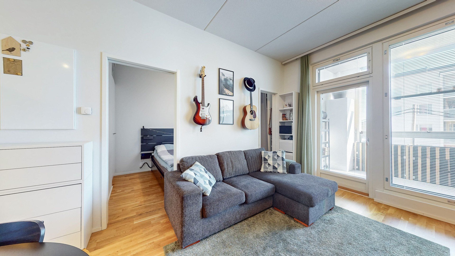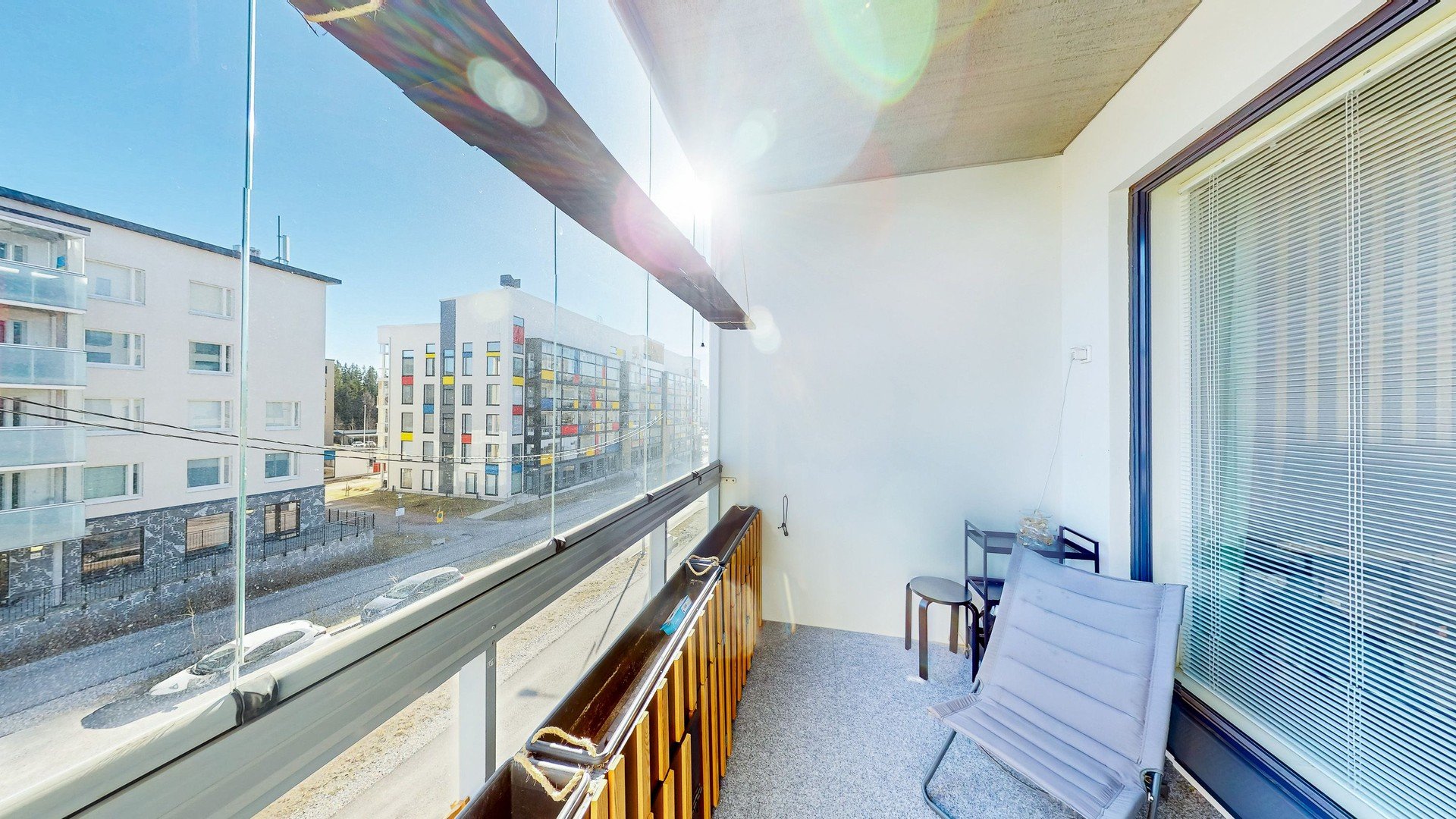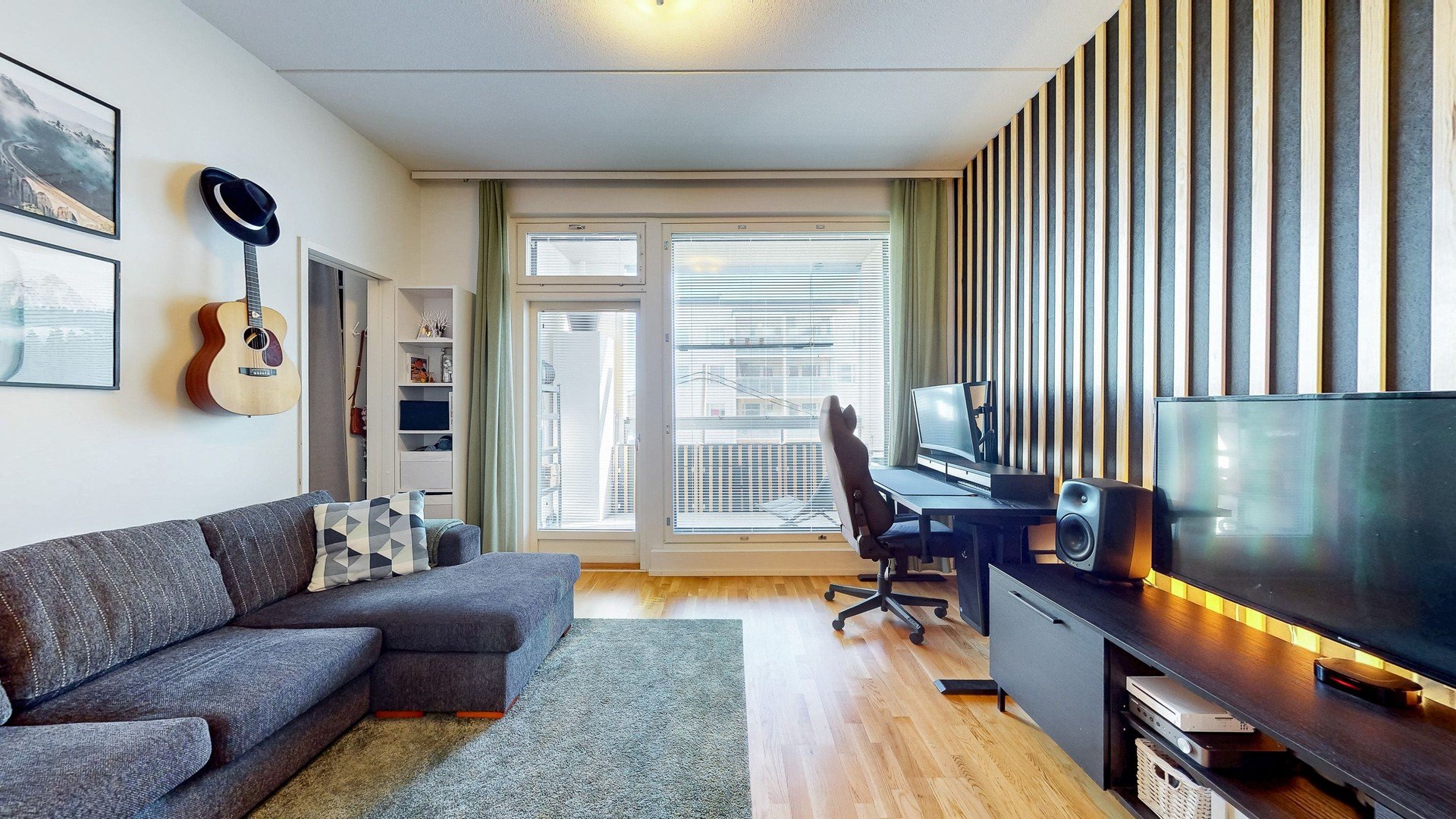 Tässä kolmannen kerroksen asunnossa on lasitettu parveke, jolta avautuu itään suuntautuva näkymä. Asunnon pohjaratkaisu on toimiva ja tilava, ja sen hyväkuntoiset pinnat sekä parkettilattiat tuovat viihtyisyyttä. Asunnon olohuonetta on sisustettu äänieriste-/tehosteseinällä, joka on jätettävissä tai poistettavissa ostajan toiveiden mukaisesti. Makuuhuoneessa on ikkunoita kahdella seinällä, mikä tuo valoisuutta asuntoon. Makuuhuoneen isoin ikkuna sijaitsee irrallisen säilytysratkaisun takana. Keittiö on varusteltu nykyaikaisilla kodinkoneilla, kuten jääkaappi-pakastimella, erillisellä uunilla ja keraamisella liedellä. Kylpyhuoneessa on lattialämmitys, suihkuseinä ja pesukoneliitäntä.