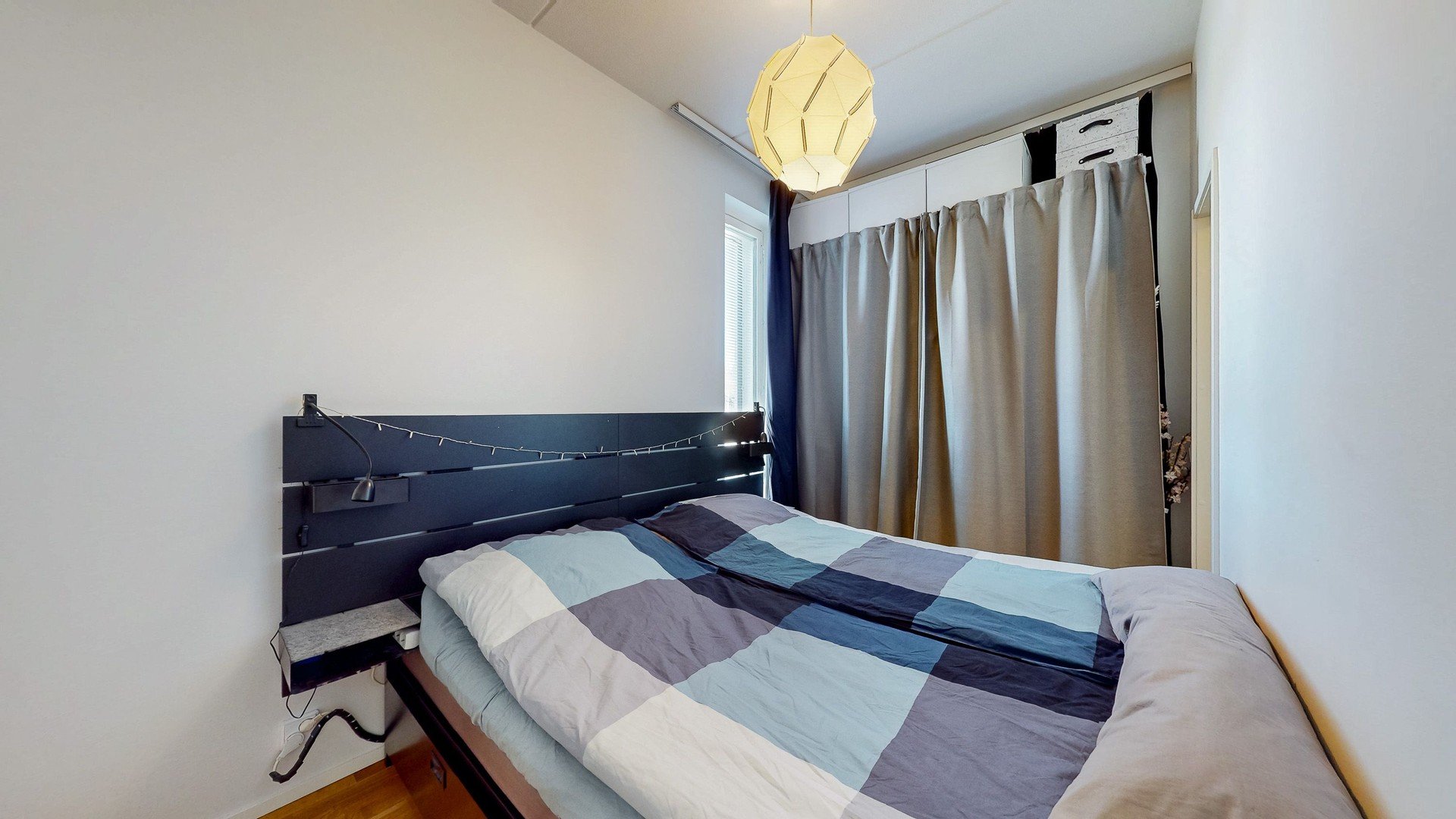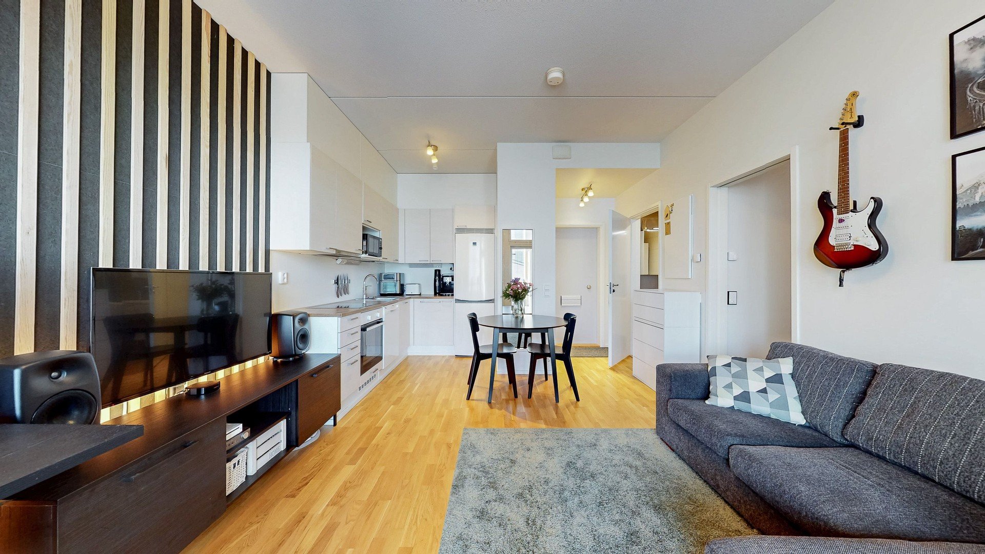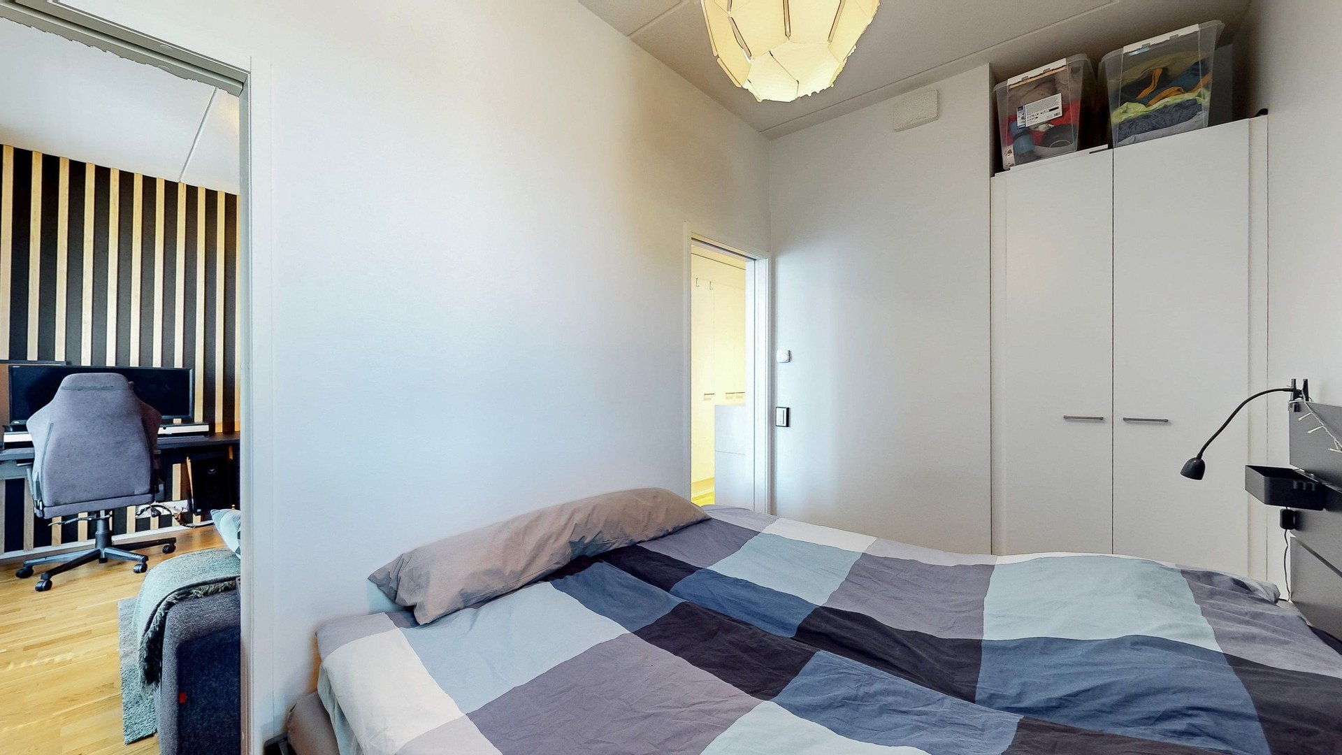 Tässä kolmannen kerroksen asunnossa on lasitettu parveke, jolta avautuu itään suuntautuva näkymä. Asunnon pohjaratkaisu on toimiva ja tilava, ja sen hyväkuntoiset pinnat sekä parkettilattiat tuovat viihtyisyyttä. Asunnon olohuonetta on sisustettu äänieriste-/tehosteseinällä, joka on jätettävissä tai poistettavissa ostajan toiveiden mukaisesti. Makuuhuoneessa on ikkunoita kahdella seinällä, mikä tuo valoisuutta asuntoon. Makuuhuoneen isoin ikkuna sijaitsee irrallisen säilytysratkaisun takana. Keittiö on varusteltu nykyaikaisilla kodinkoneilla, kuten jääkaappi-pakastimella, erillisellä uunilla ja keraamisella liedellä. Kylpyhuoneessa on lattialämmitys, suihkuseinä ja pesukoneliitäntä.