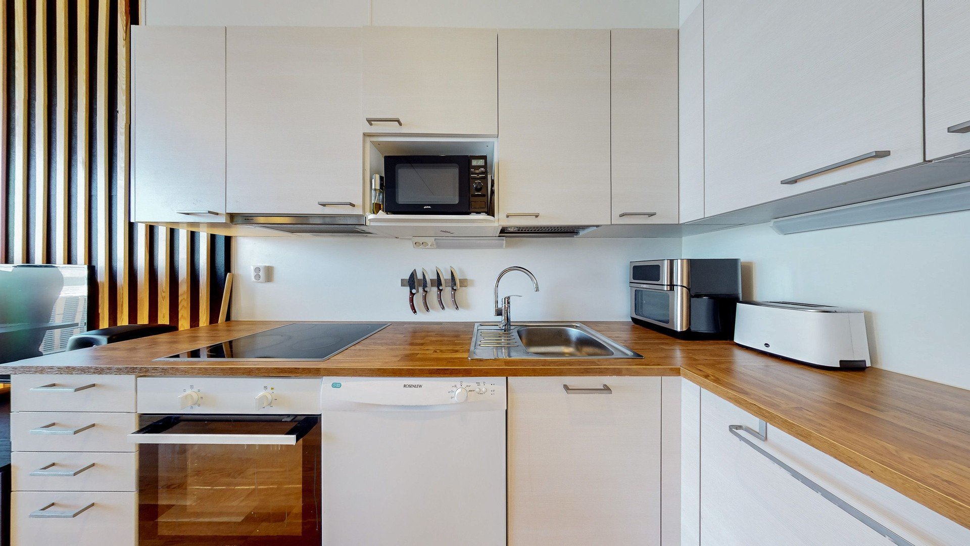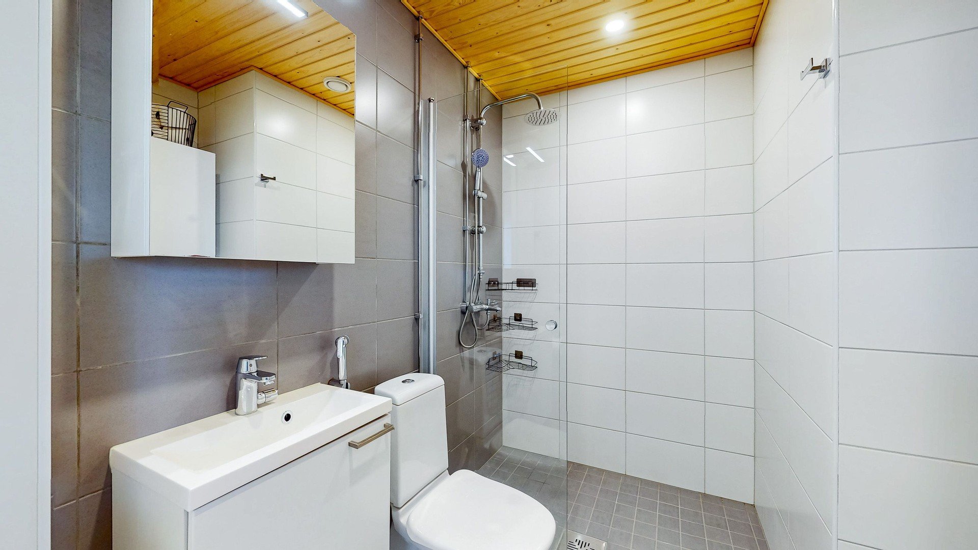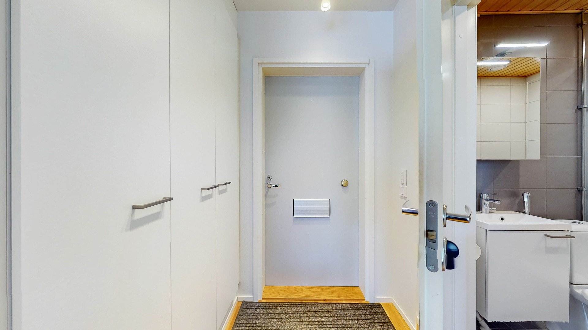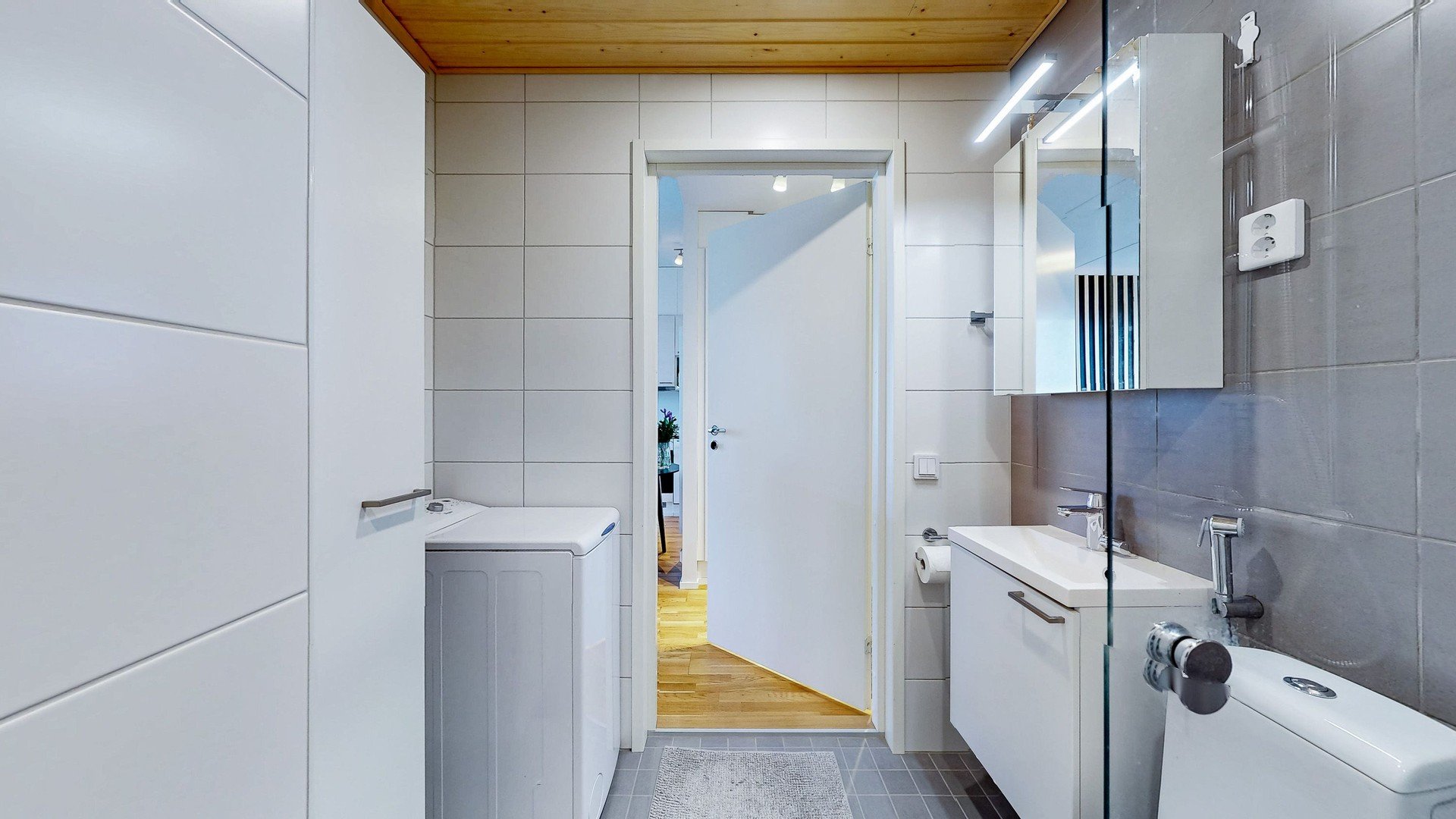 Tässä kolmannen kerroksen asunnossa on lasitettu parveke, jolta avautuu itään suuntautuva näkymä. Asunnon pohjaratkaisu on toimiva ja tilava, ja sen hyväkuntoiset pinnat sekä parkettilattiat tuovat viihtyisyyttä. Asunnon olohuonetta on sisustettu äänieriste-/tehosteseinällä, joka on jätettävissä tai poistettavissa ostajan toiveiden mukaisesti. Makuuhuoneessa on ikkunoita kahdella seinällä, mikä tuo valoisuutta asuntoon. Makuuhuoneen isoin ikkuna sijaitsee irrallisen säilytysratkaisun takana. Keittiö on varusteltu nykyaikaisilla kodinkoneilla, kuten jääkaappi-pakastimella, erillisellä uunilla ja keraamisella liedellä. Kylpyhuoneessa on lattialämmitys, suihkuseinä ja pesukoneliitäntä.