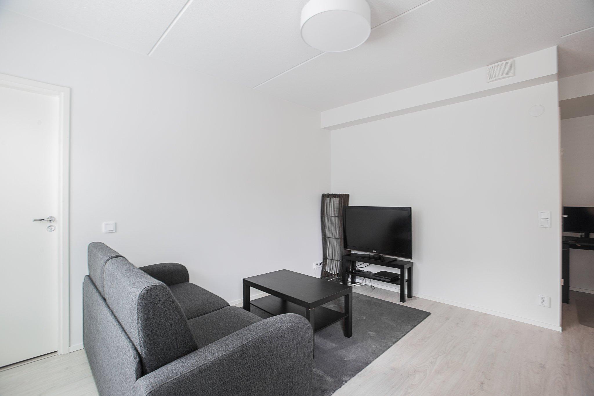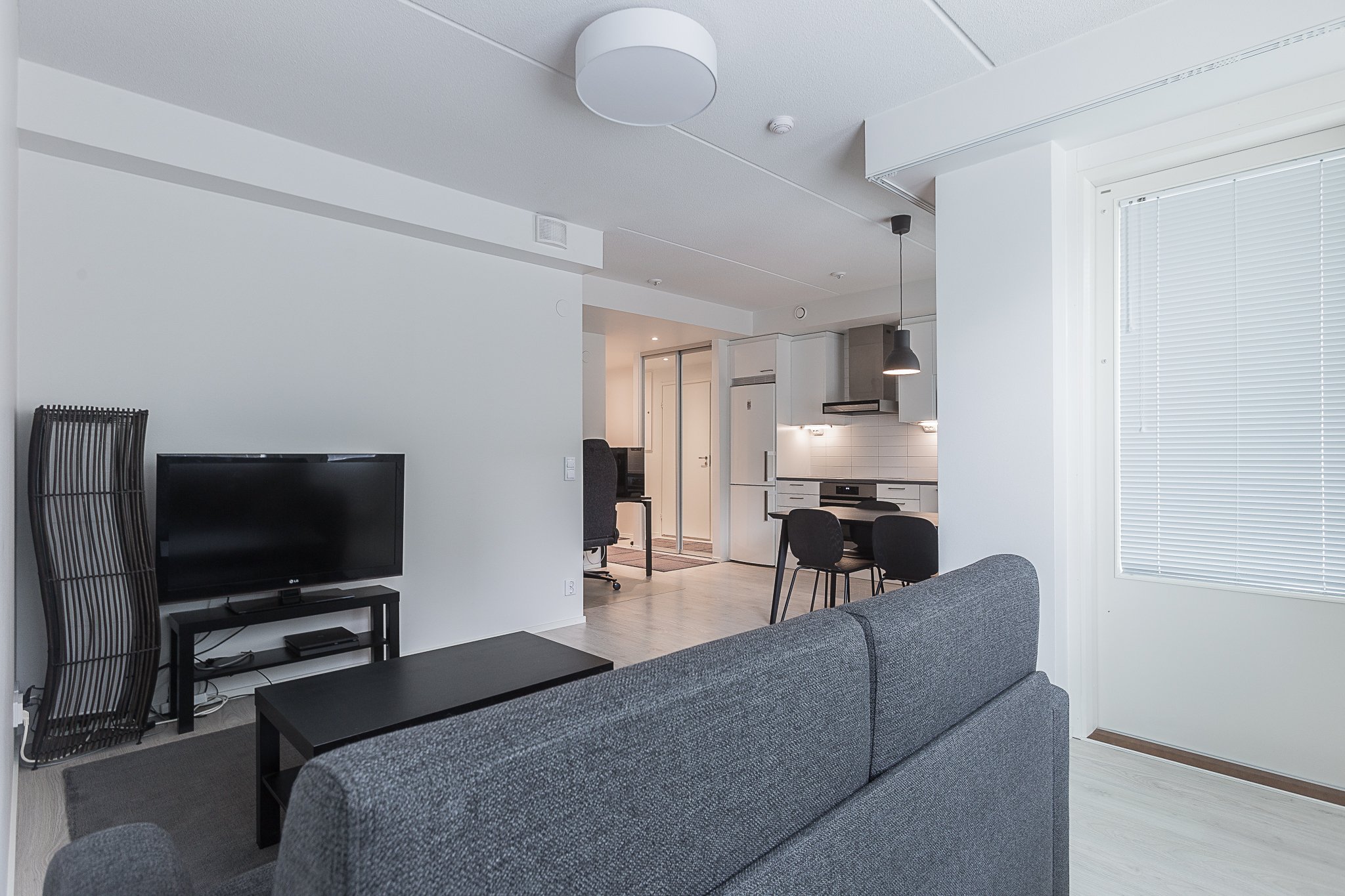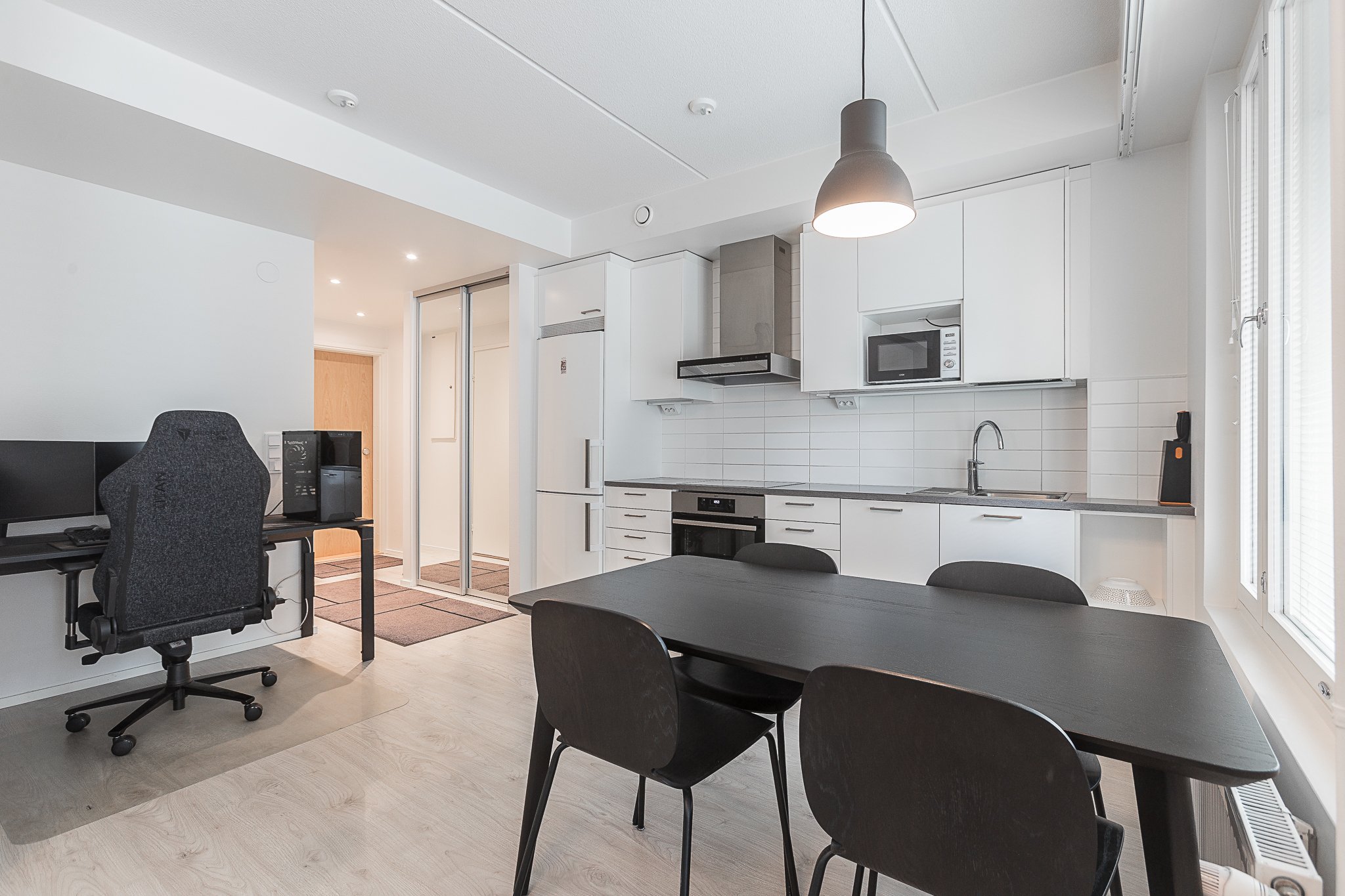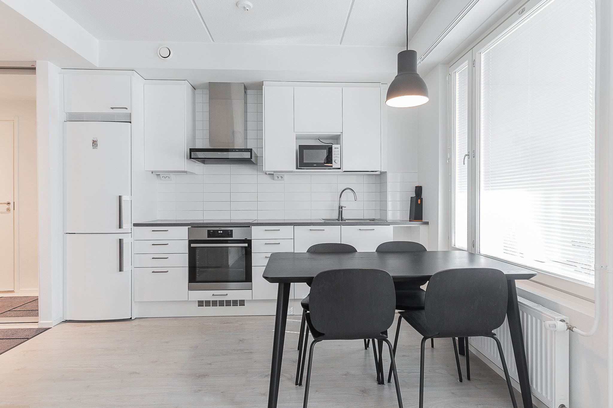 Vaaleansävyisen ja muuttovalmiin kodin avokeittiö sekä olohuone ovat yhtenäistä avaraa tilaa, josta on käynti aurinkoiselle parvekkeelle.