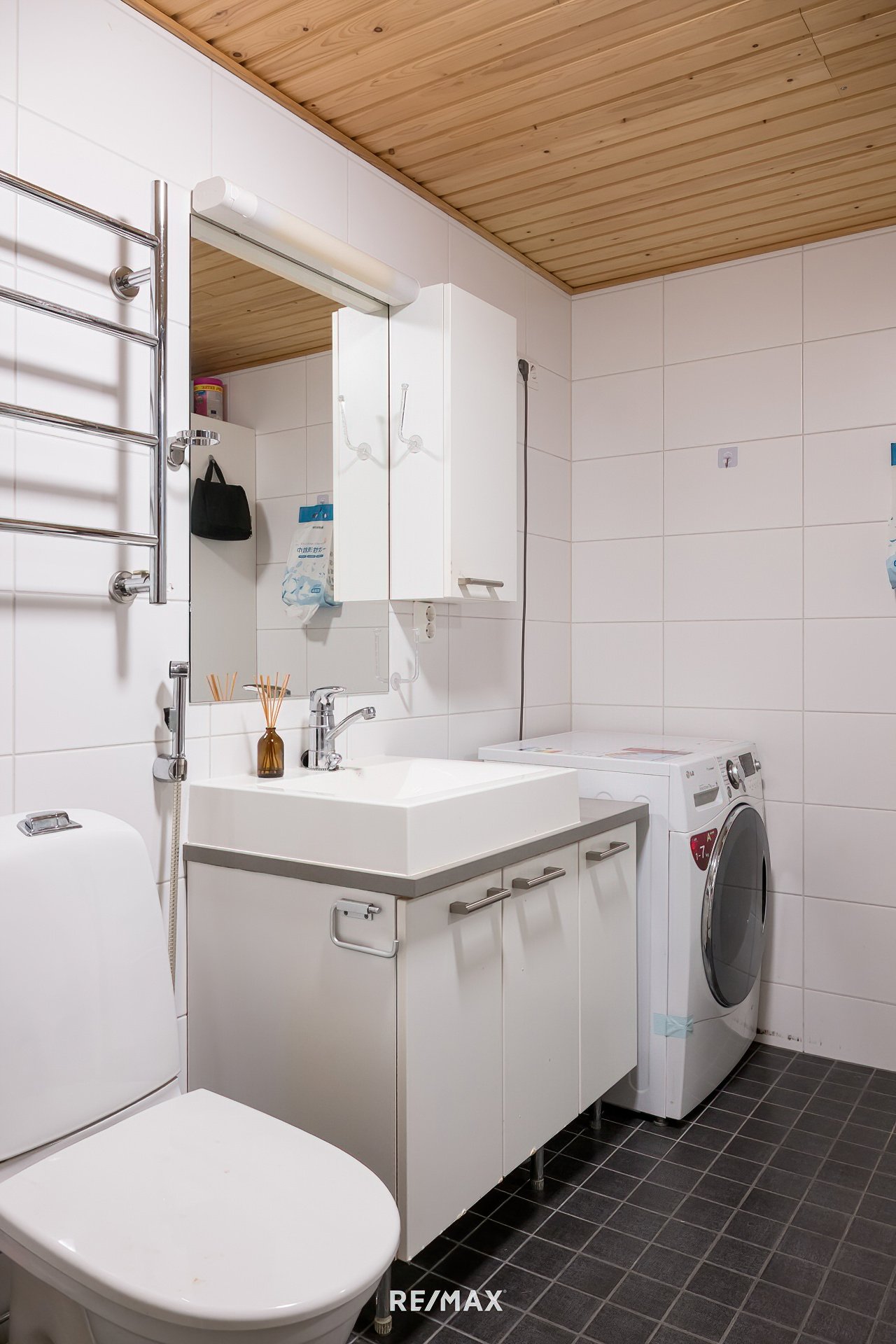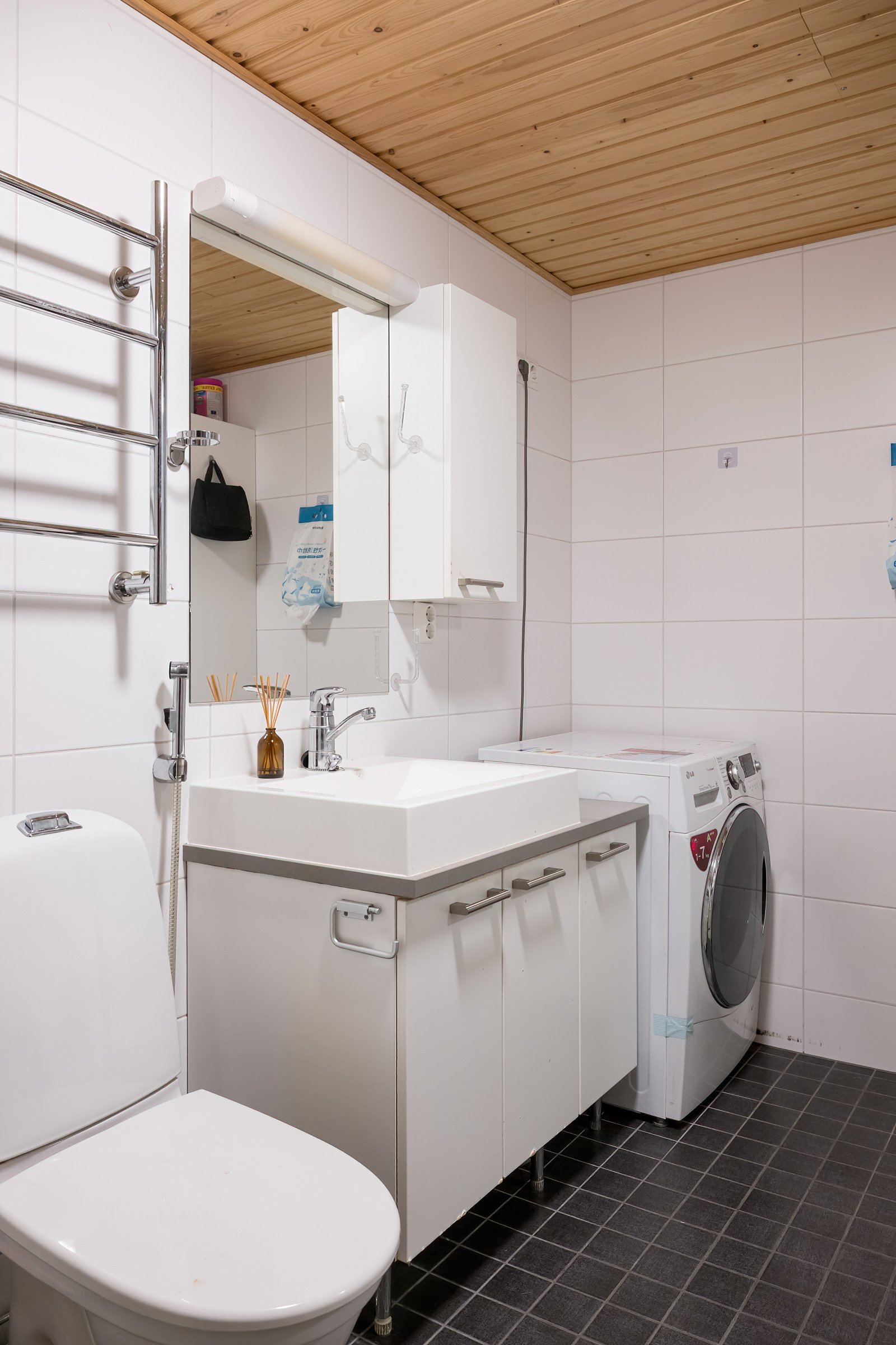 WC-istuin, suihku, suihkuseinä, pesukoneliitäntä, peilikaappi, bidee-suihku, pesuallas ja allaskaappi