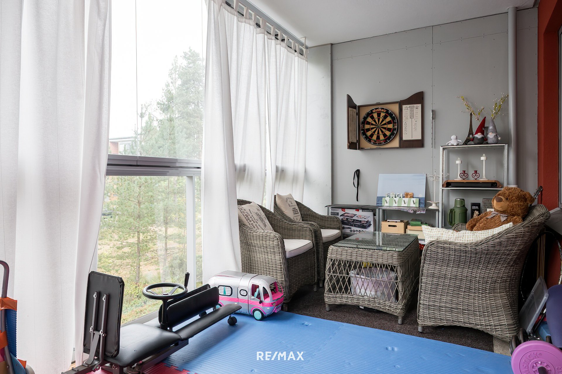 Lasitettu parveke toimii täydellisenä lisätilana – siellä voit nauttia aamukahvit auringonpaisteessa tai rentoutua iltaisin suojassa säältä. Oma sauna tarjoaa puolestaan ihanan hetken rentoutumiseen pitkän päivän jälkeen, tuoden ripauksen arjen luksusta.