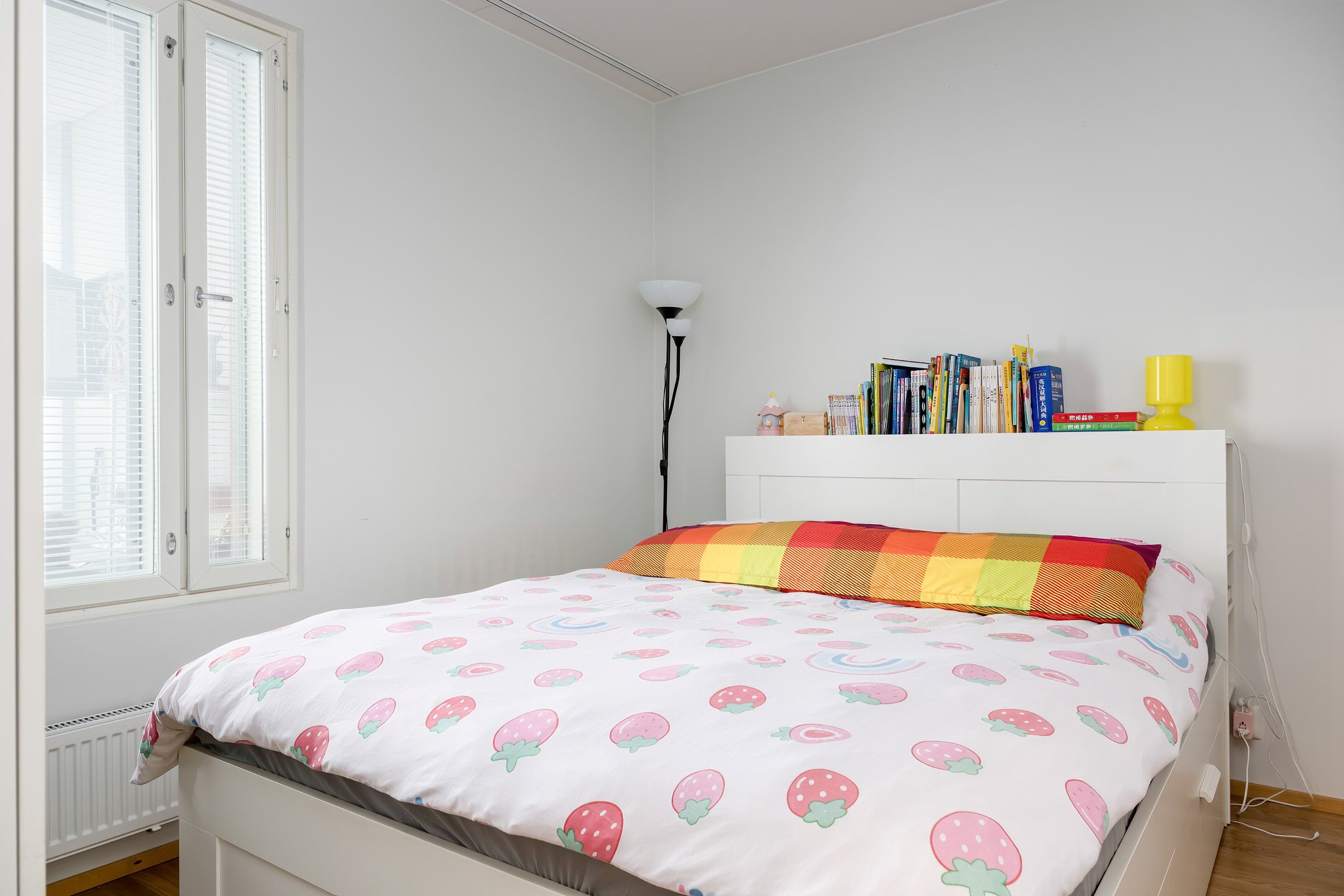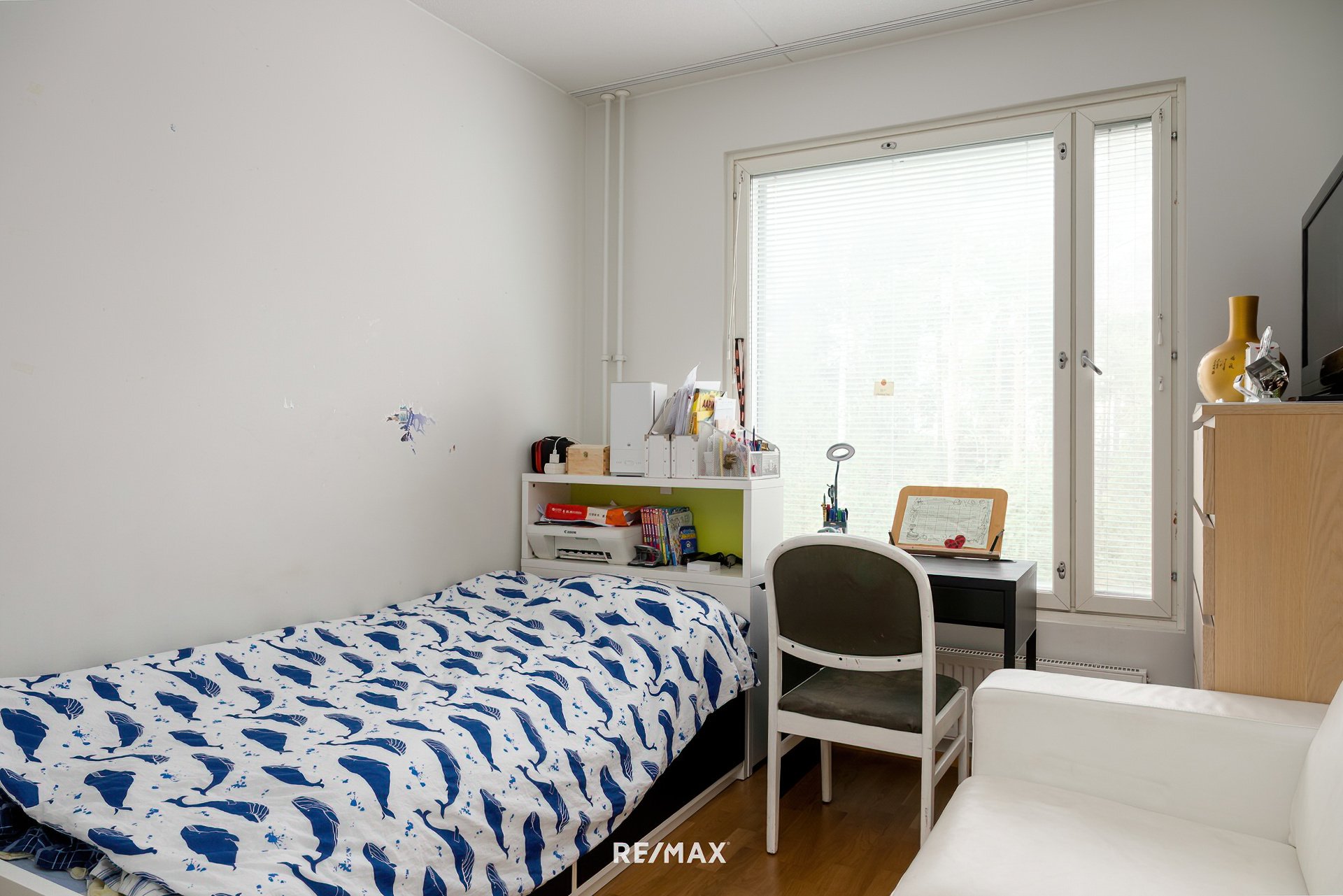 Makuuhuoneet ovat tilavia ja tarjoavat hyvin säilytystilaa. Kodin tunnelma on lämmin ja kutsuva, ja isot ikkunat tuovat runsaasti luonnonvaloa sisään.
