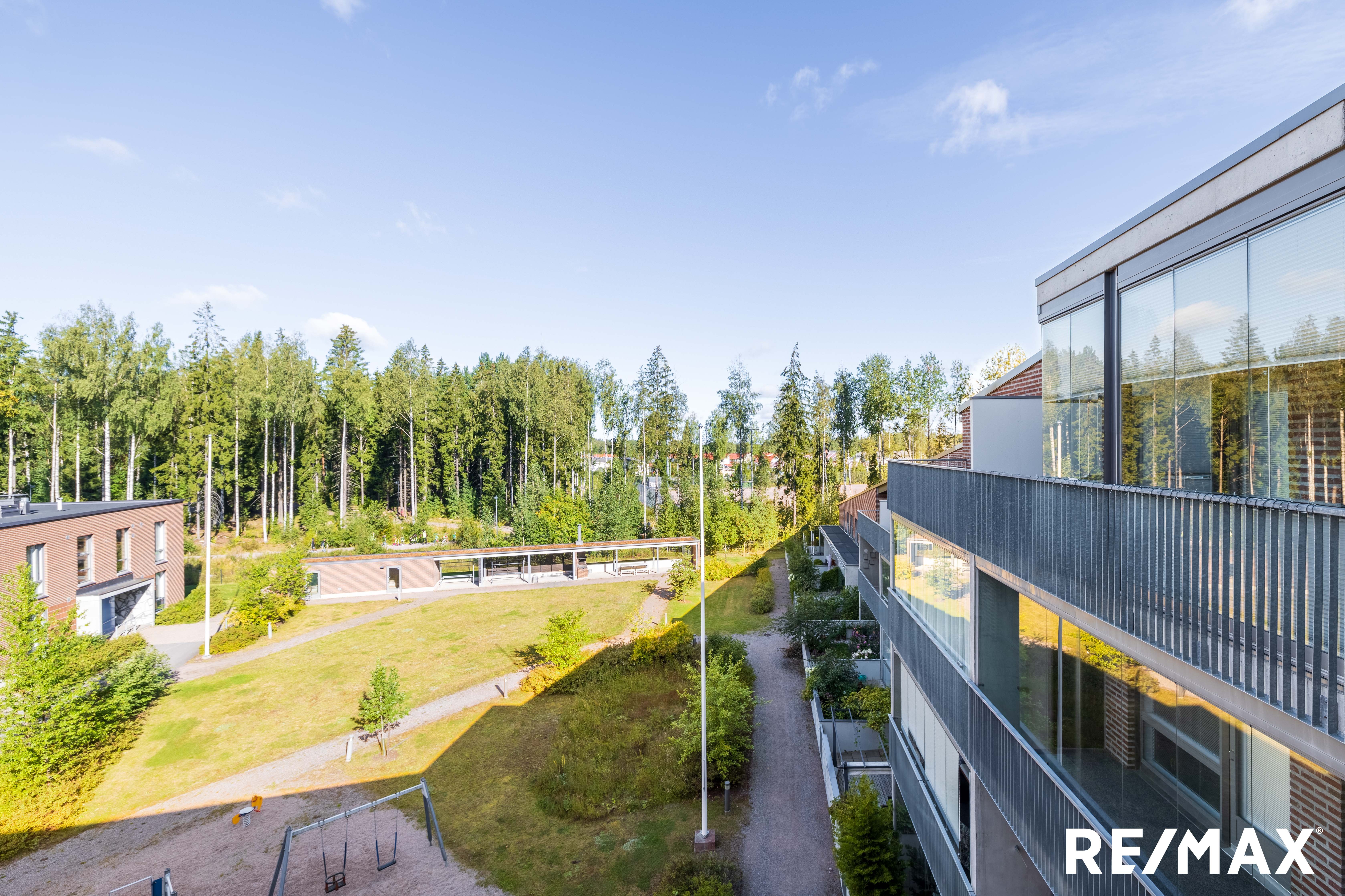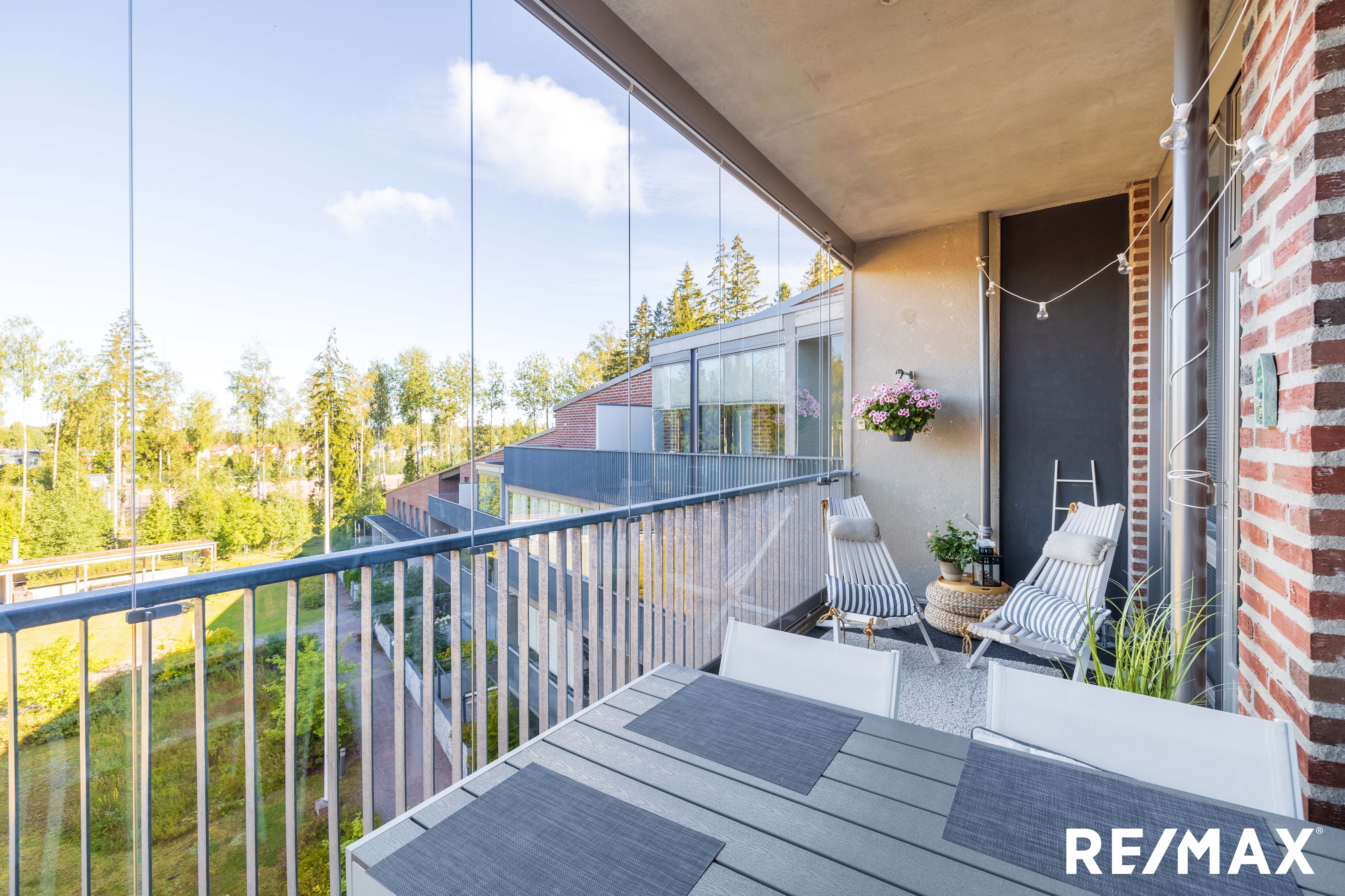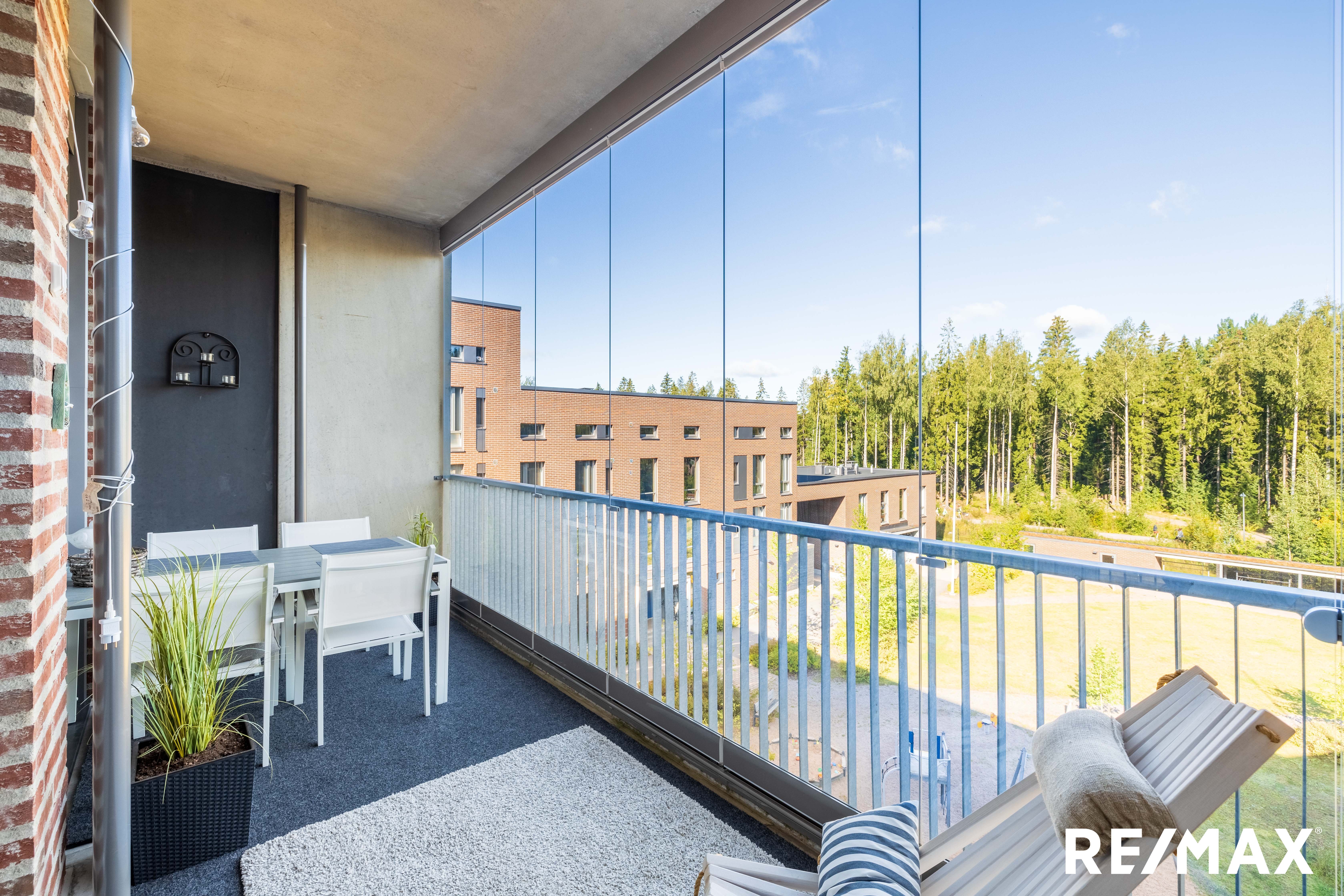 Neljännen kerroksen huoneisto tarjoaa upeat näkymät ja rauhallisen ympäristön. Tilava lasitettu parveke avautuu länteen, mikä tekee siitä ihanteellisen paikan nauttia ilta-auringosta. Asunnossa on laadukkaat materiaalit, kuten parkettilattiat ja moderni keittiö, joka on varustettu kaikilla tarvittavilla kodinkoneilla.
