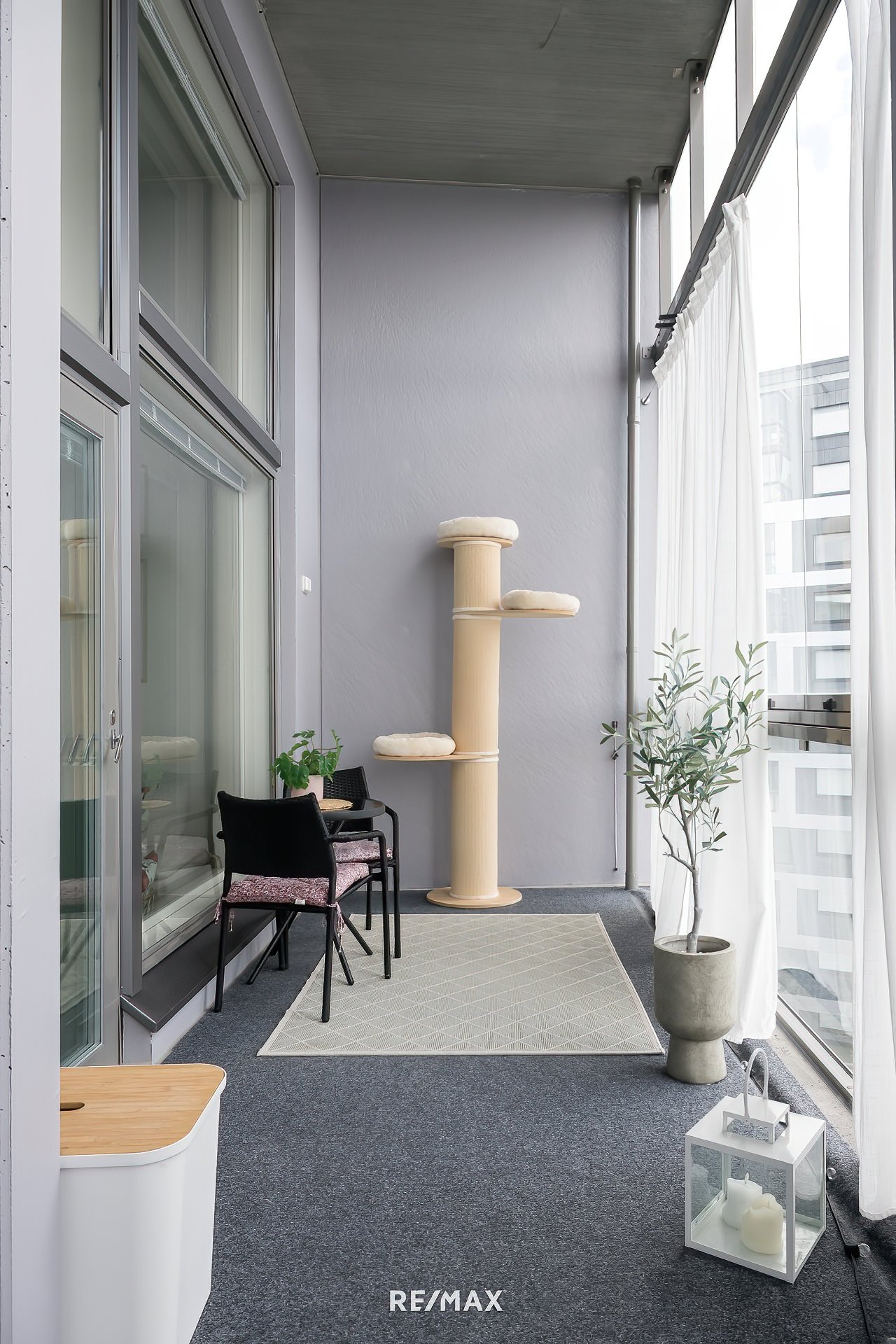 Parvekkeelta avautuvat viihtyisät näkymät, ja tila toimii erinomaisesti niin kesäisenä olohuoneen jatkeena kuin tunnelmallisena syysiltojen oleskelupaikkana.