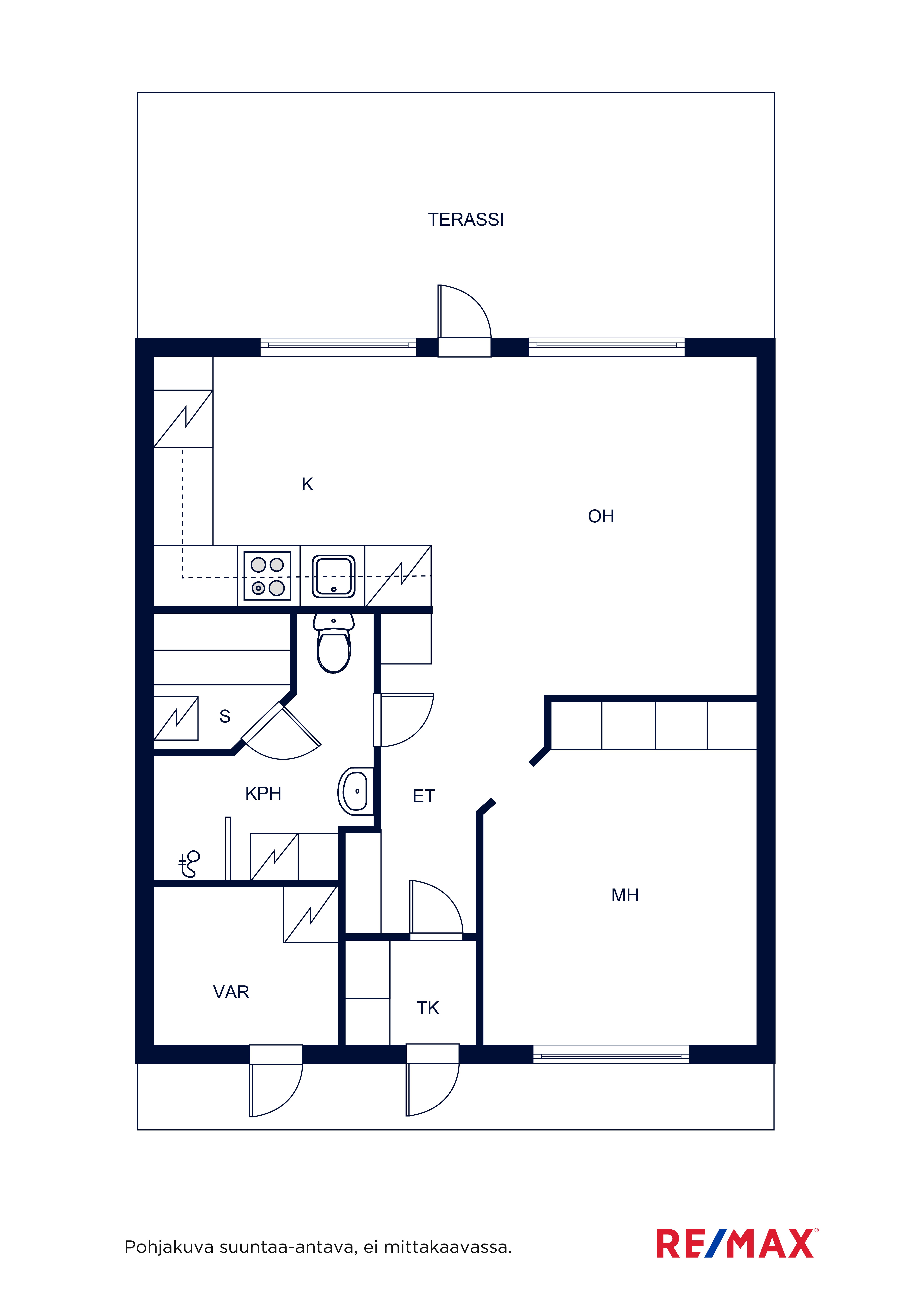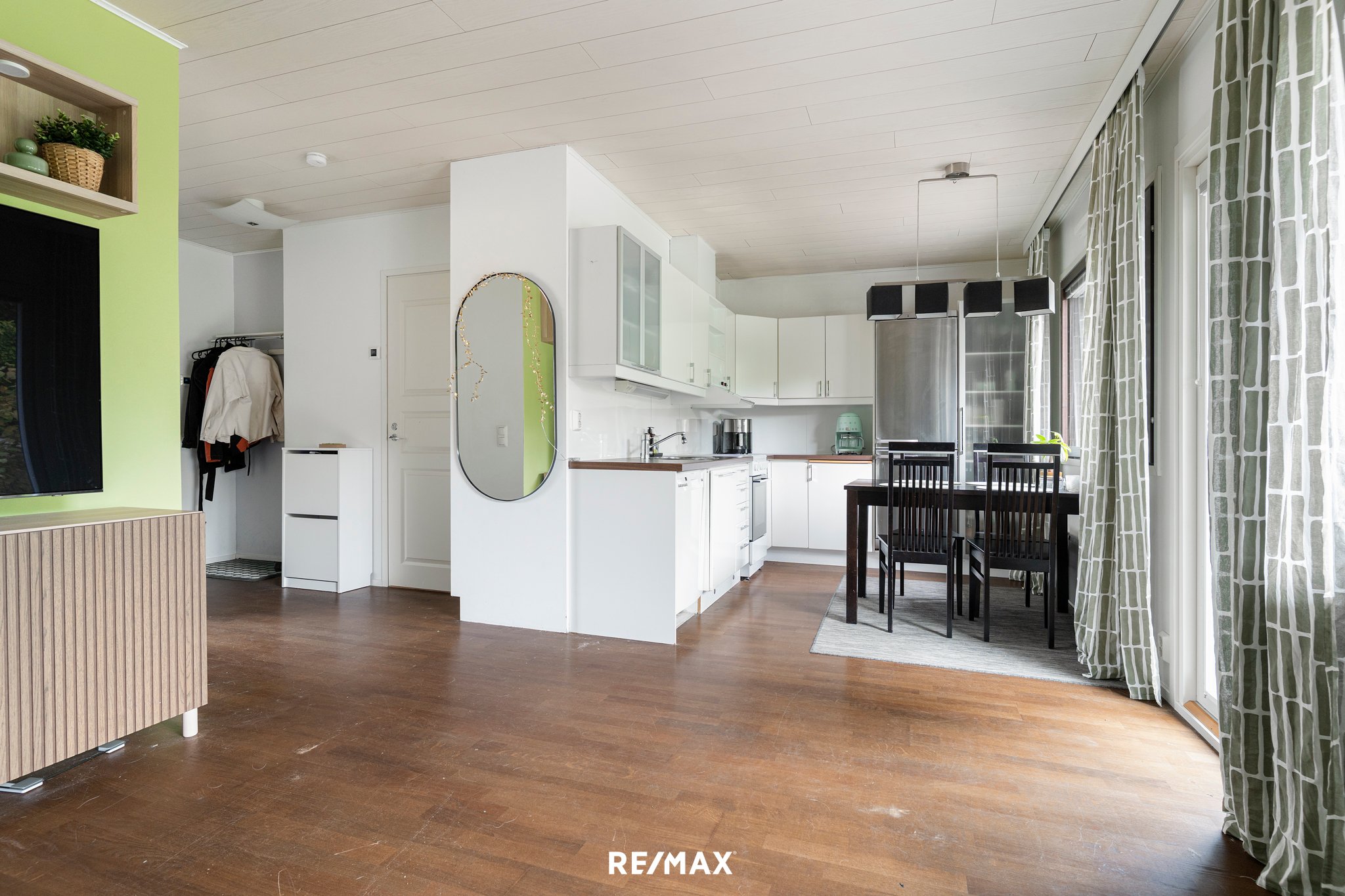 Asunnon erinomainen pohjaratkaisu sopii niin pariskunnalle kuin yksinasuvalle. Keittiö on varusteltu nykyaikaisilla laitteilla ja siinä on runsaasti kaappi- ja työskentelytilaa. Keittiöstä ja olohuoneesta avautuvat vehreät näkymät etelään suuntautuvalle terassille. Aidattu terassi tarjoaa suojaisan paikan rentoutumiseen ja terassille mahtuukin hyvin oleskelu- ja ruokailuryhmä.
