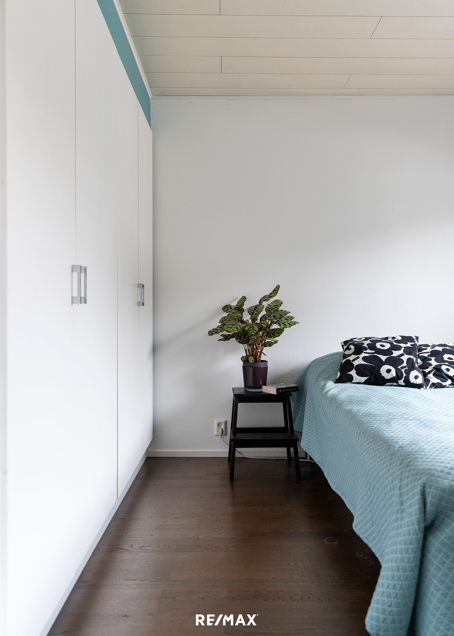 Makuuhuoneesta löytyy säilytystilaa kokonaisen seinällisen verran kaapistoja sekä eteisessä on lisää säilytystilaa.