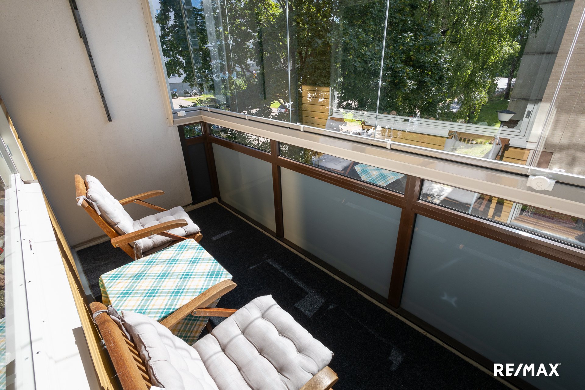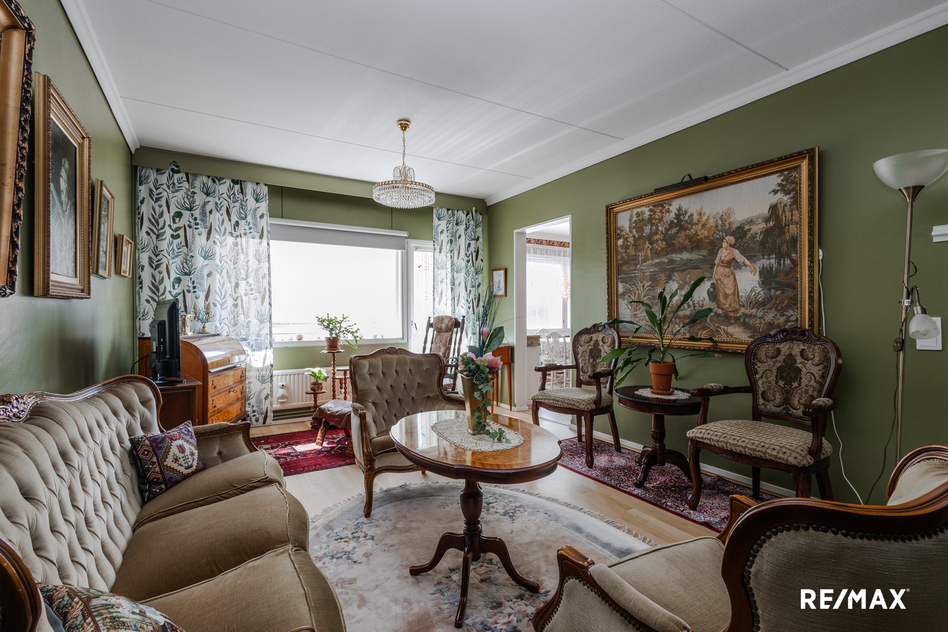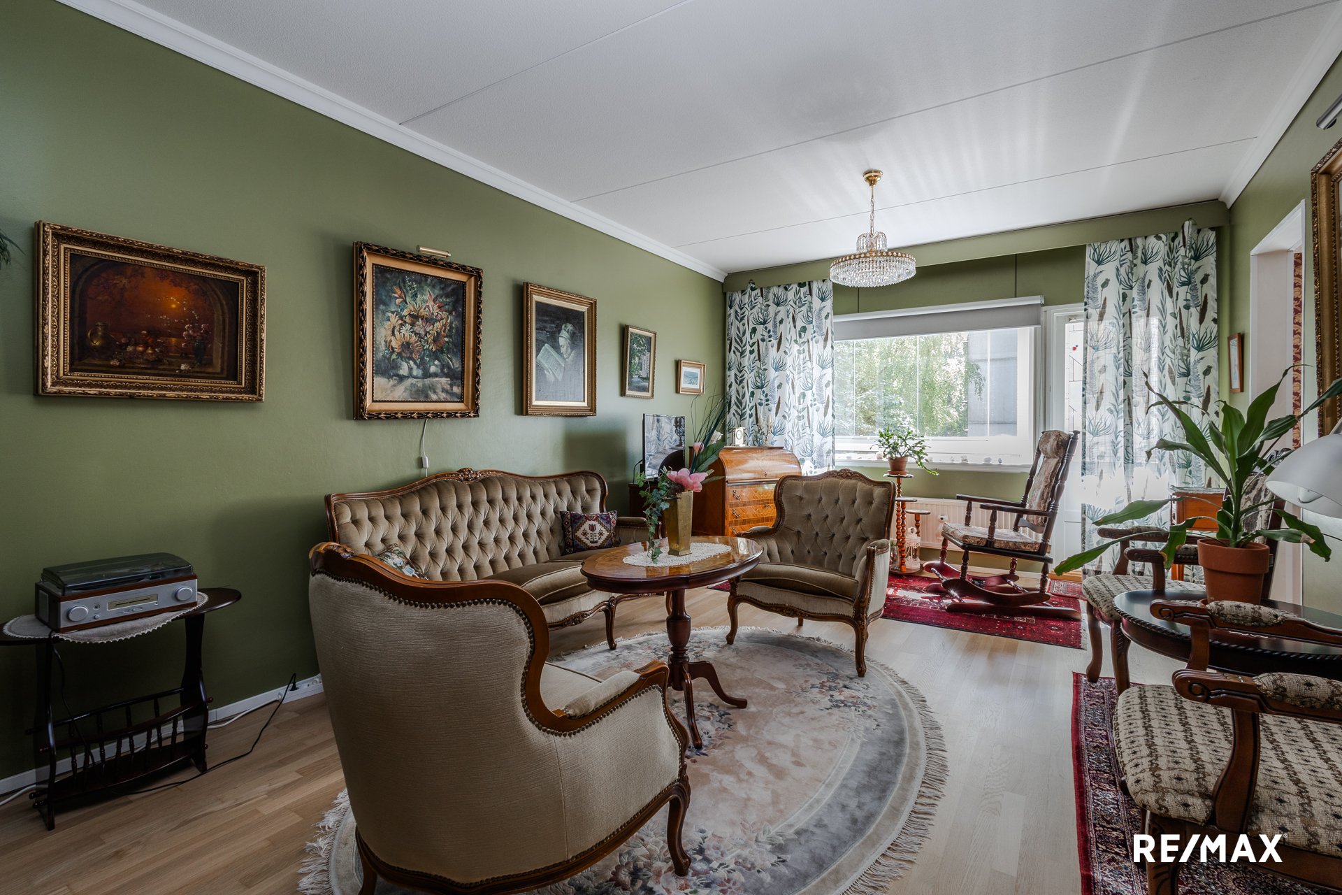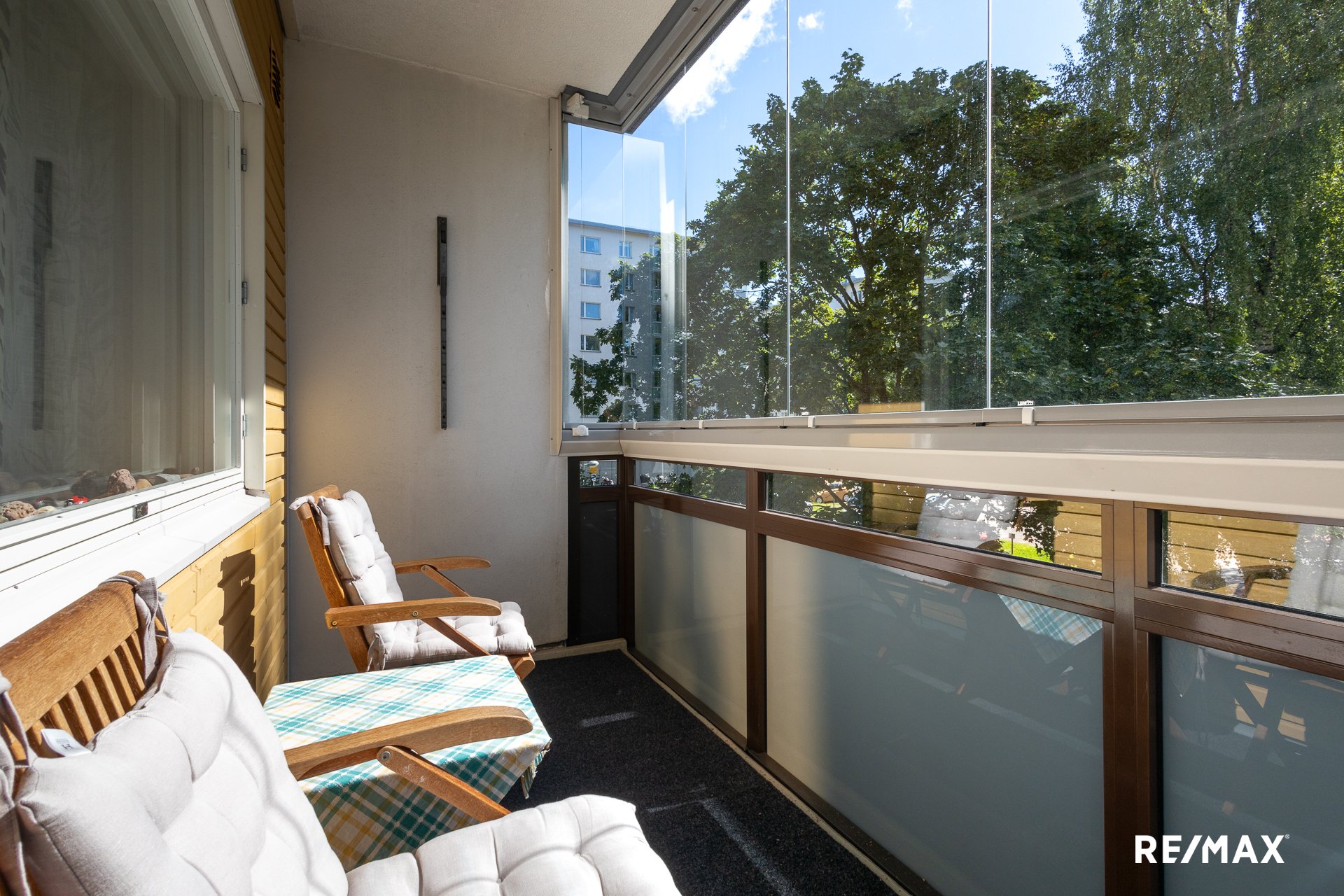 Asunnon sydän on valoisa olohuone, josta on käynti lasitetulle parvekkeelle ja sisäpihalle aukeaviin näkymiin – täydellinen paikka nauttia aamukahvista tai iltapäivän auringosta.