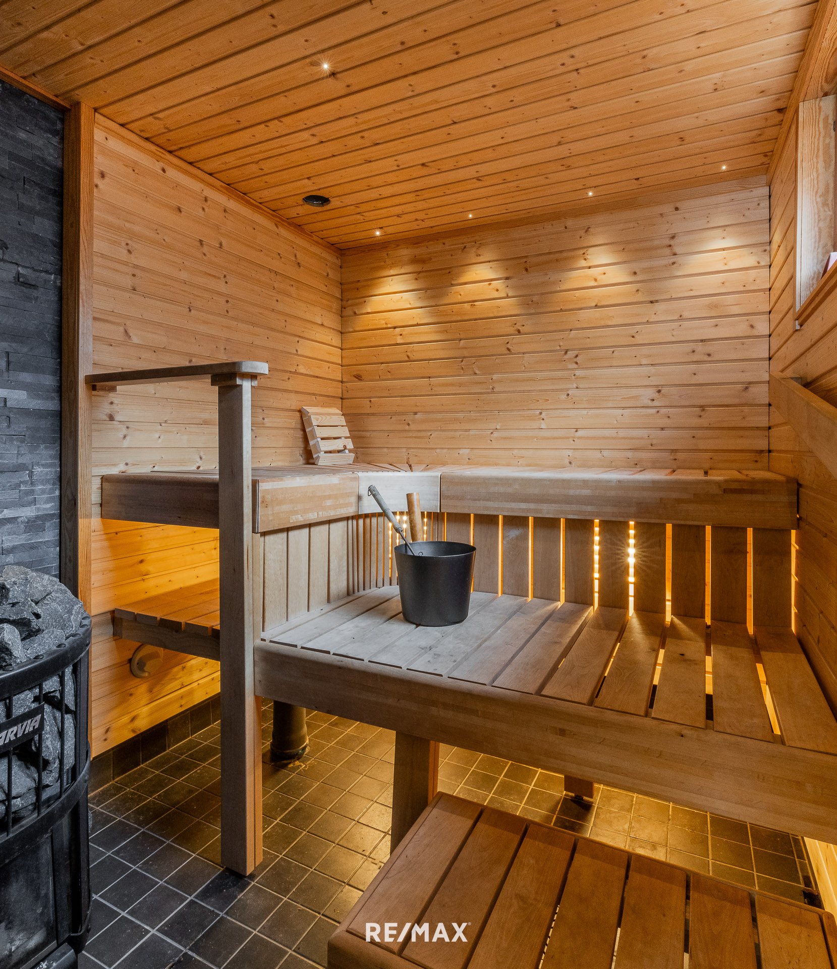 Saunassa laattaa.