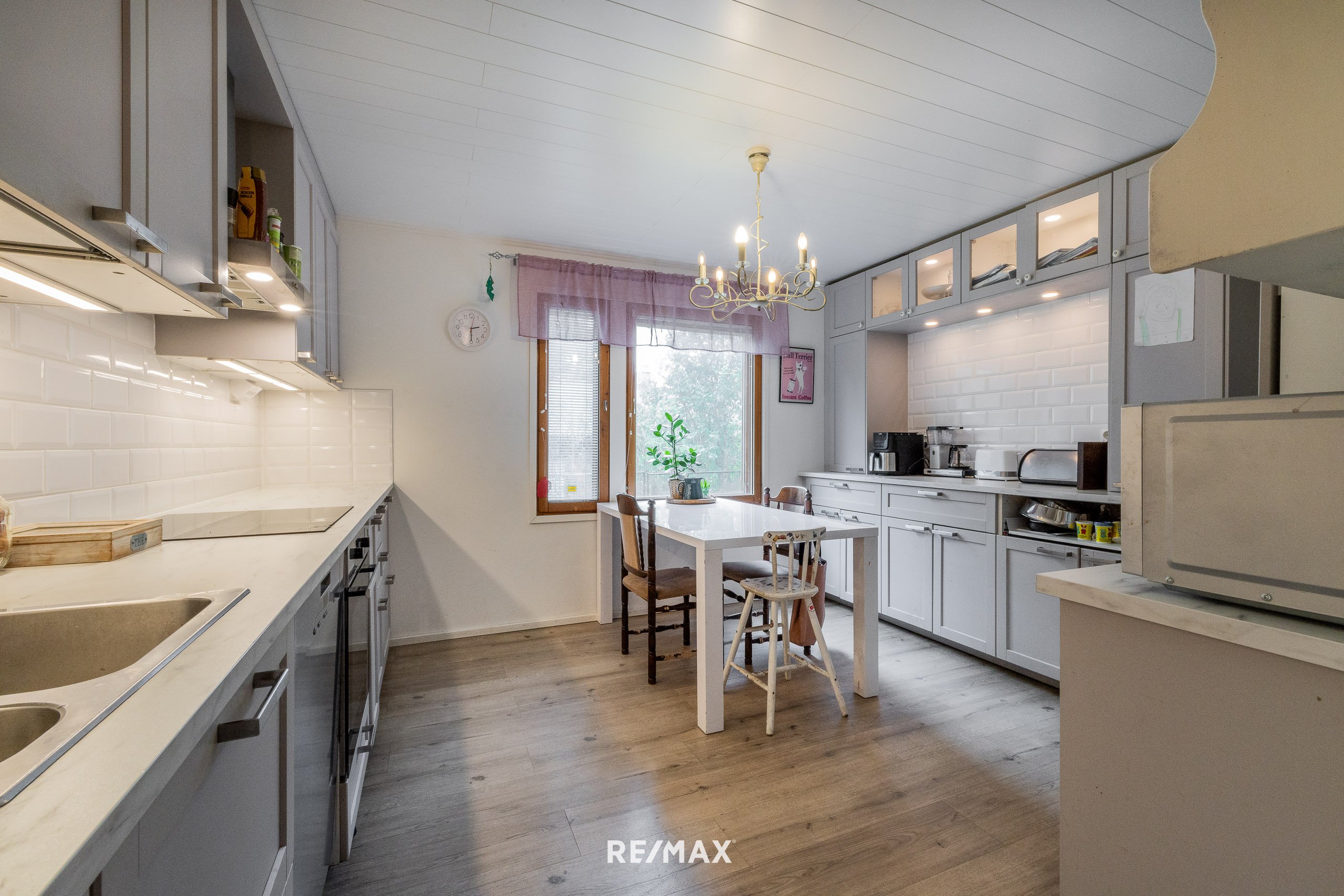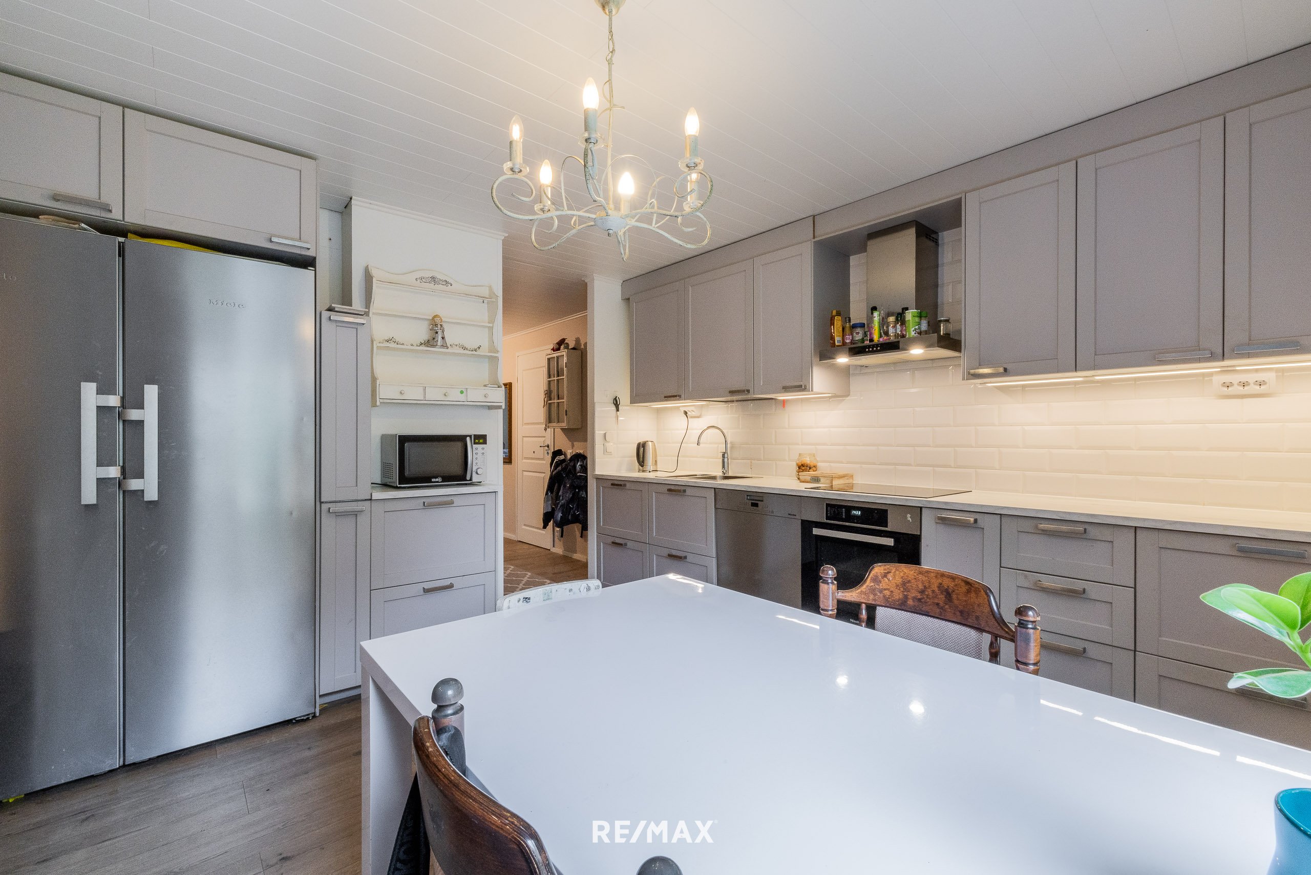 Keittiöön on teetetty vuosina 2021-2022 pinnat, kiintokalusteet ja -koneet. Keittiökaapistot IKEA, apk, jpk, liesituuletin, uuni ja induktiotaso. Uusittu allas ja sekoittaja.