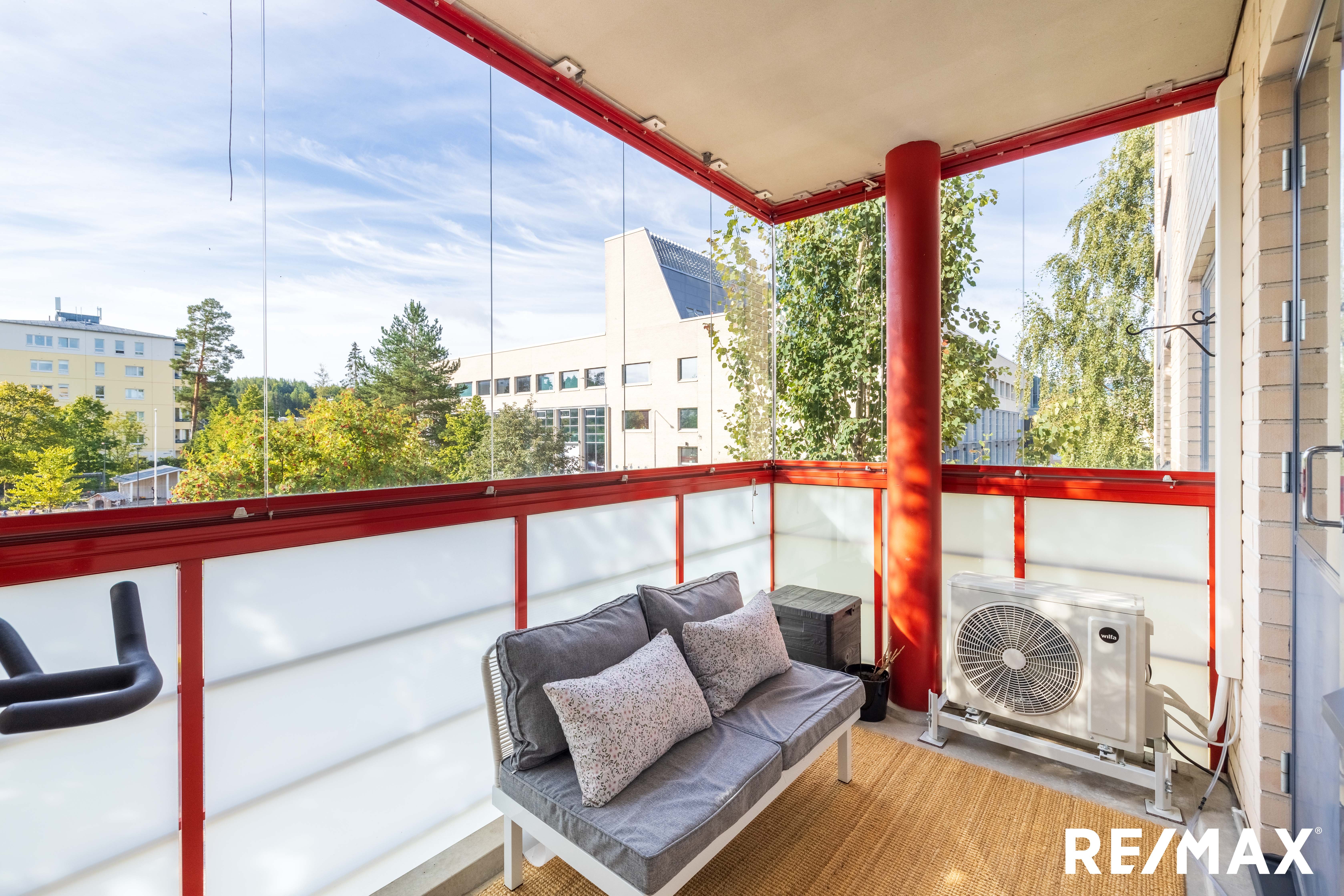 Lasitettu parveke avautuu etelään, tarjoten ihanan paikan nauttia auringosta.