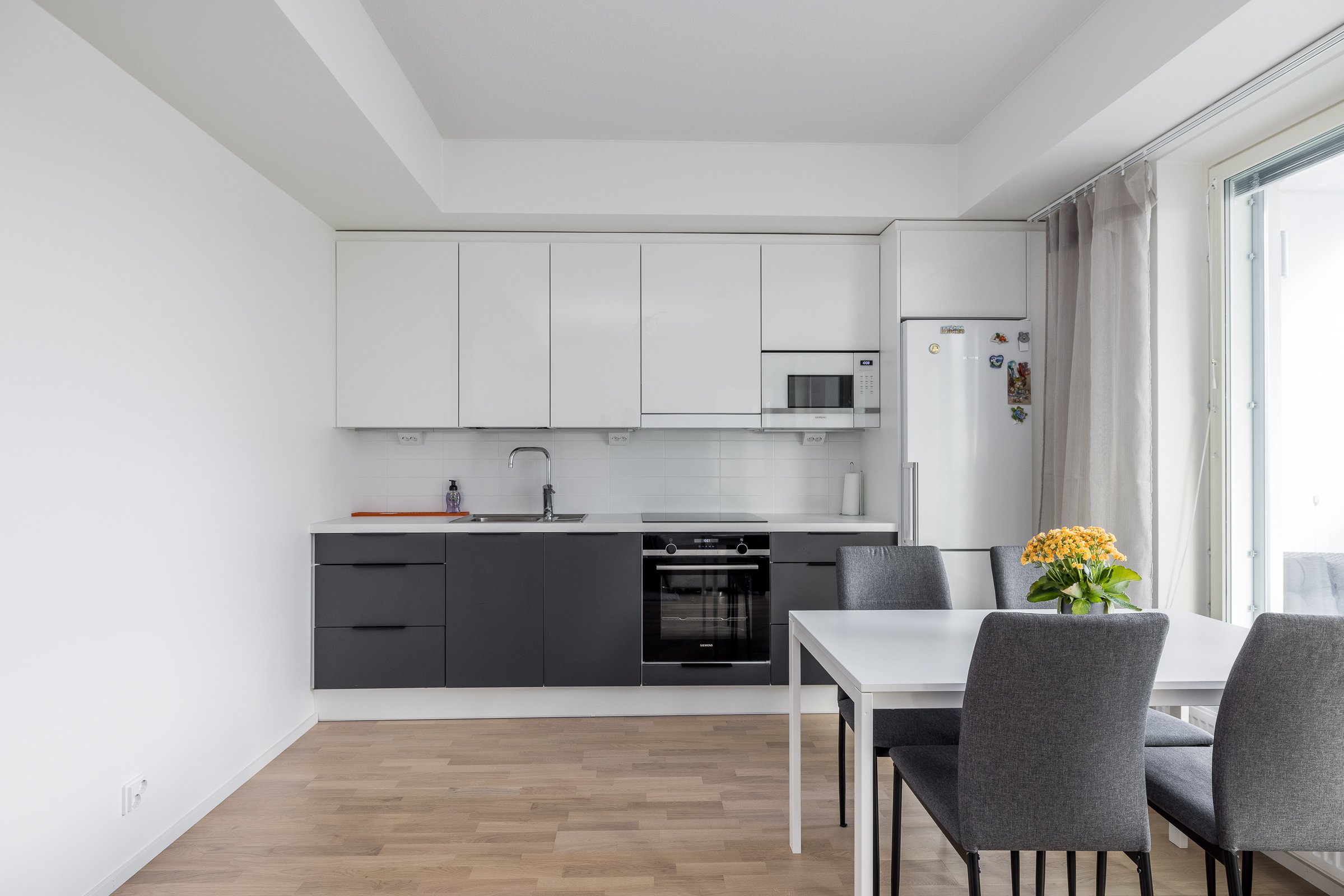 Asunnossa on laadukkaat Puustellin keittiökalusteet ja Siemensin kodinkoneet. Lattiat ovat kaunista tammiparkettia.