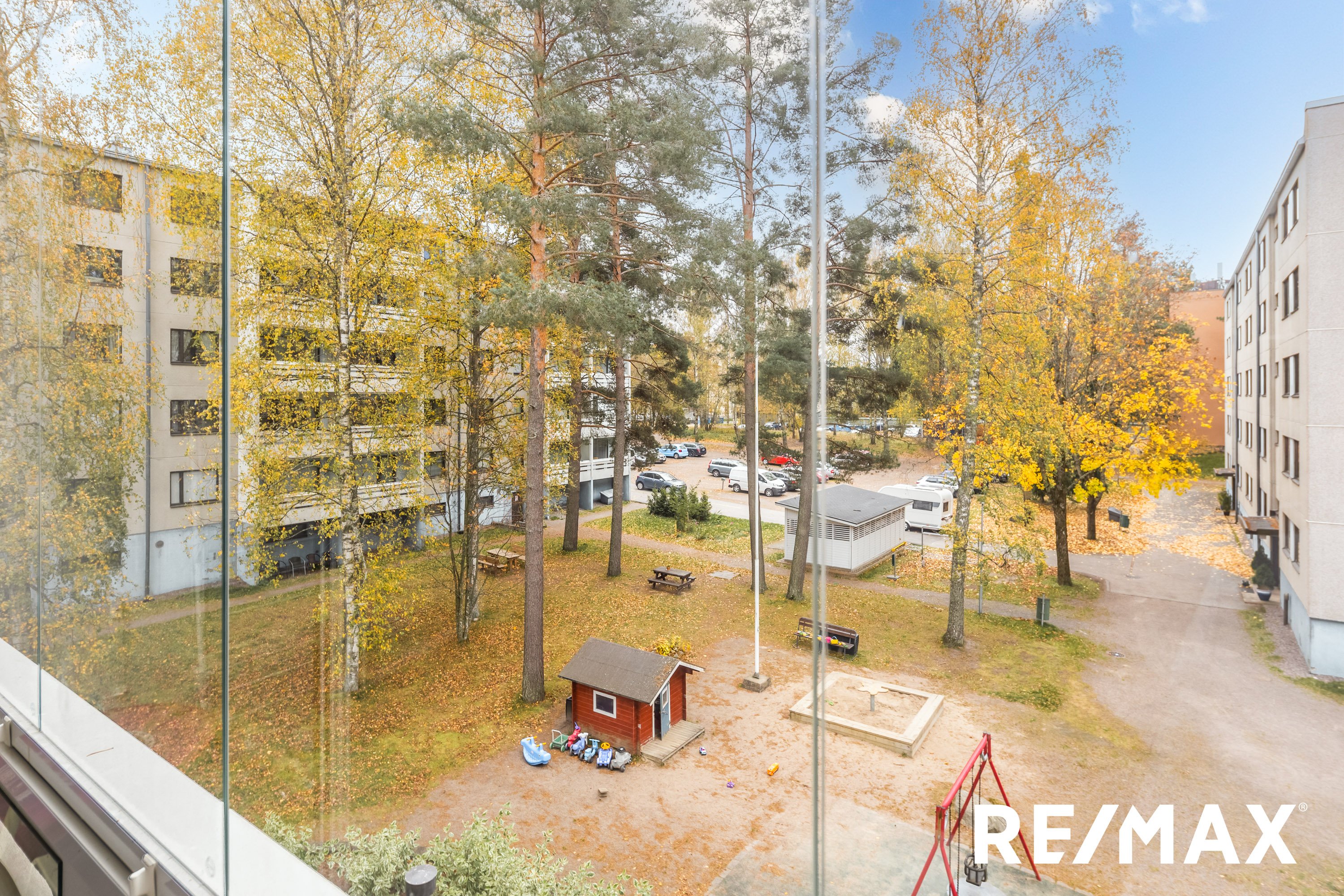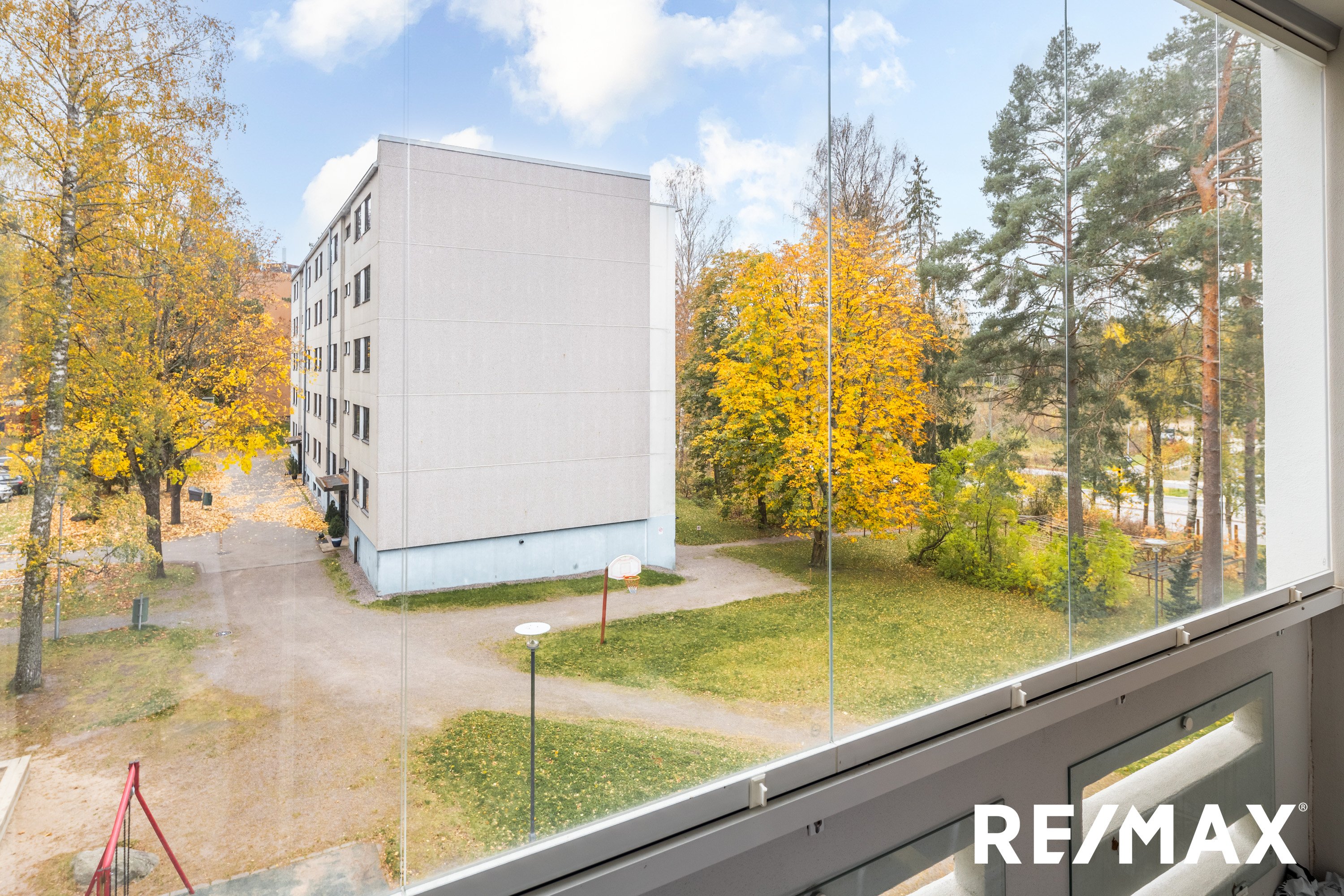 Asunnon etelään suuntautuva lasitettu parveke tuo mukavasti lisätilaa ja tarjoaa rauhallisen paikan rentoutua.