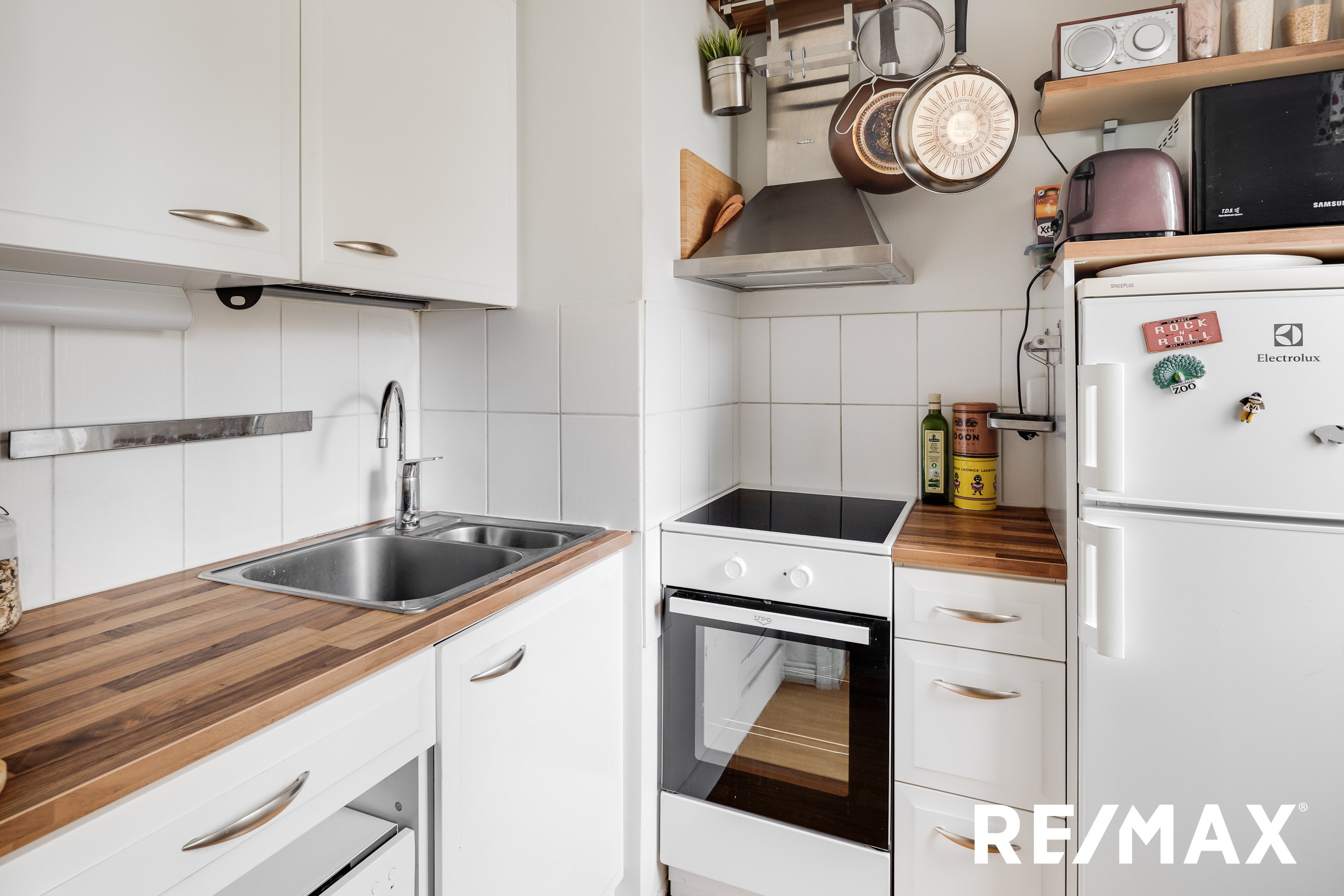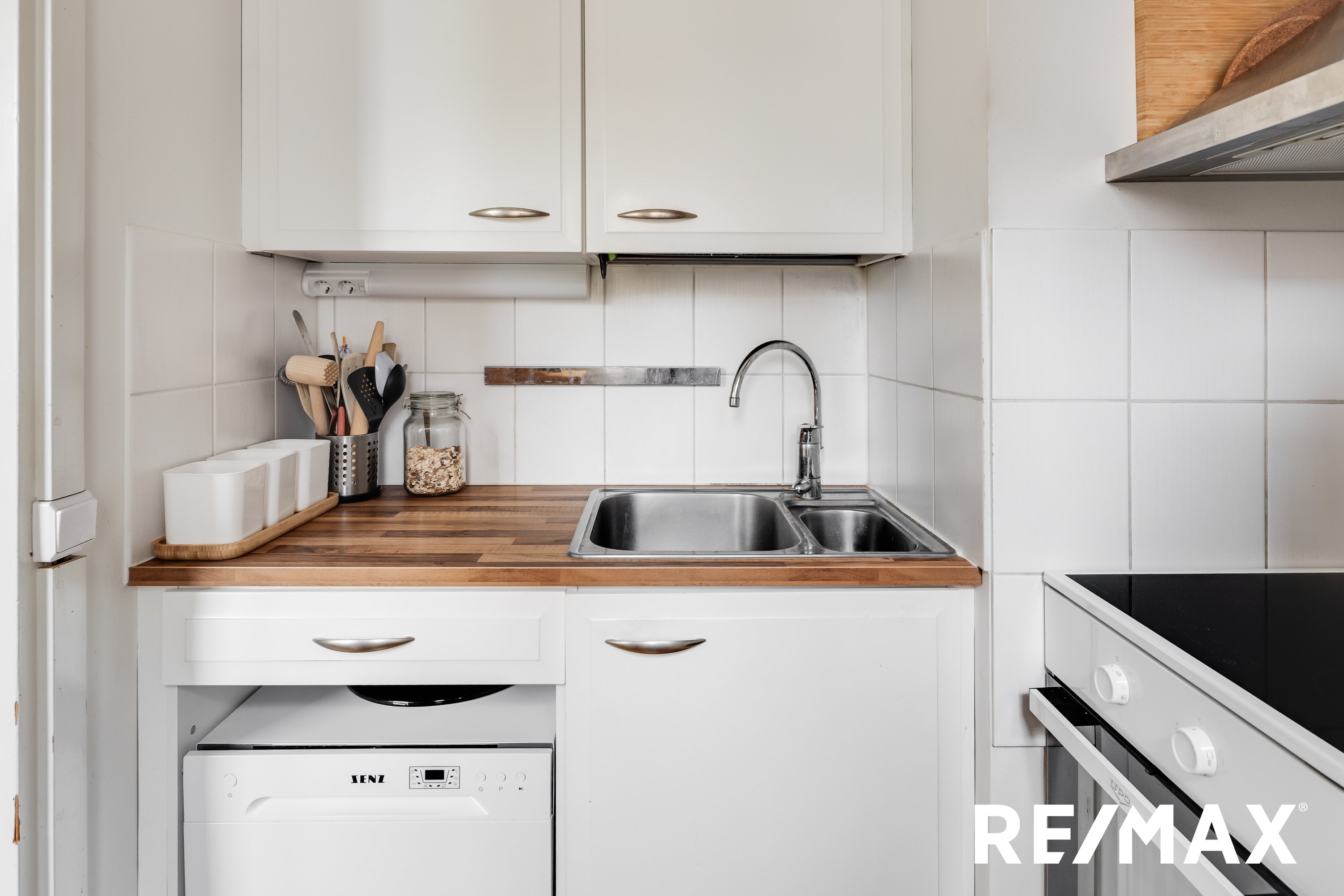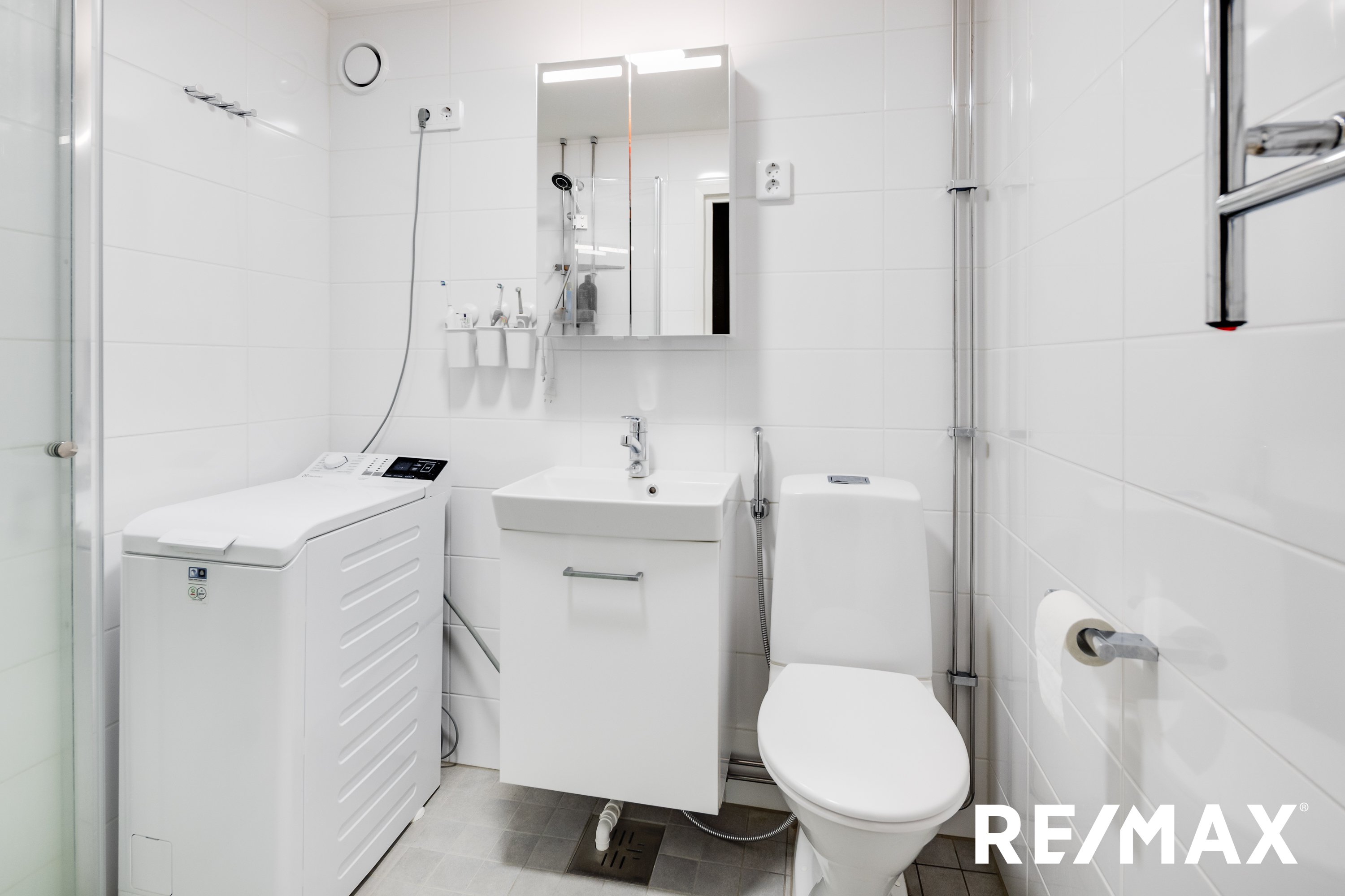 Keittokomerossa on kaikki tarvittava – jenkkikaappi, induktioliesi ja pöytämallinen astianpesukone tekevät arjesta sujuvaa. Olohuone ja makuuhuone ovat tilavat, ja laminaattilattiat tuovat modernia ilmettä. Kylpyhuoneessa on pesukoneliitäntä ja suihkuseinä, mikä lisää käytännöllisyyttä.