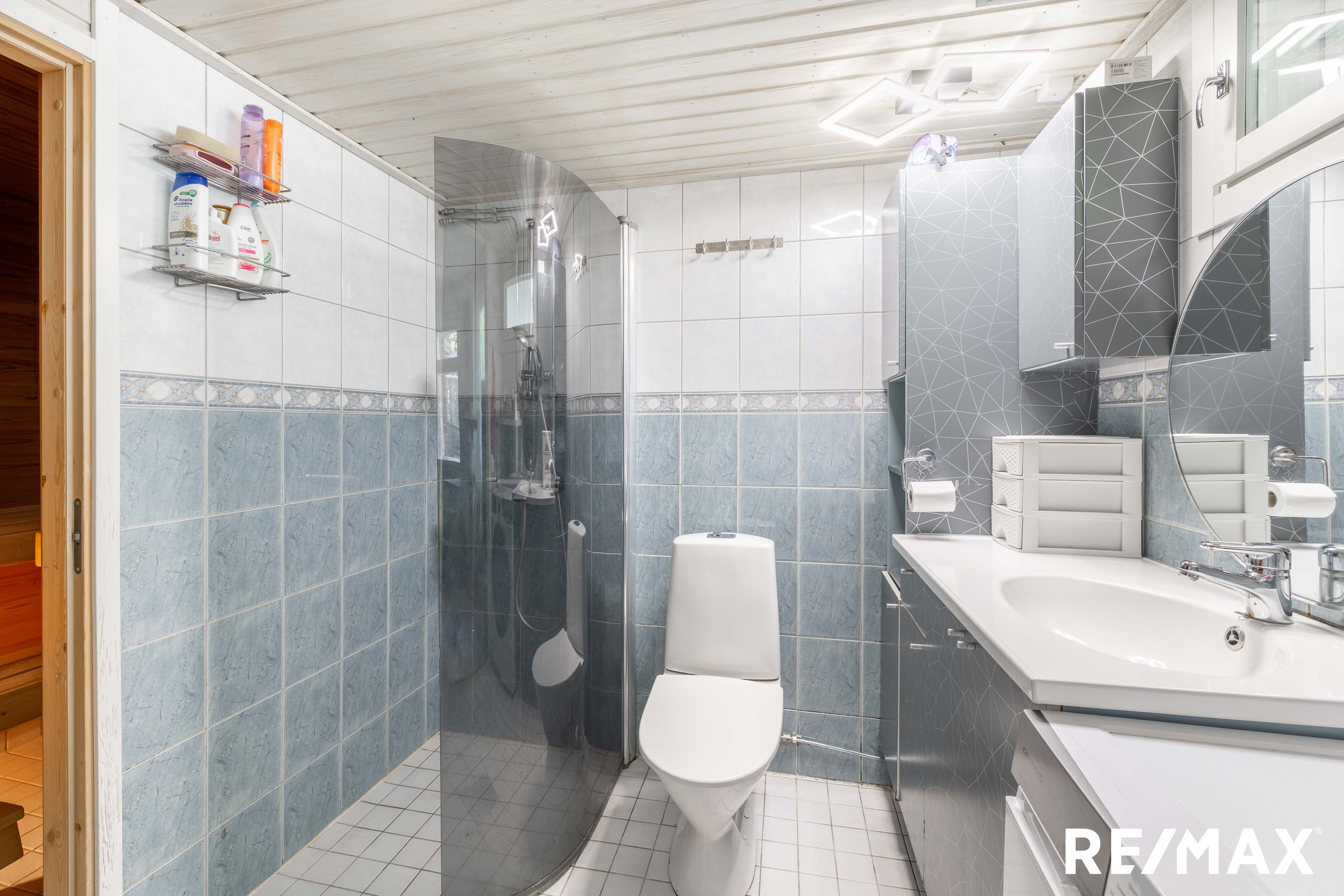 WC-istuin, suihku, suihkuseinä, pesukoneliitäntä, peili, pesuallas ja allaskaappi