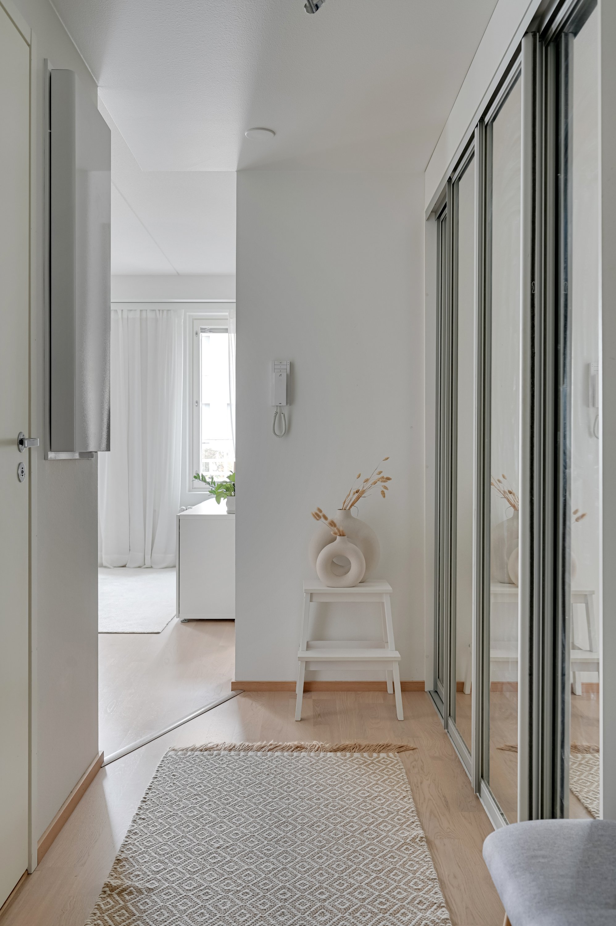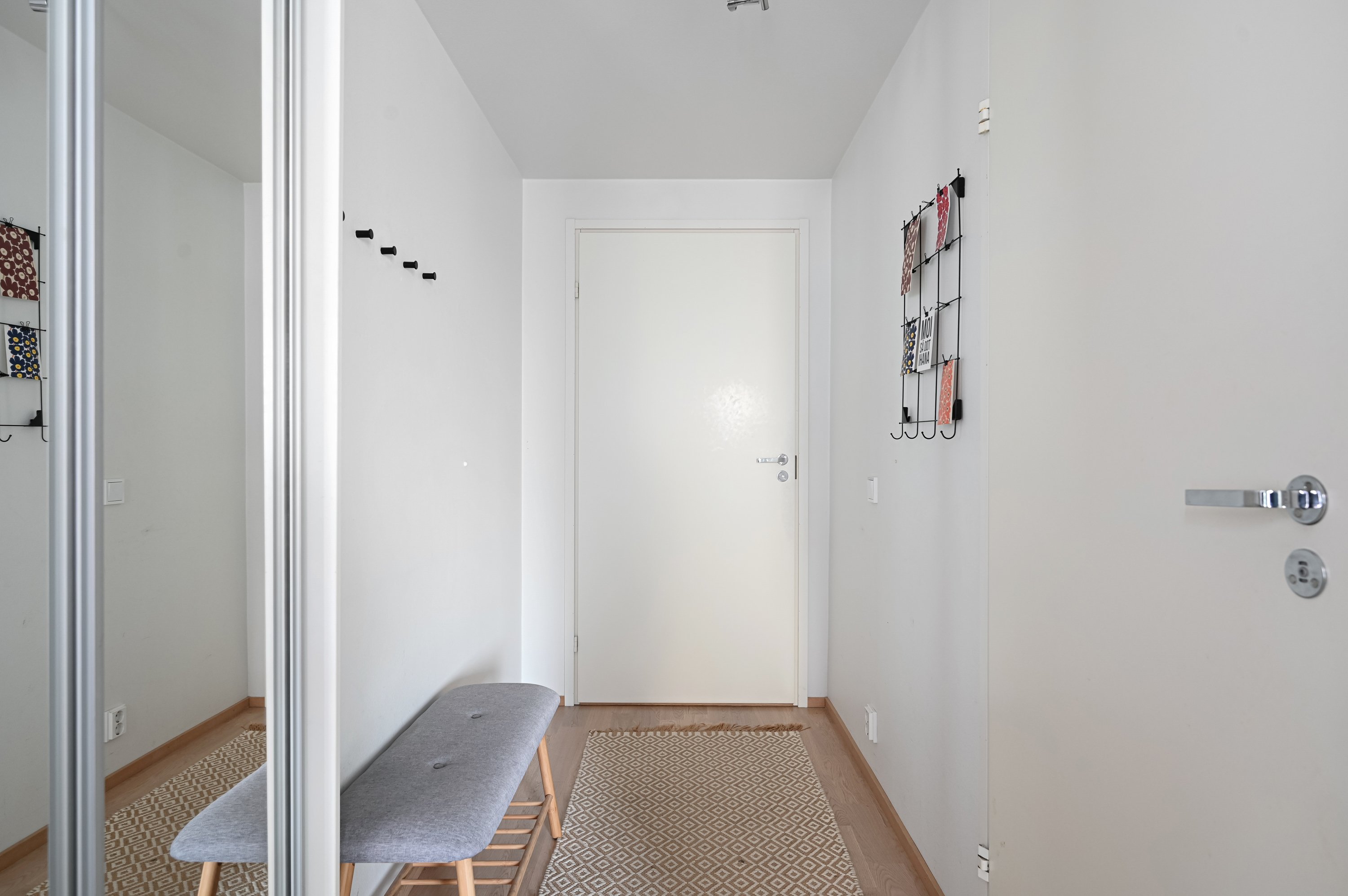 Makuuhuoneen yhteydessä on tilava vaatehuone, joka tarjoaa runsaasti säilytystilaa ja tekee elämisestä sujuvaa. Eteisessä on lisäksi käytännöllinen liukuovikaapisto, joka pitää tavarat järjestyksessä ja tilan selkeänä.