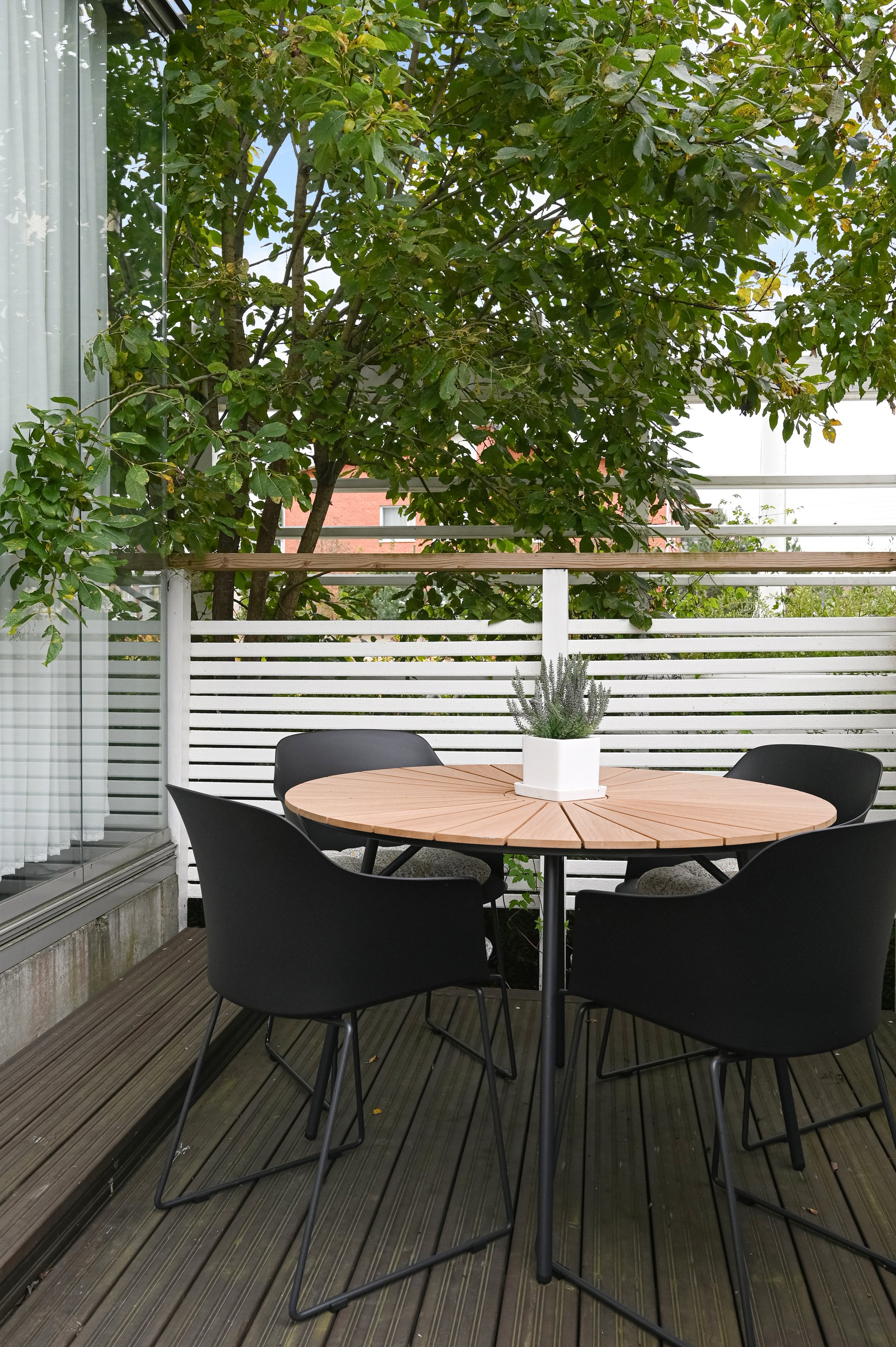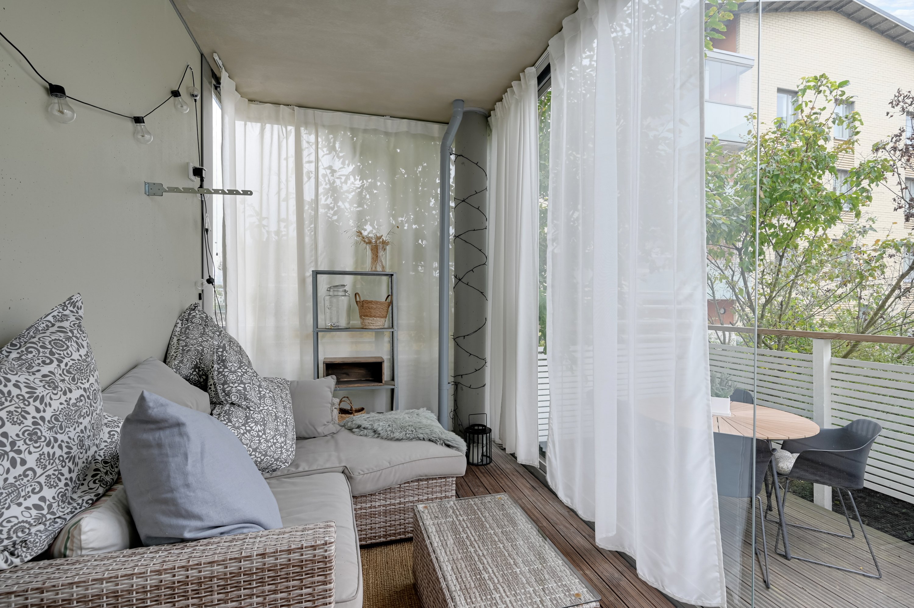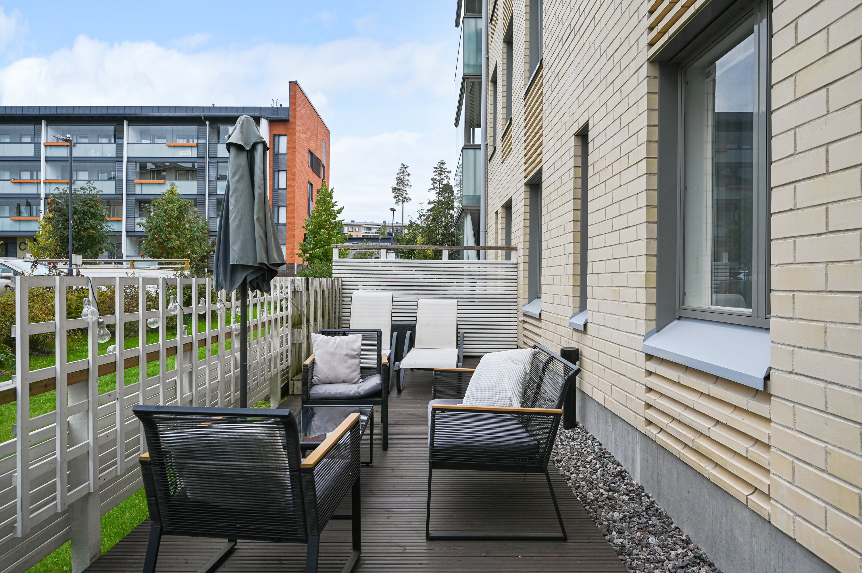 Olohuoneesta avautuu kulku upealle, lasitetulle terassille, joka toimii kuin lisähuone suurimman osan vuodesta. Terassi jatkuu vielä pihan puolelle, jossa on tilaa nauttia auringosta ja kesäpäivistä – sinne mahtuu helposti ruokailuryhmä, sohvaryhmä ja aurinkotuolit. Länteen avautuva suunta takaa kauniit ilta-auringon säteet.