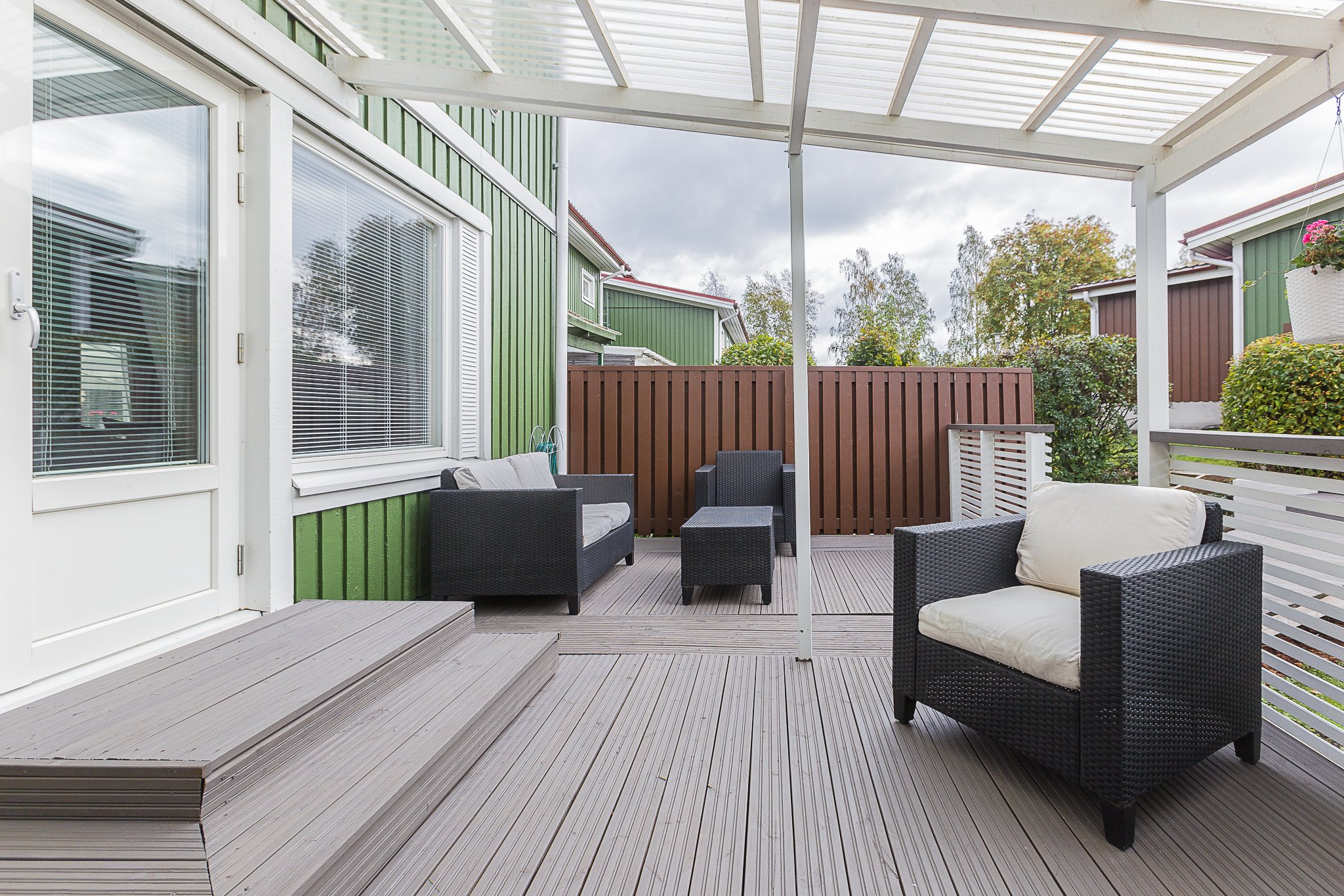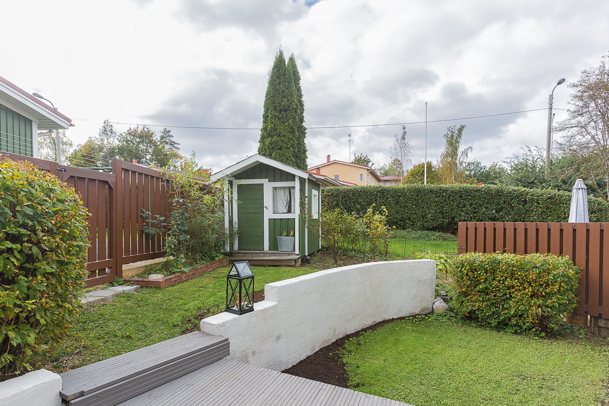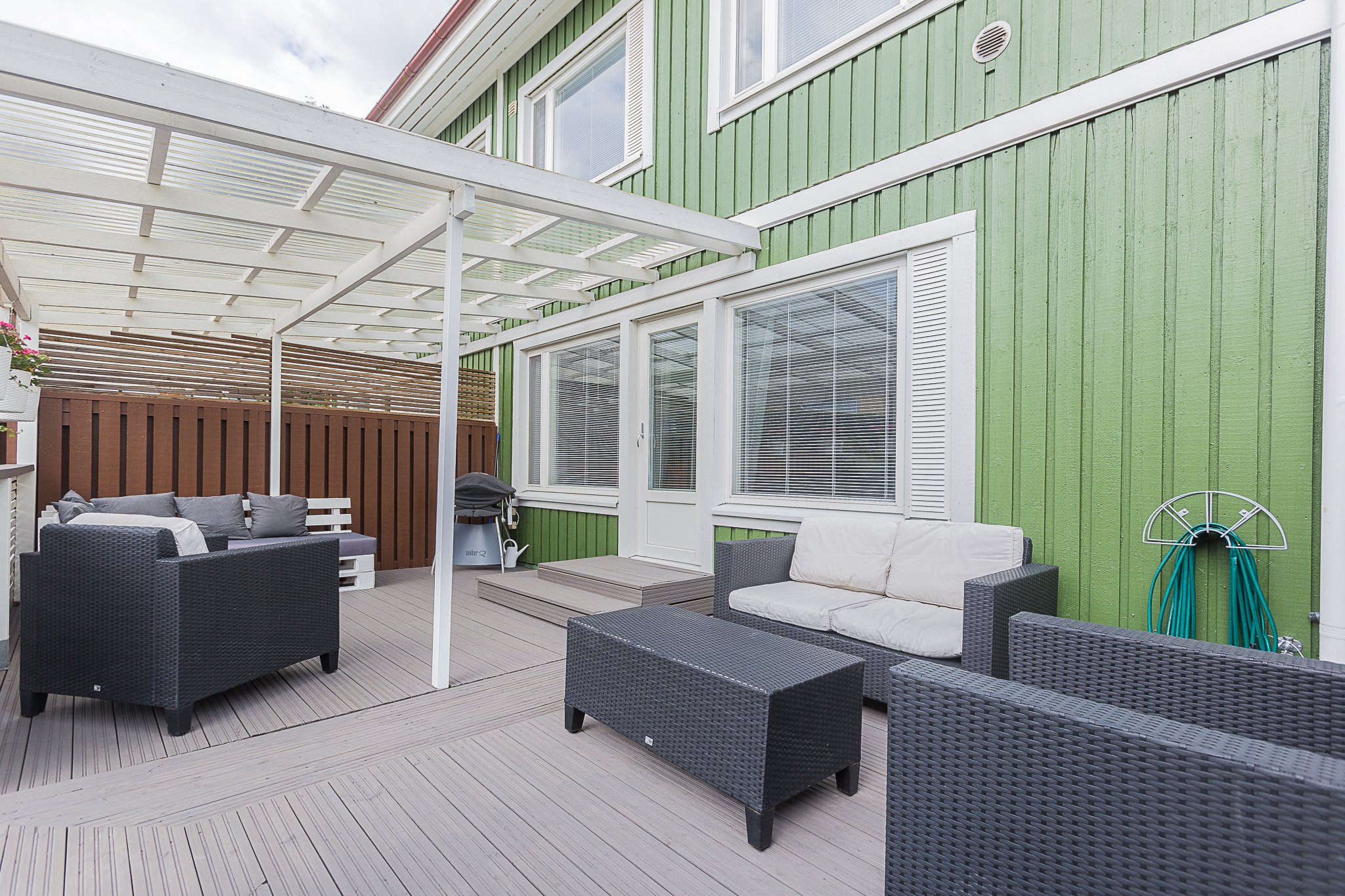 Alakerran avara ja valoisa olohuone kutsuu viihtymään, ja sen kautta on kulku aurinkoiselle takapihalle sekä katetulle terassille. Keittiöön mahtuu ruokailuryhmä, ja lisäksi alakerrasta löytyy erillinen, reilunkokoinen erillinen wc. Toisesta kerroksesta löytyvät makuuhuoneet, pesuhuone sekä sauna, jonka lauteet ja panelointi on äskettäin uusittu.