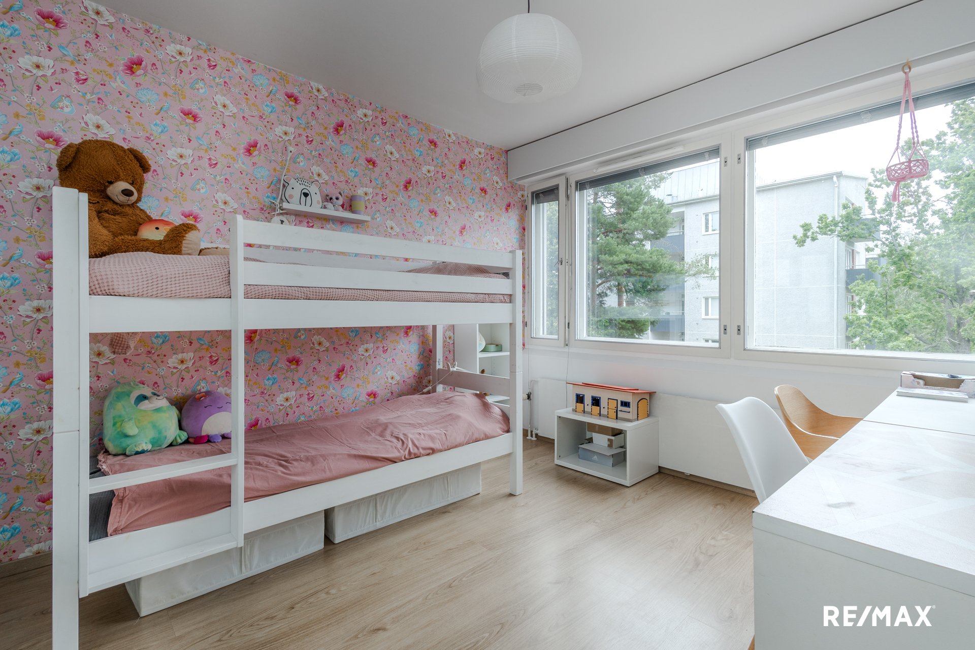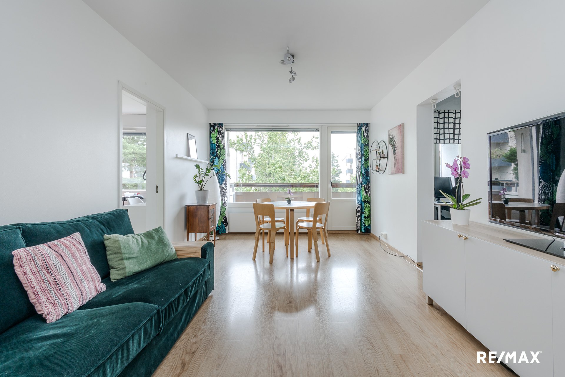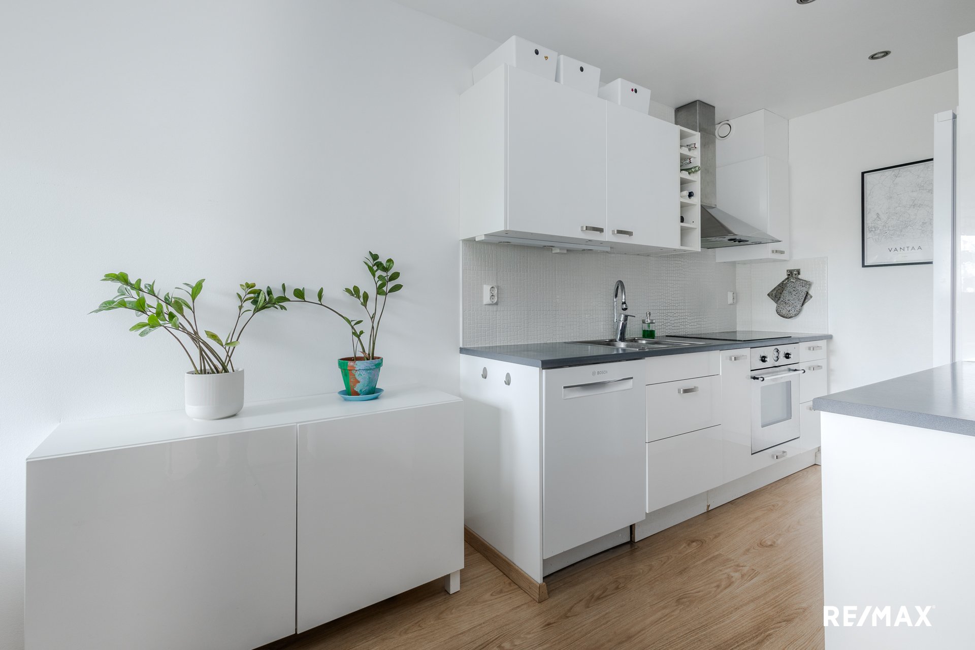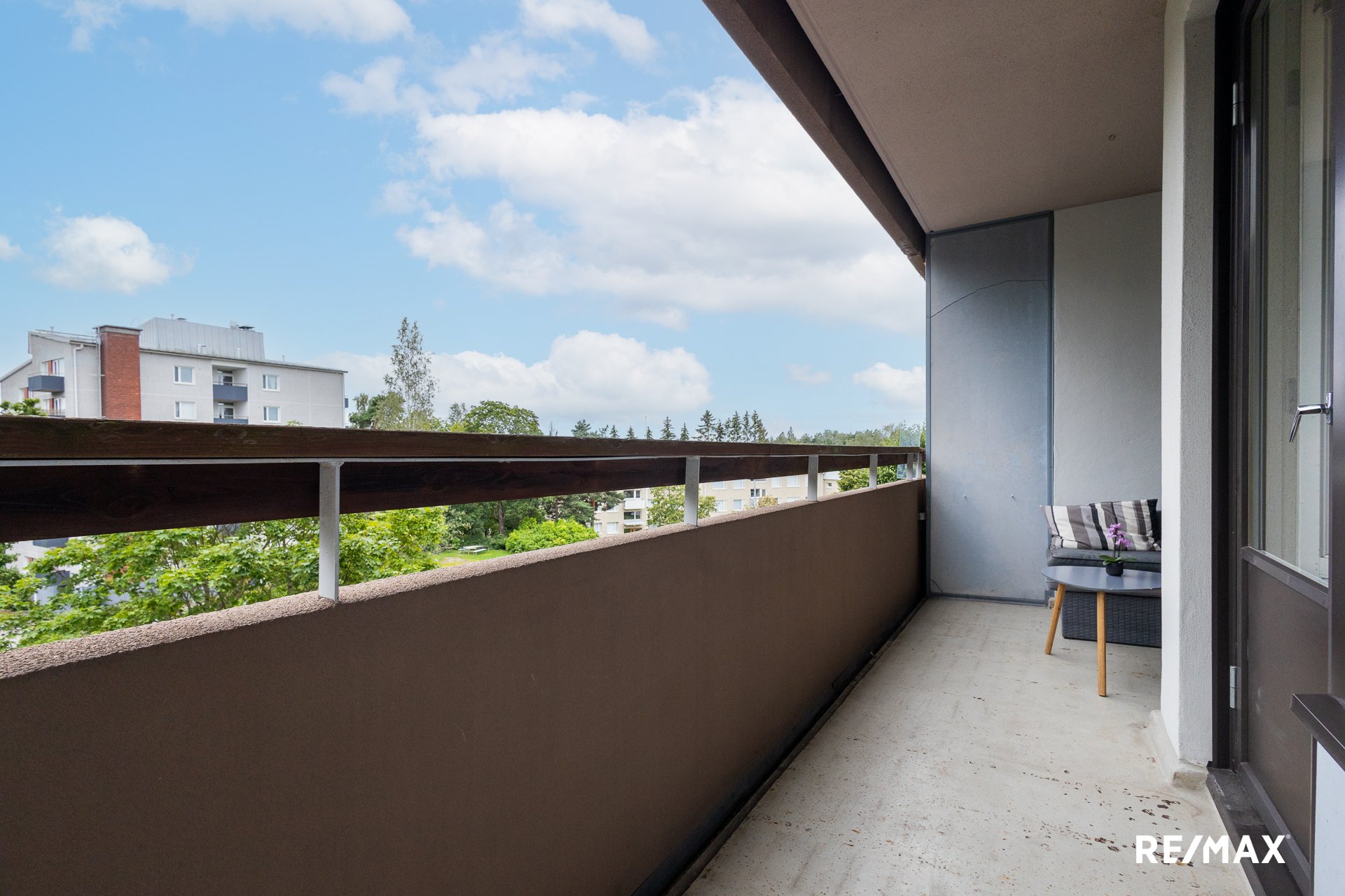 Tähän kotiin astuessa vastassa on luonnonvaloa tulviva avara olohuone. Siitä on kulku suurelle parvekkeelle, jossa on mukava nauttia iltapäivän auringosta työpäivän jälkeen. Vaaleansävyiseen keittiöön mahtuu hyvin ruokailuryhmä ja siitä on näkymä asunnon parvekkeelle. Makuuhuoneista toisessa on koko huoneen levyinen kaapisto ja säilytystilaa löytyy lisää erillisestä vaatehuoneesta.