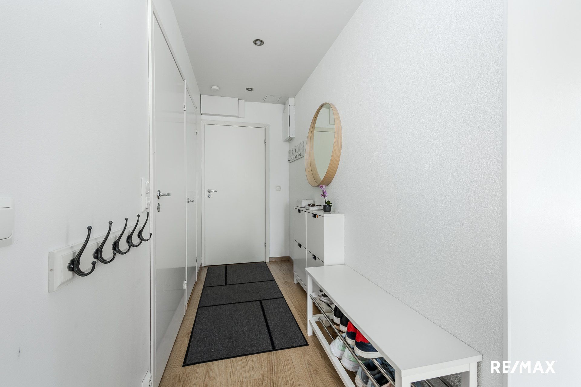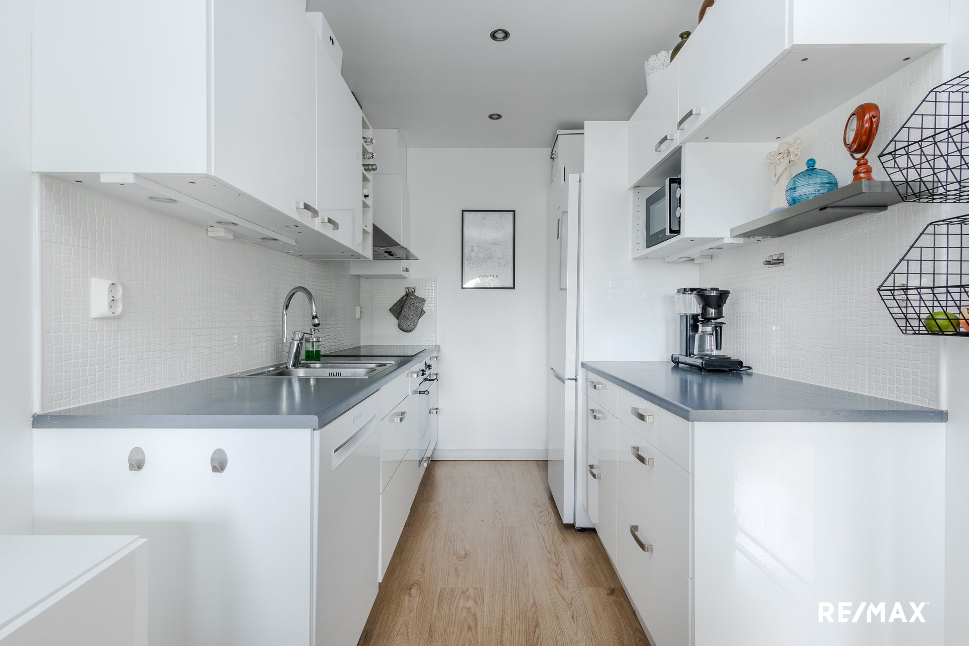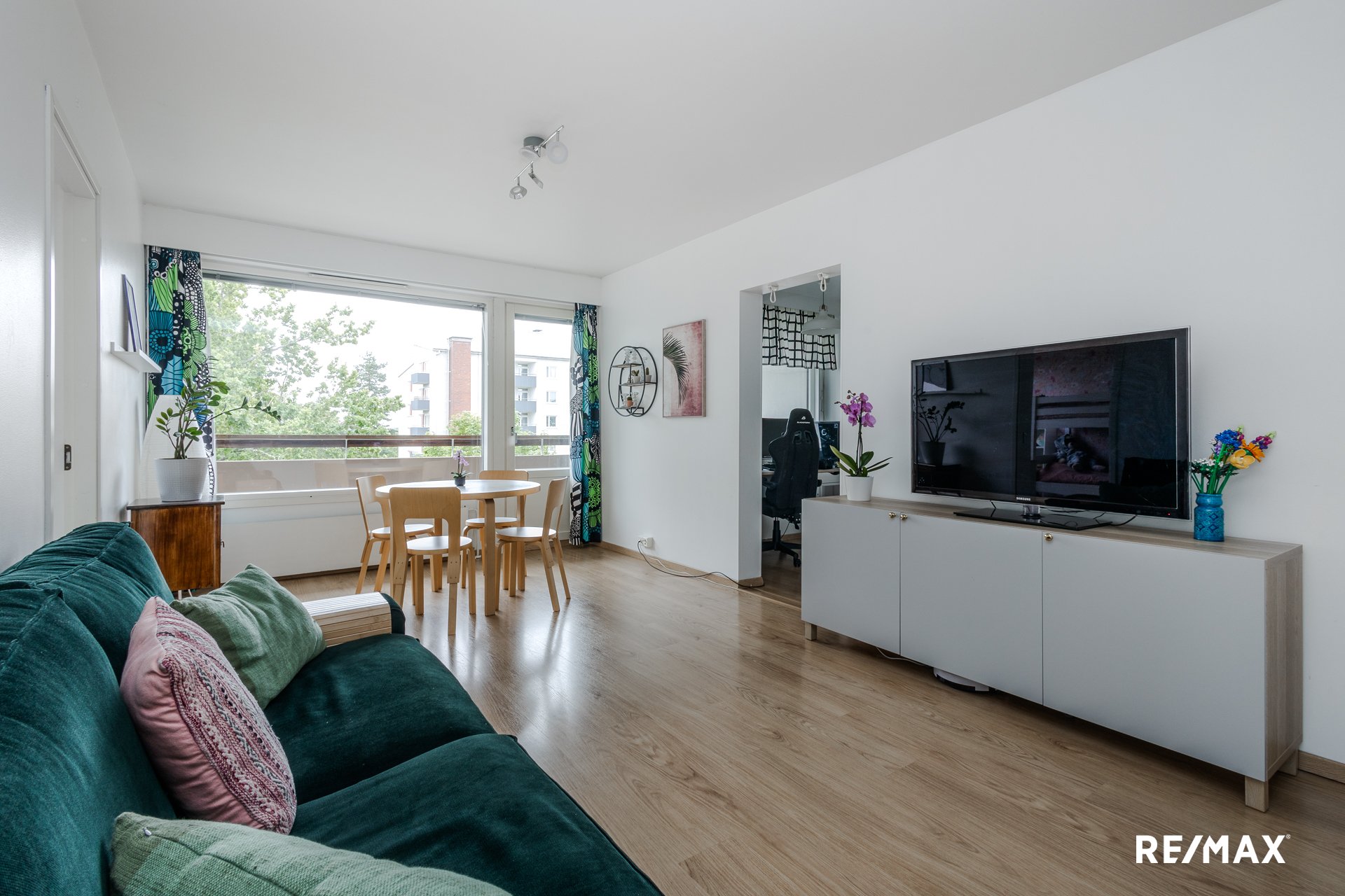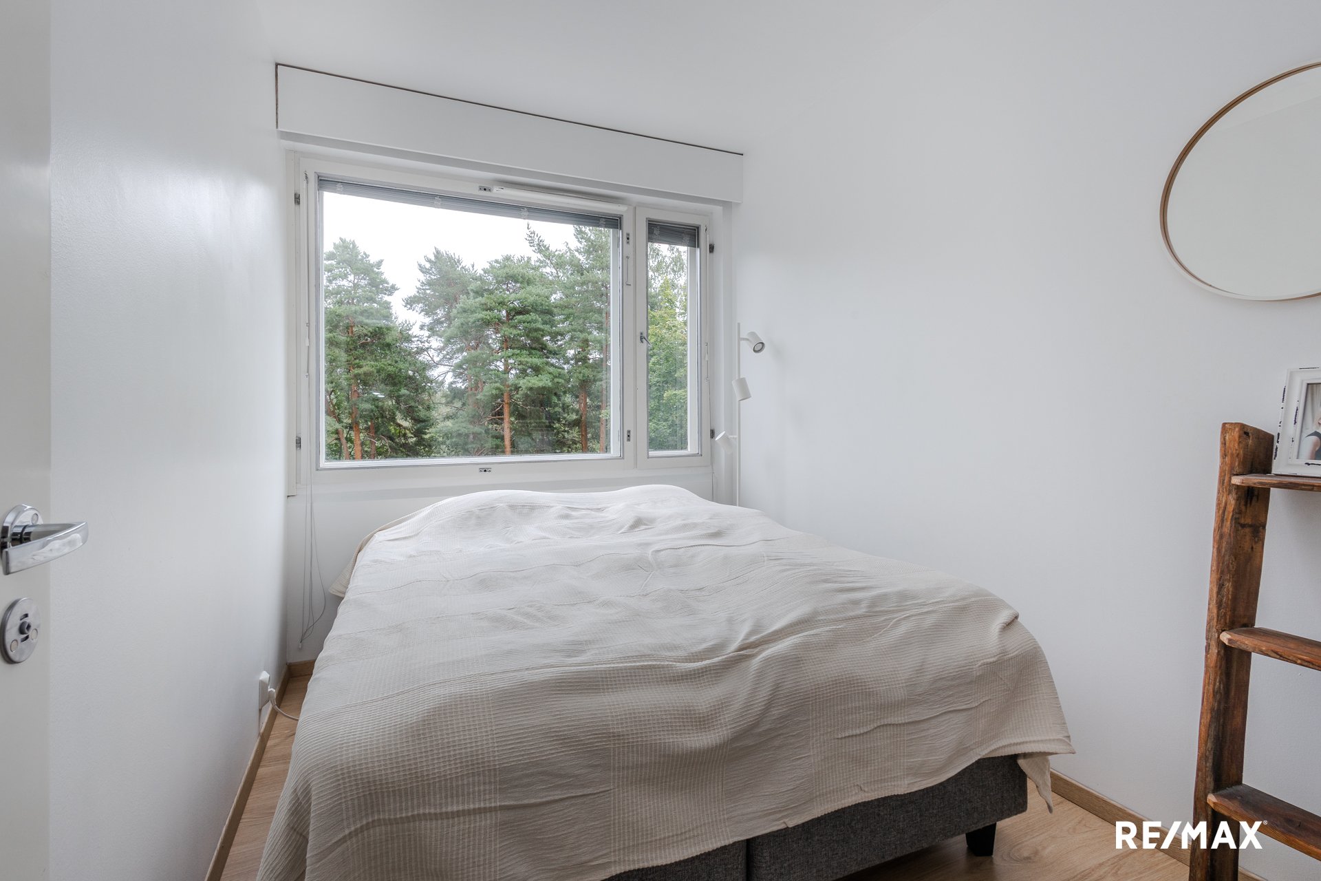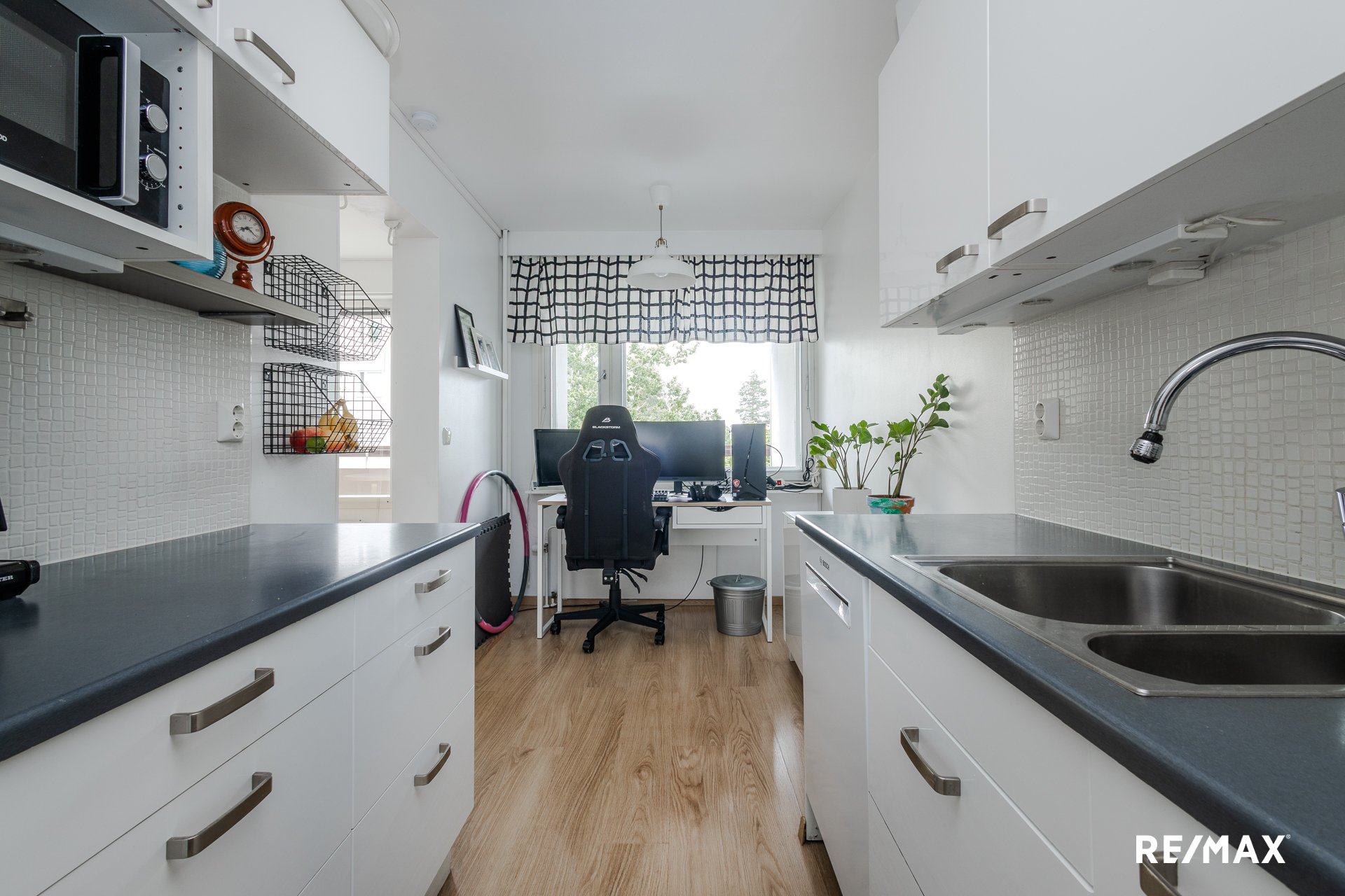 Tähän kotiin astuessa vastassa on luonnonvaloa tulviva avara olohuone. Siitä on kulku suurelle parvekkeelle, jossa on mukava nauttia iltapäivän auringosta työpäivän jälkeen. Vaaleansävyiseen keittiöön mahtuu hyvin ruokailuryhmä ja siitä on näkymä asunnon parvekkeelle. Makuuhuoneista toisessa on koko huoneen levyinen kaapisto ja säilytystilaa löytyy lisää erillisestä vaatehuoneesta.