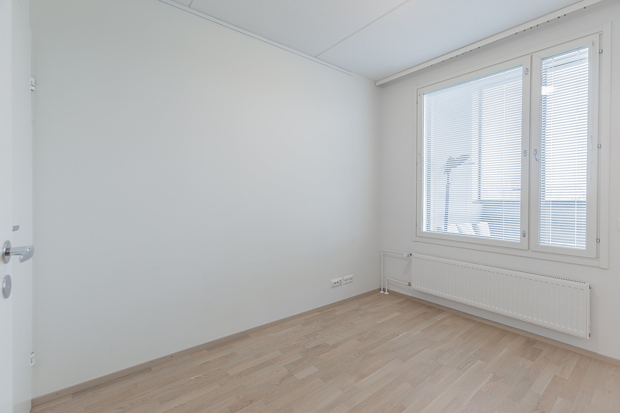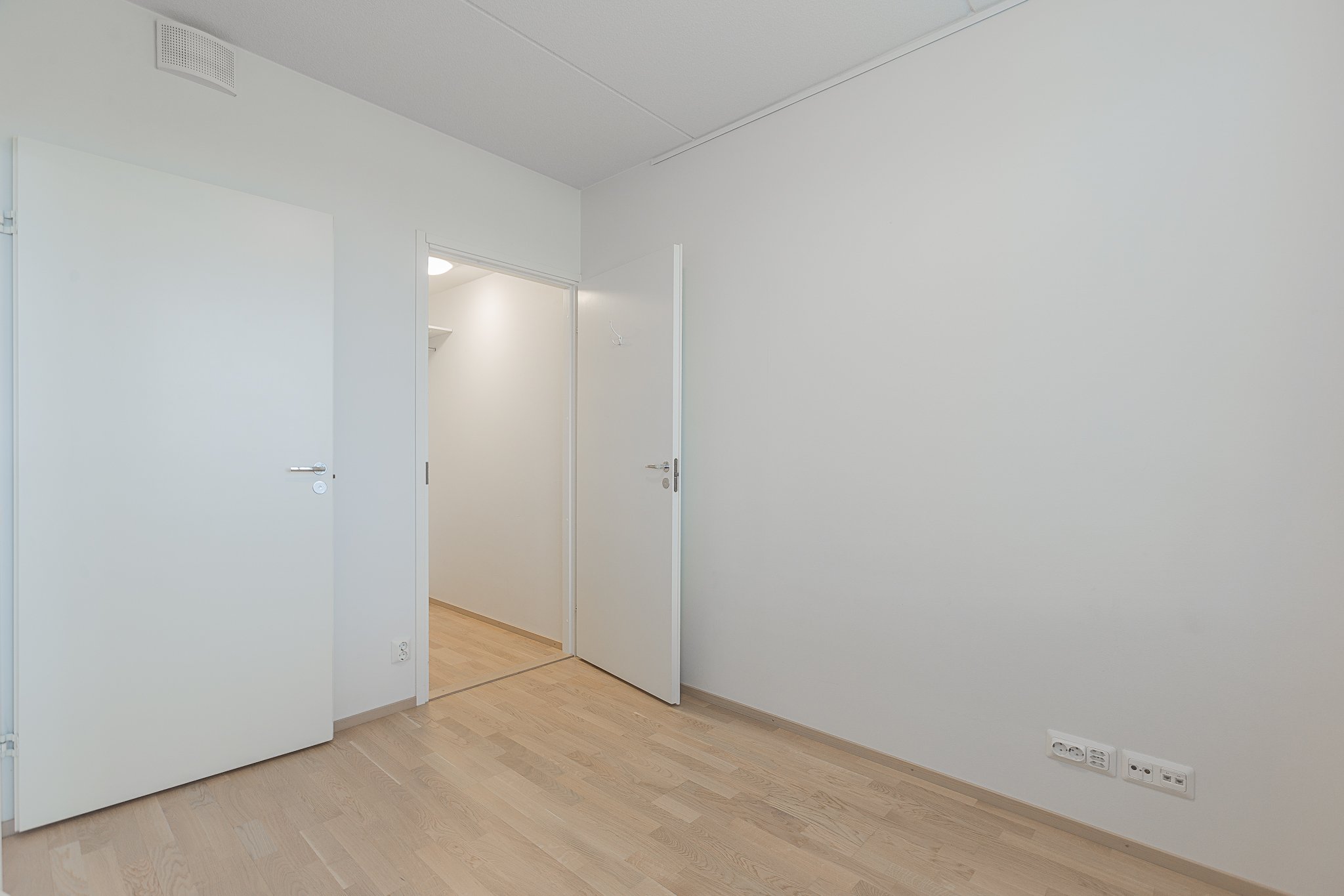 Makuuhuoneessa on liukuovi ja oma vaatehuone, joka tuo runsaasti säilytystilaa ja viimeistelee toimivan pohjaratkaisun.